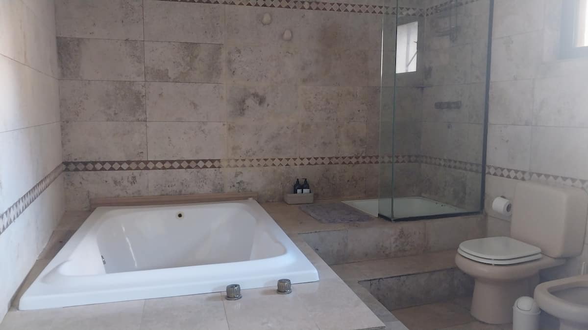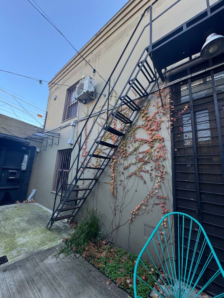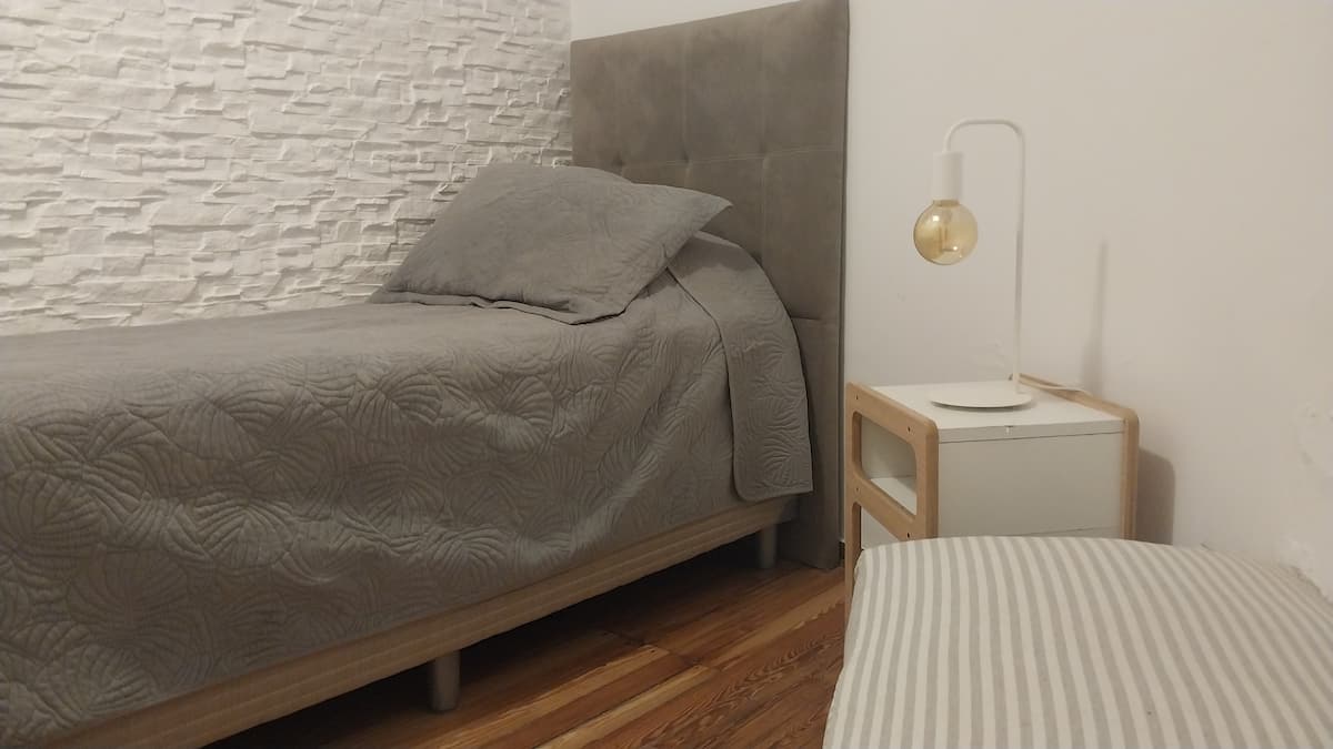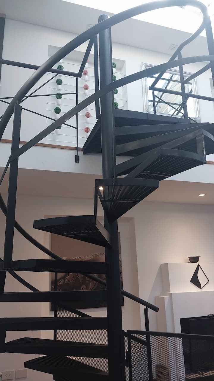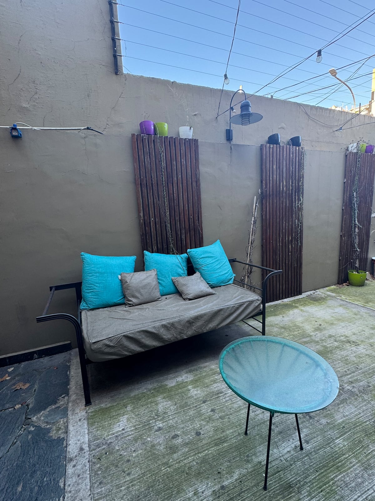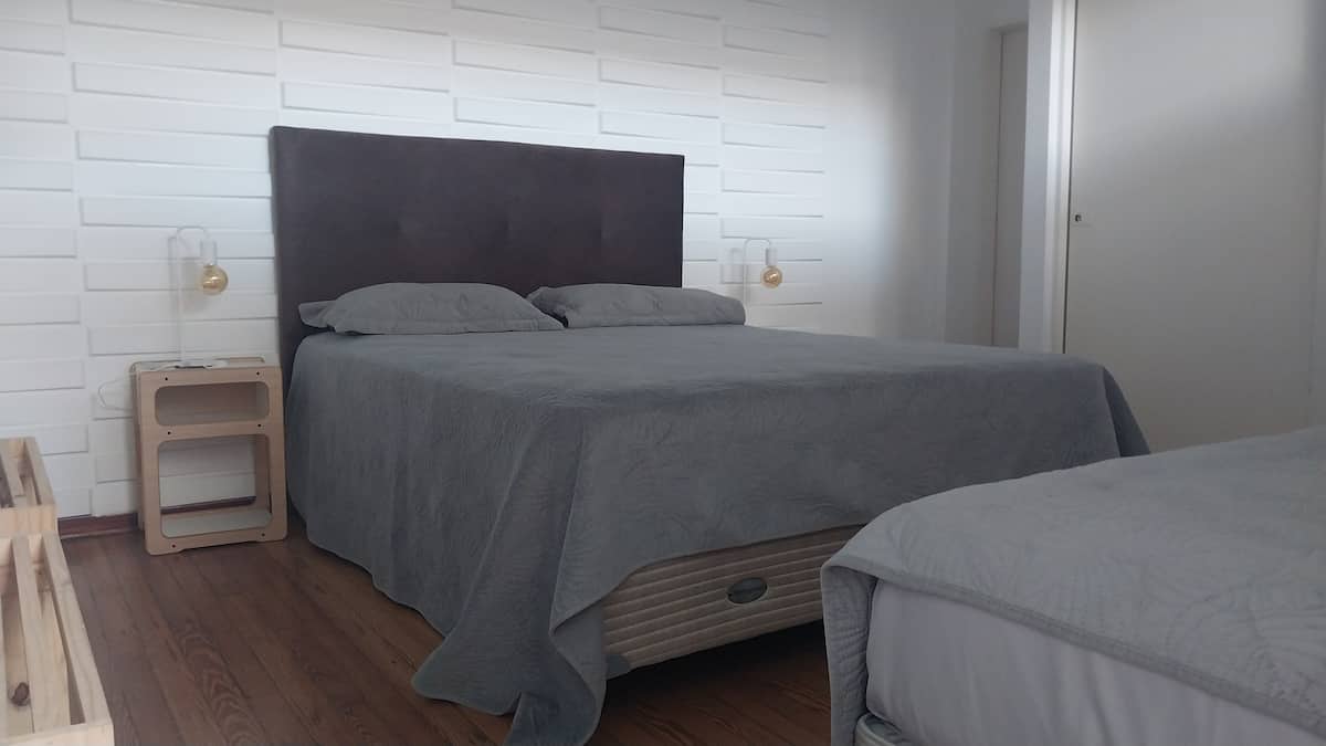 House-style apartment in Palermo Soho for up to 12 people, with a ground-floor patio and a covered grill. It includes a full kitchen with oven, microwave, Nespresso coffee maker, toaster, blender, and tableware, plus a living/dining room with air conditioning and a smart TV with cable. There are 4 bedrooms distributed across the ground floor, a first-floor level reached by stairs, and an independent annex accessed from the patio by a steep staircase; the annex is not suitable for people with red