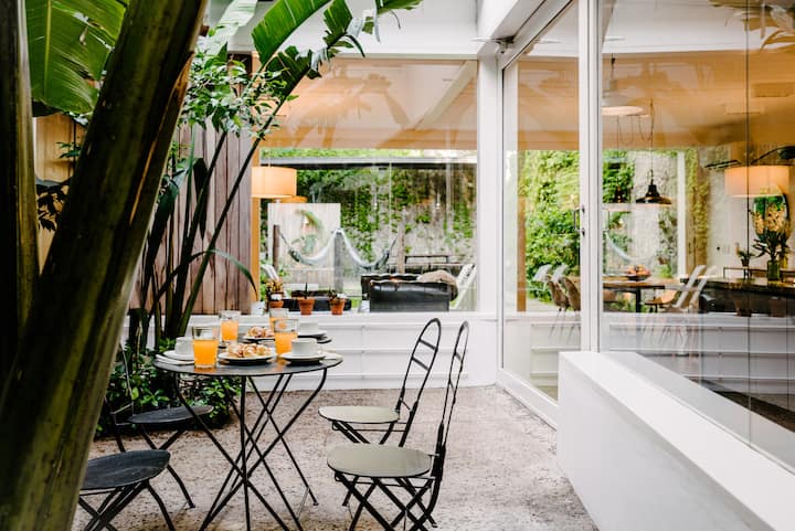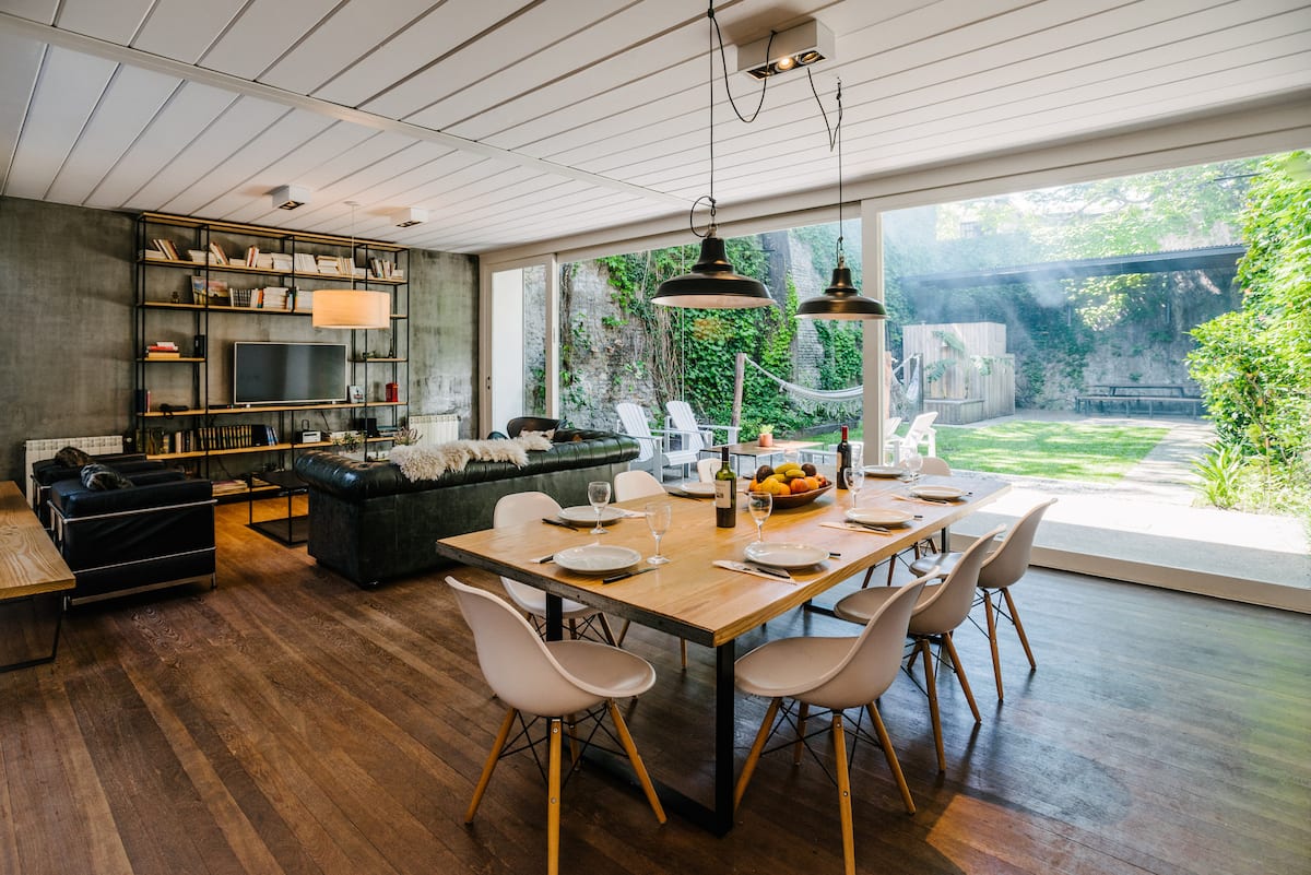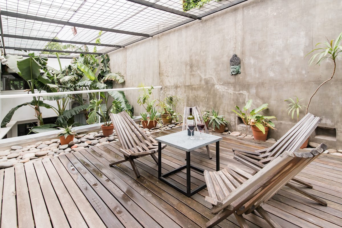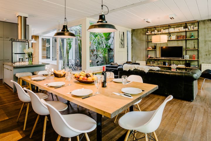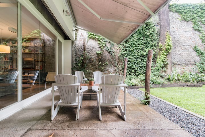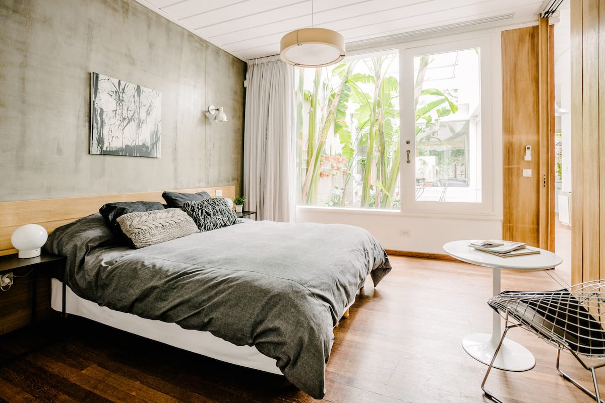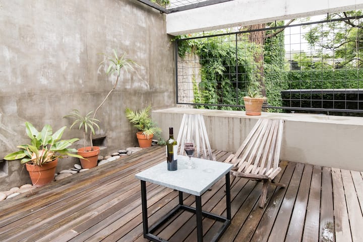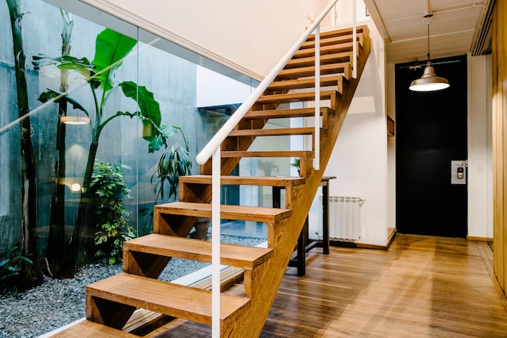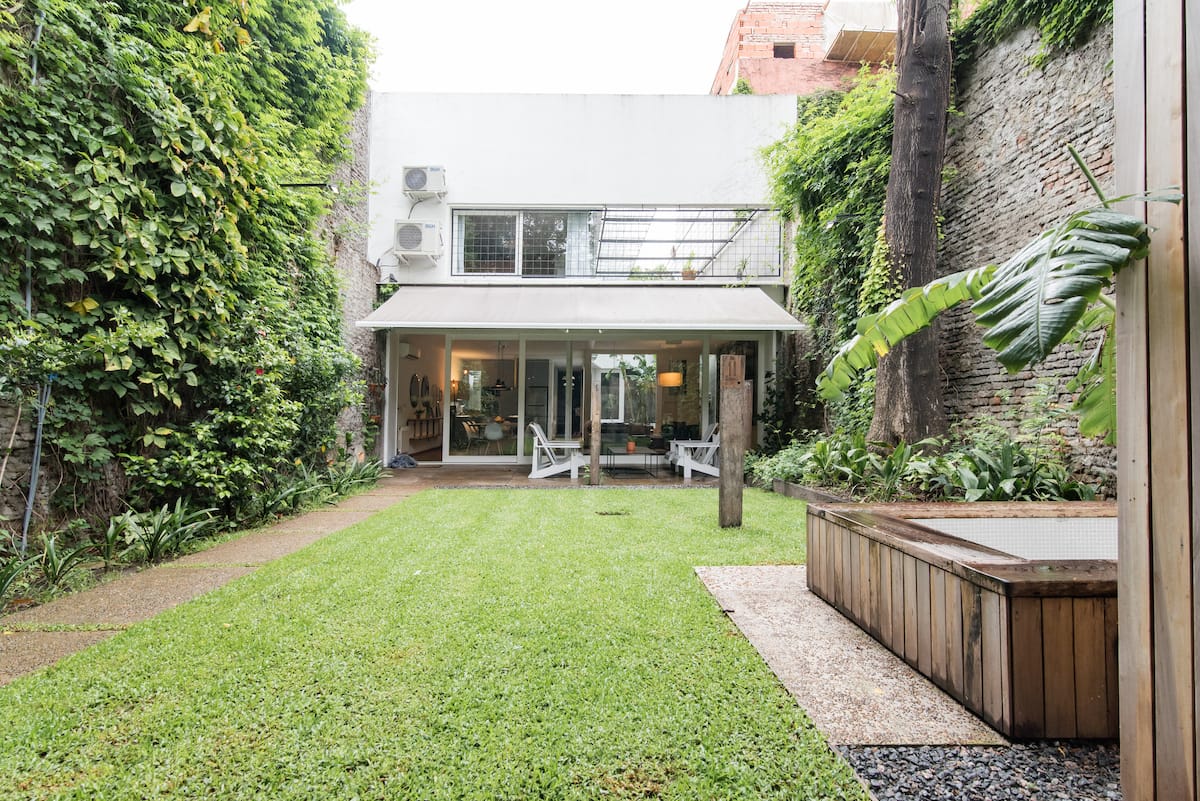 Two-storey apartment house in Palermo with 4 bedrooms and a private garden. The ground floor has a living room, kitchen-dining room with a patio and garden view, plus a barbacue area and mini pool. A suite with a king-size bed is on the first floor, along with laundry and a garage. The second floor includes a master bedroom with king-size bed, an en-suite bathroom with jacuzzi and access to a terrace, two guest bedrooms sharing a bathroom, and a second, more private living room area.