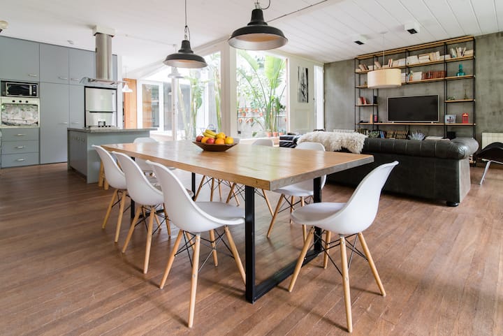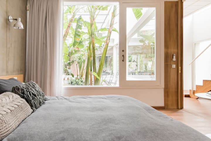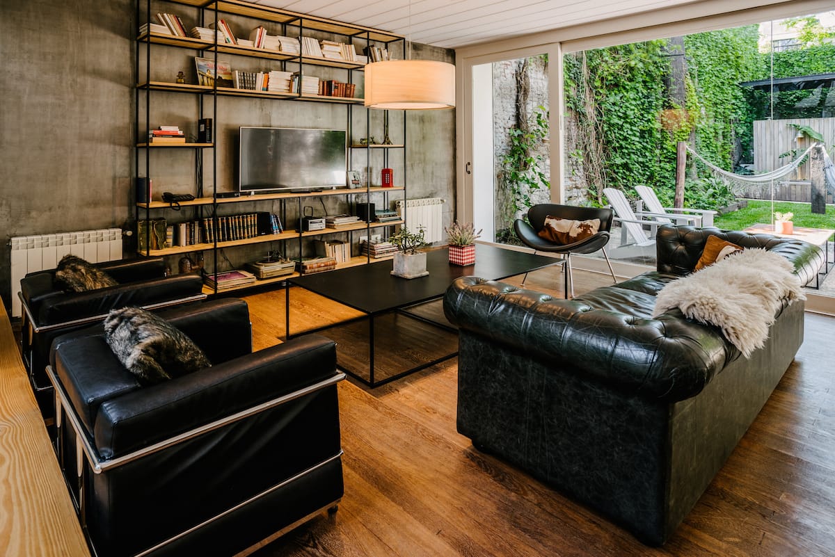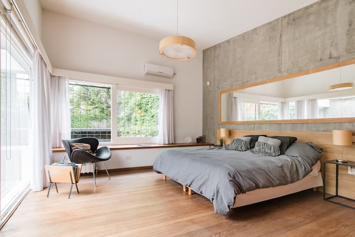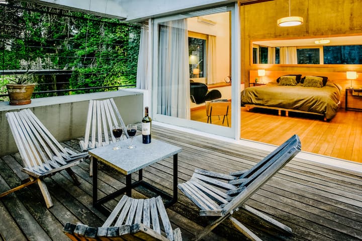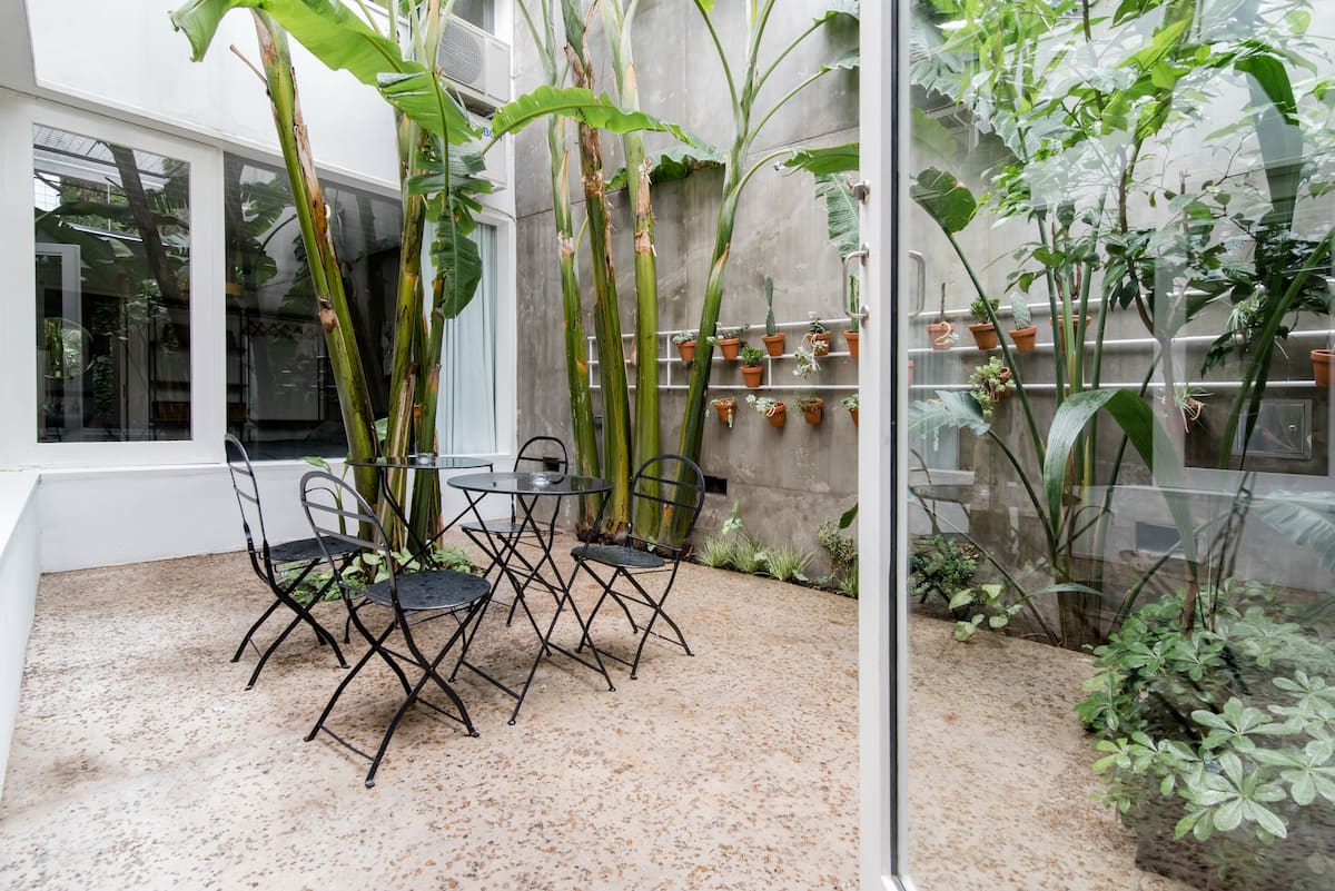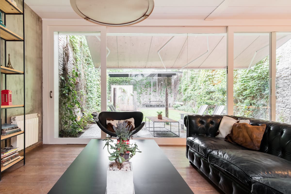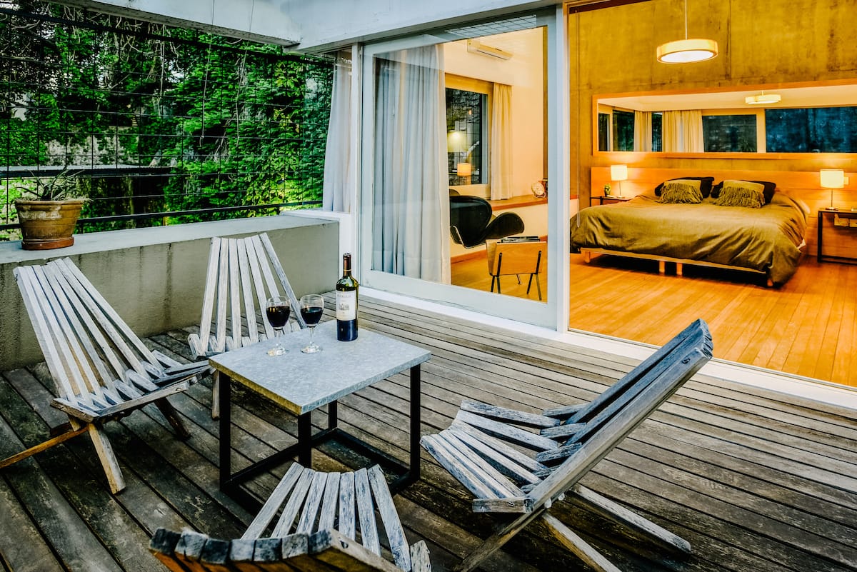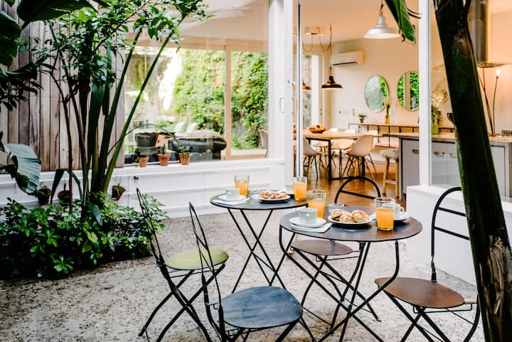 Two-storey apartment house in Palermo with 4 bedrooms and a private garden. The ground floor has a living room, kitchen-dining room with a patio and garden view, plus a barbacue area and mini pool. A suite with a king-size bed is on the first floor, along with laundry and a garage. The second floor includes a master bedroom with king-size bed, an en-suite bathroom with jacuzzi and access to a terrace, two guest bedrooms sharing a bathroom, and a second, more private living room area.