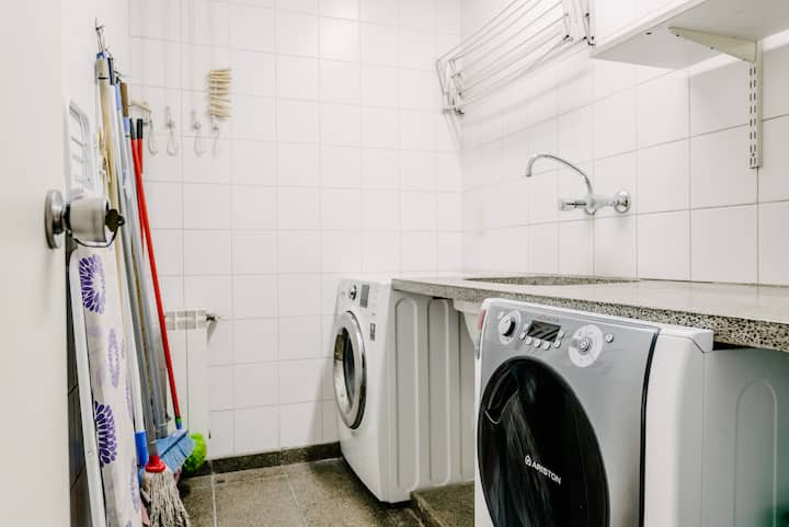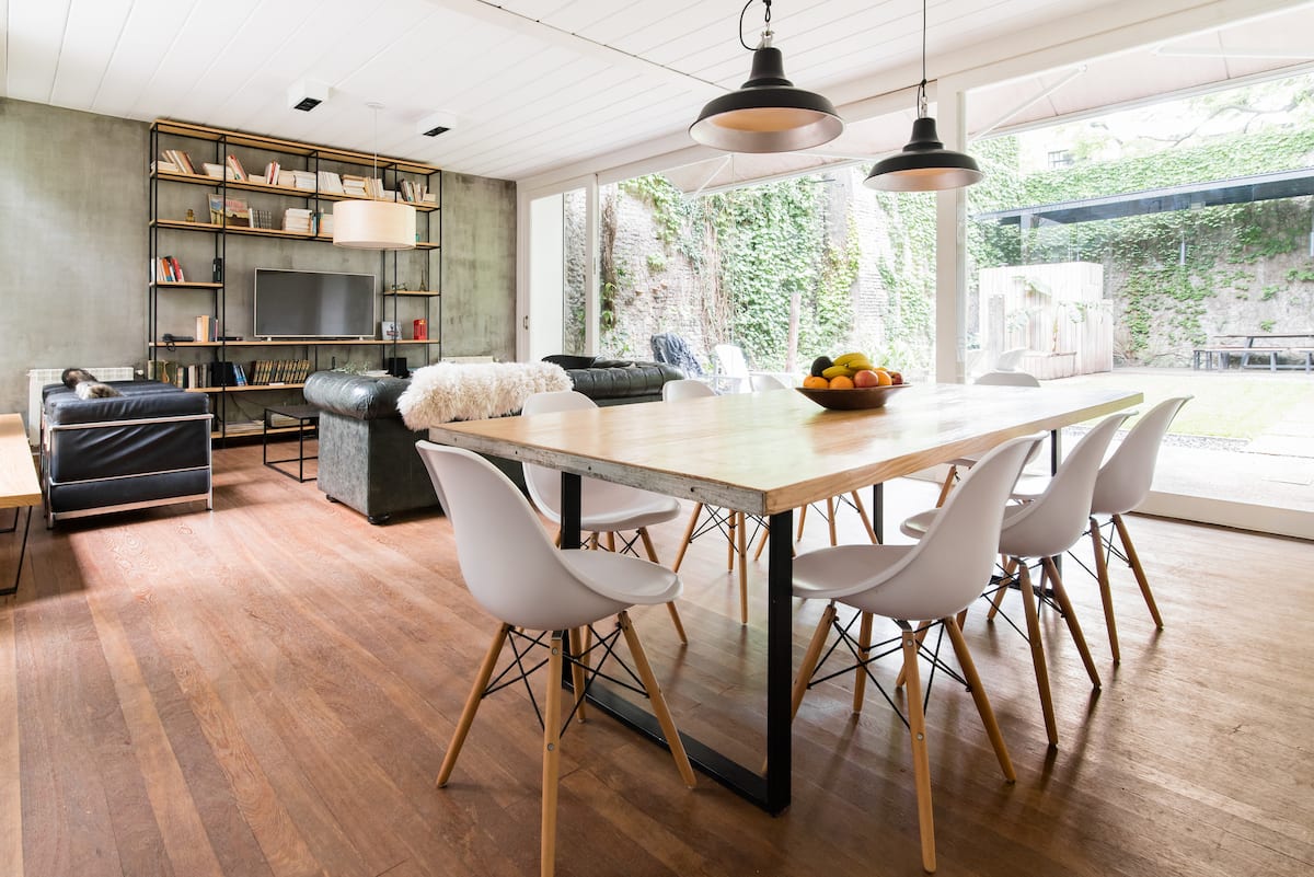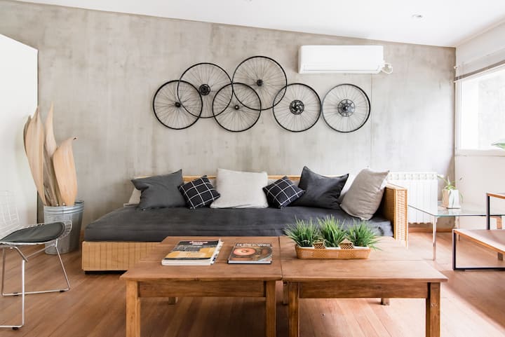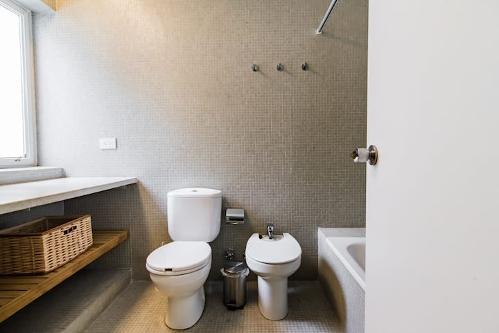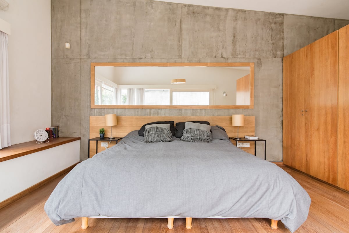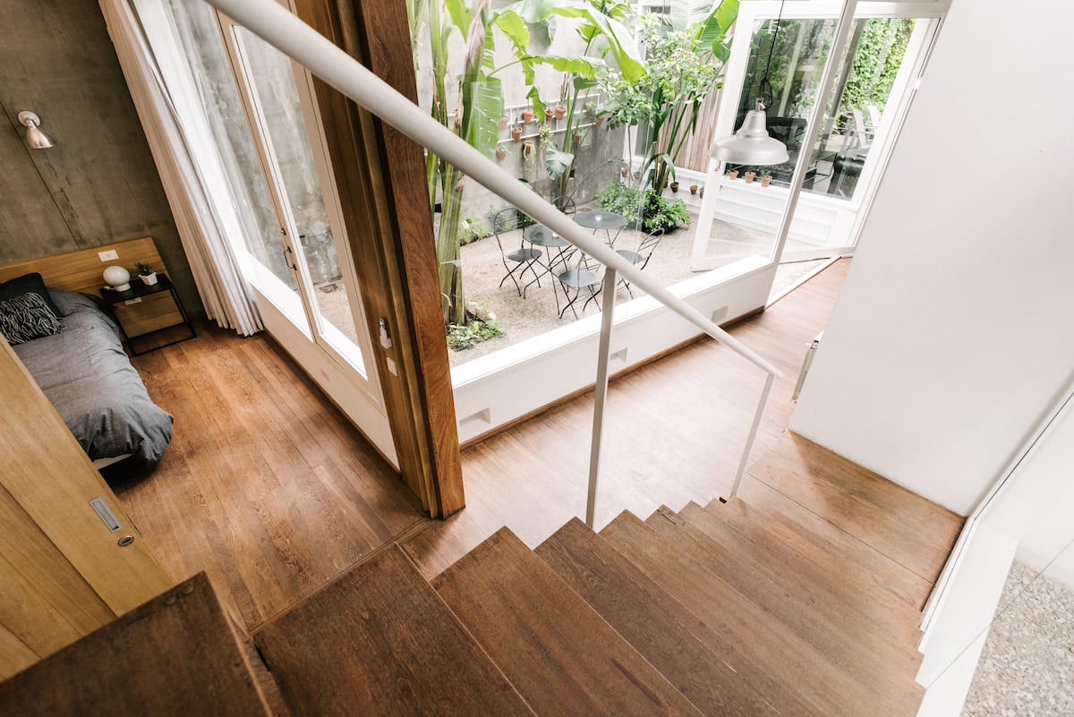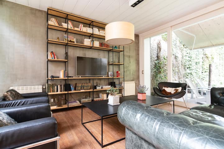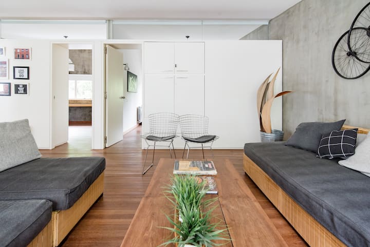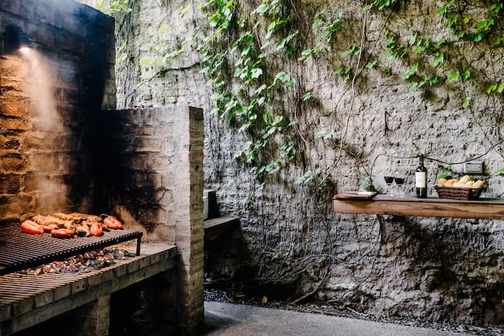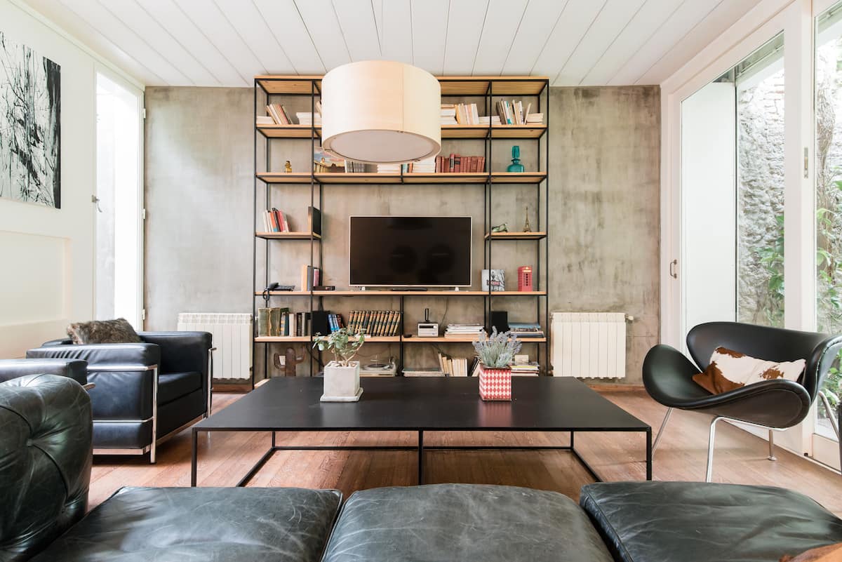 Two-storey apartment house in Palermo with 4 bedrooms and a private garden. The ground floor has a living room, kitchen-dining room with a patio and garden view, plus a barbacue area and mini pool. A suite with a king-size bed is on the first floor, along with laundry and a garage. The second floor includes a master bedroom with king-size bed, an en-suite bathroom with jacuzzi and access to a terrace, two guest bedrooms sharing a bathroom, and a second, more private living room area.
