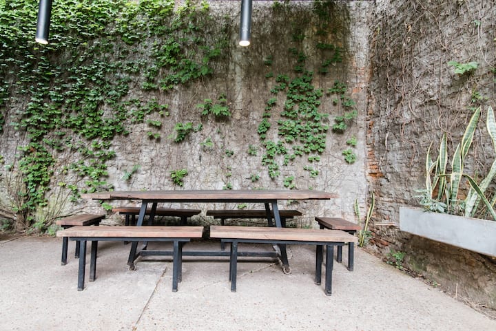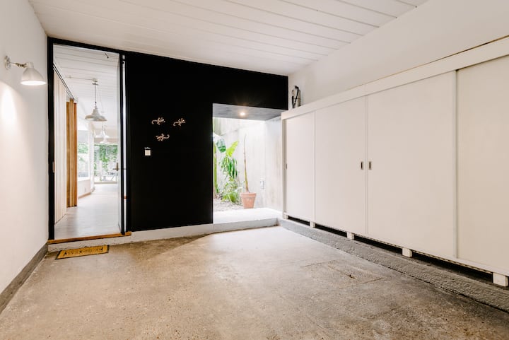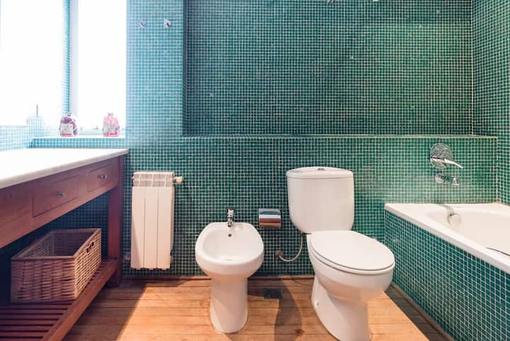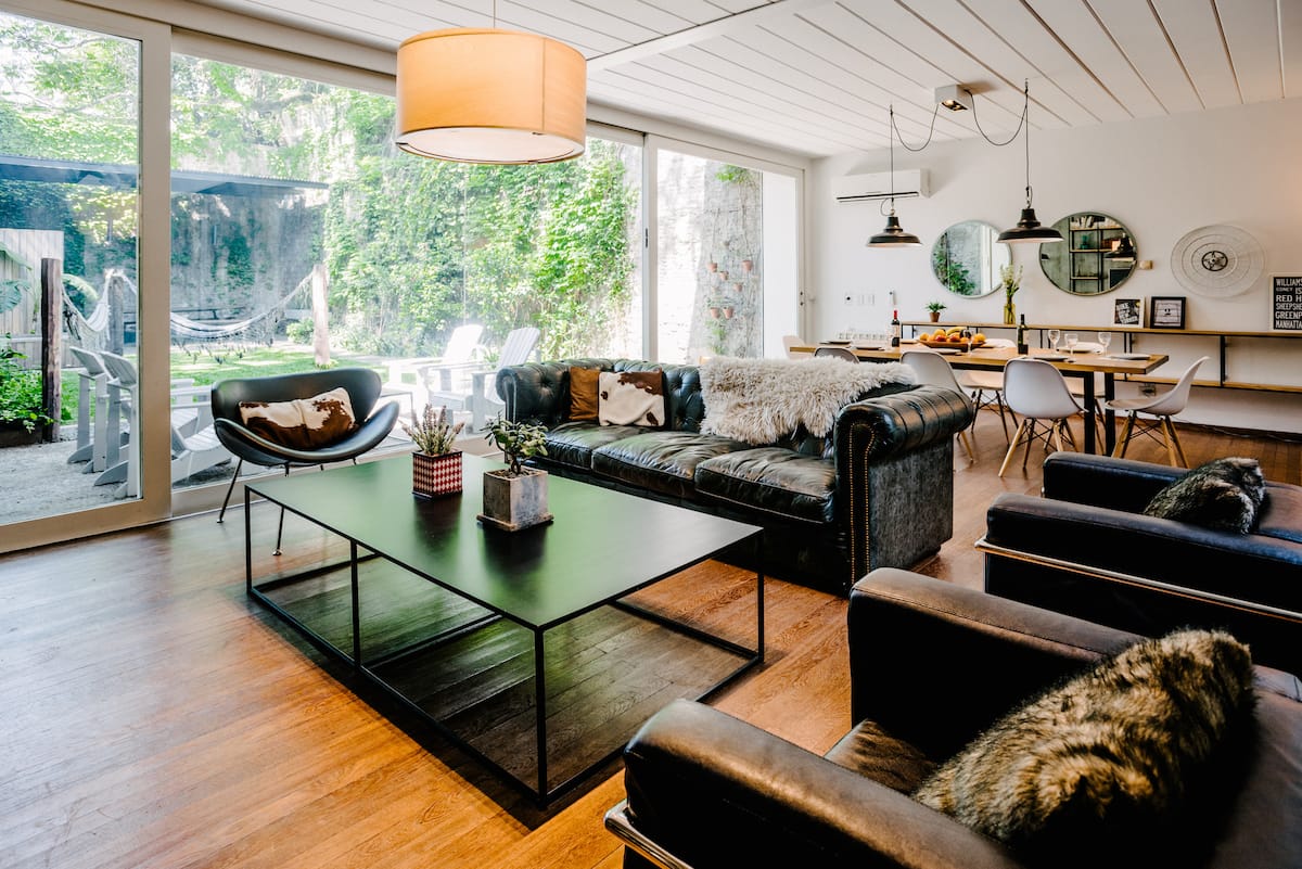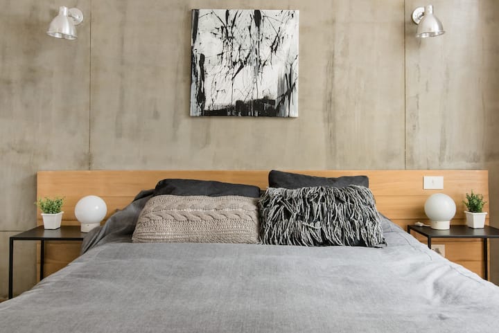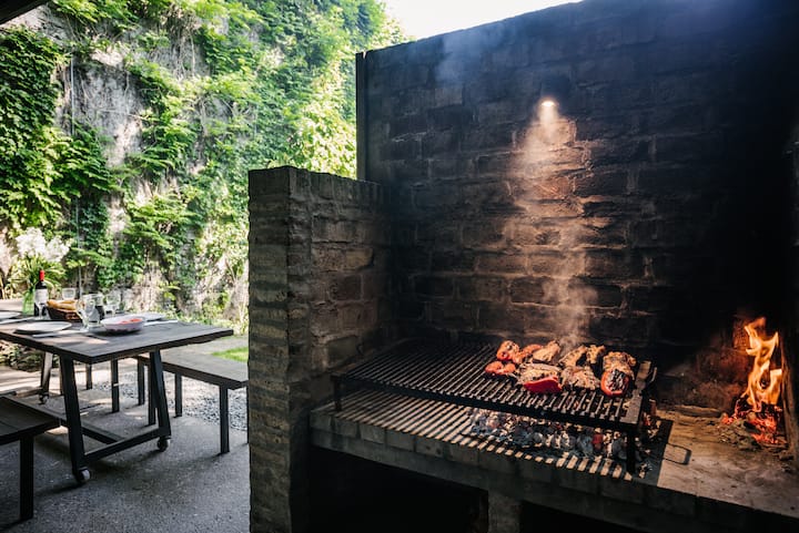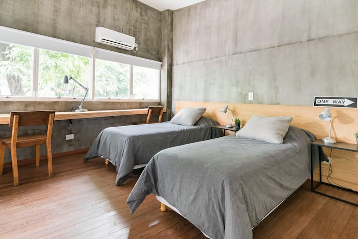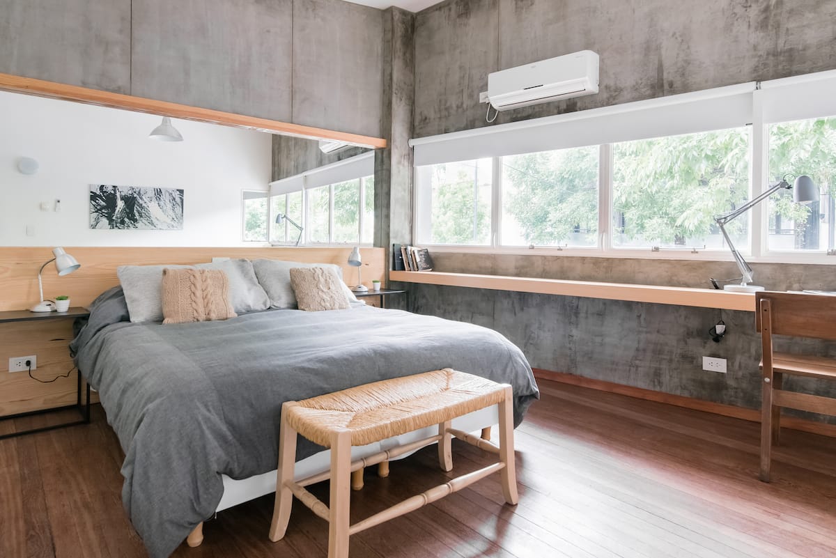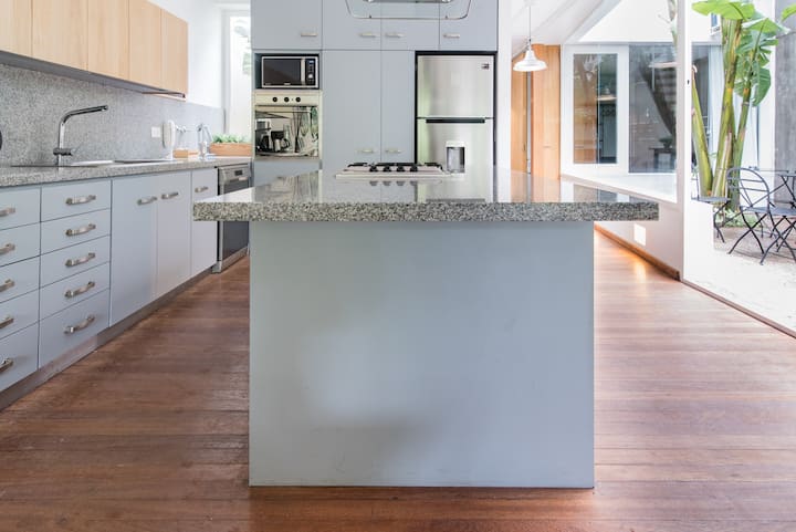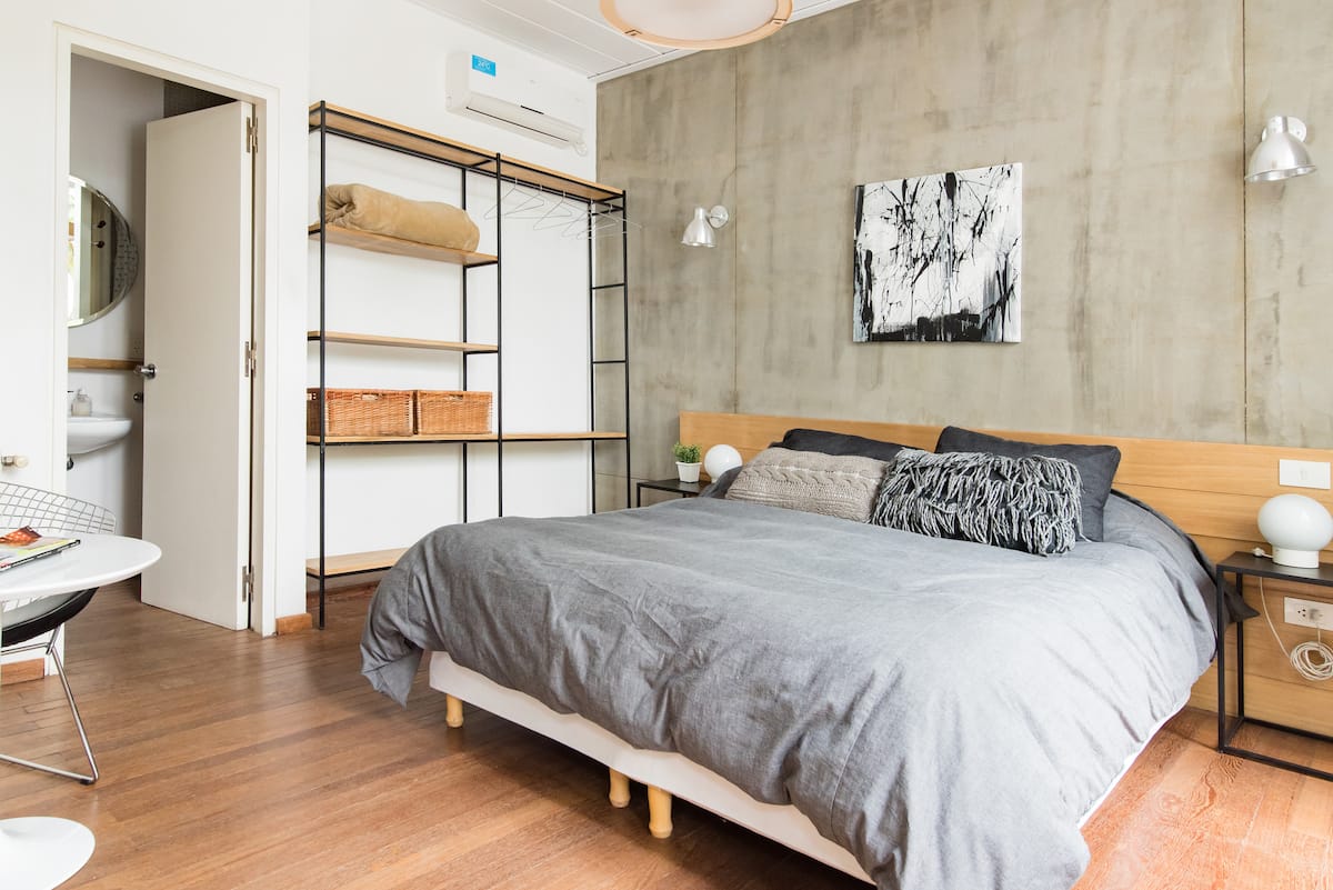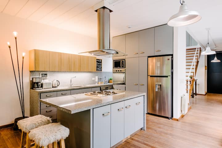 Two-storey apartment house in Palermo with 4 bedrooms and a private garden. The ground floor has a living room, kitchen-dining room with a patio and garden view, plus a barbacue area and mini pool. A suite with a king-size bed is on the first floor, along with laundry and a garage. The second floor includes a master bedroom with king-size bed, an en-suite bathroom with jacuzzi and access to a terrace, two guest bedrooms sharing a bathroom, and a second, more private living room area.