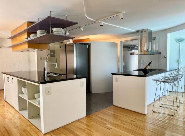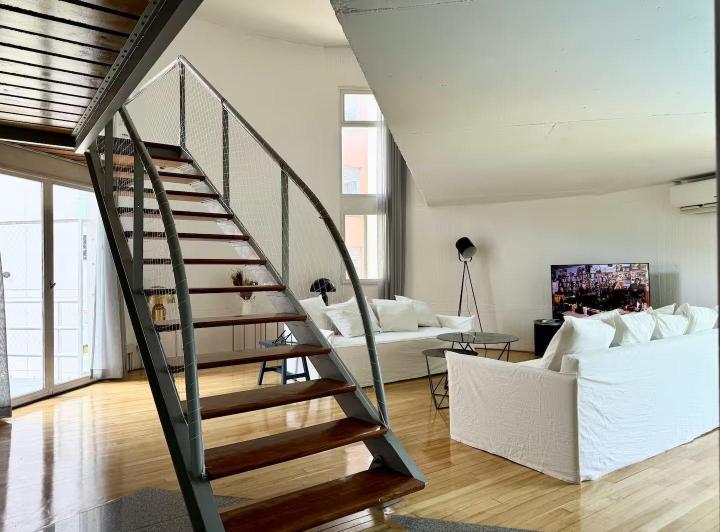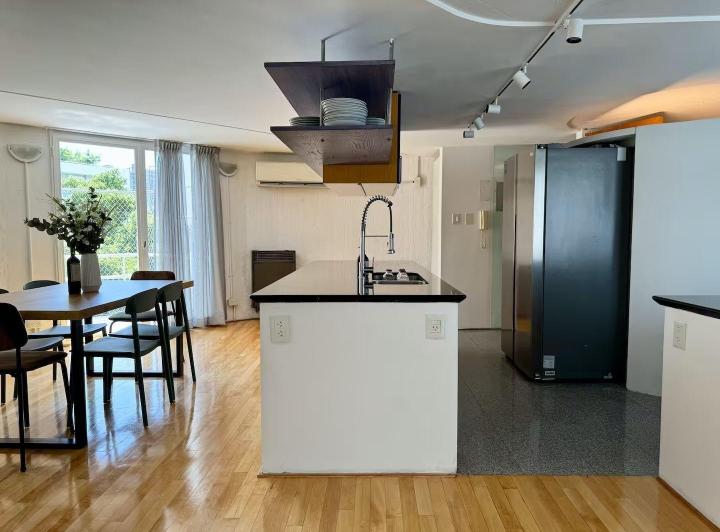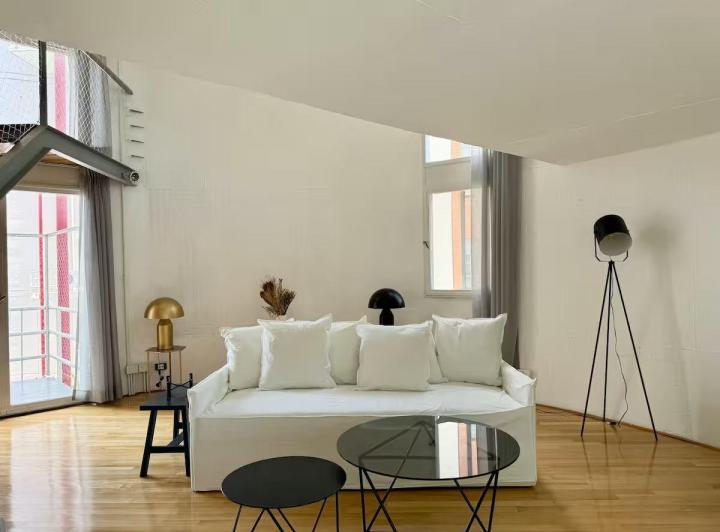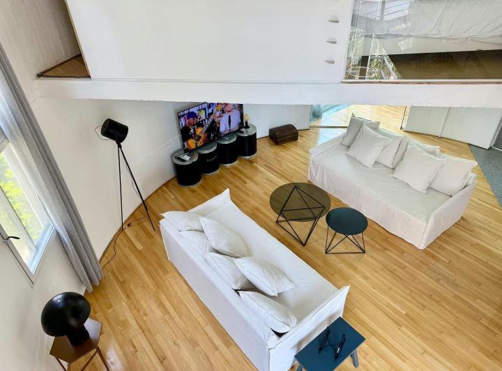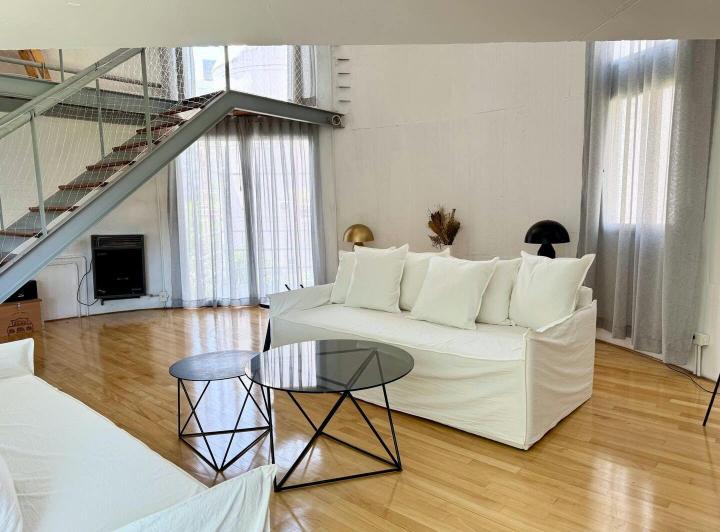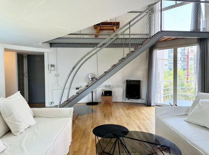 Duplex apartment of 150 m² in Palermo Hollywood, furnished and recently refurbished. Street-facing? The listing describes two balconies with views of the garden and the pool, plus a ground floor with a full kitchen with dining area, a large living room with sofa and TV, a toilet, a laundry area, and two balconies. The upper floor has a main bedroom with a built-in wardrobe, a second bedroom with a desk and closet, an additional bedroom with an open wardrobe, and a full bathroom. The complex incl
