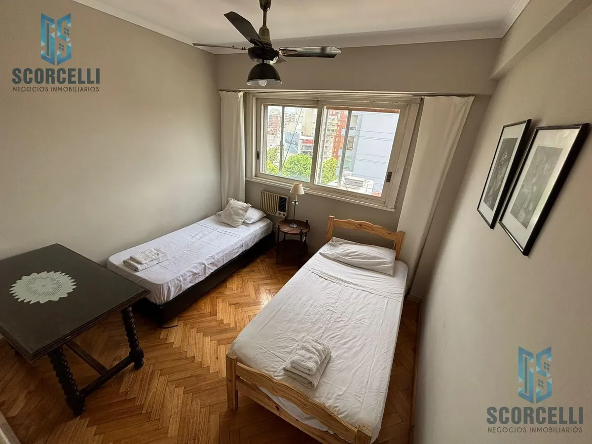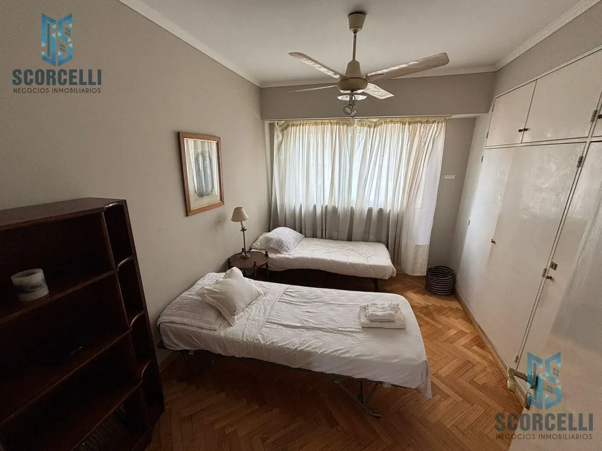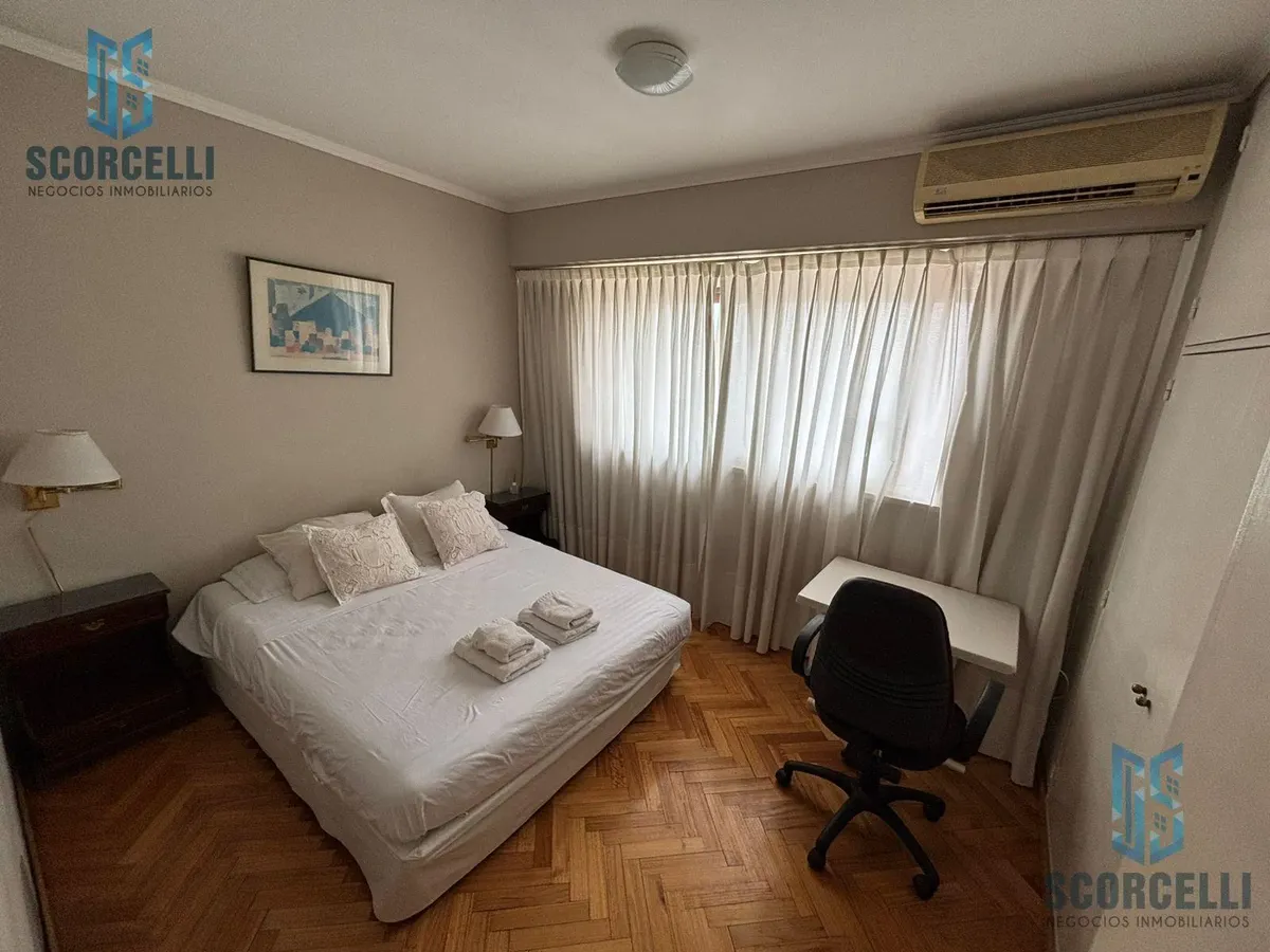 Four-bedroom apartment for up to 8 people in Las Cañitas, on a high floor with a terrace balcony and partial views of the Río de la Plata. Covered area is 180 m² with 10 m² uncovered. Fully furnished and equipped, with air conditioning in the living room and in the first bedroom, ceiling fans in all bedrooms, and two complete bathrooms. The kitchen has central hot water, a 4-burner stove with oven, dishwasher, microwave, coffee maker, toaster, tableware, and a refrigerator; there is a laundry ar