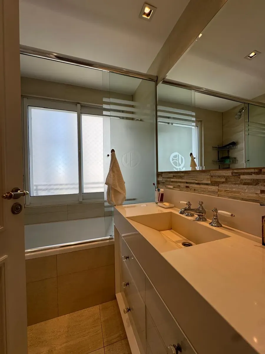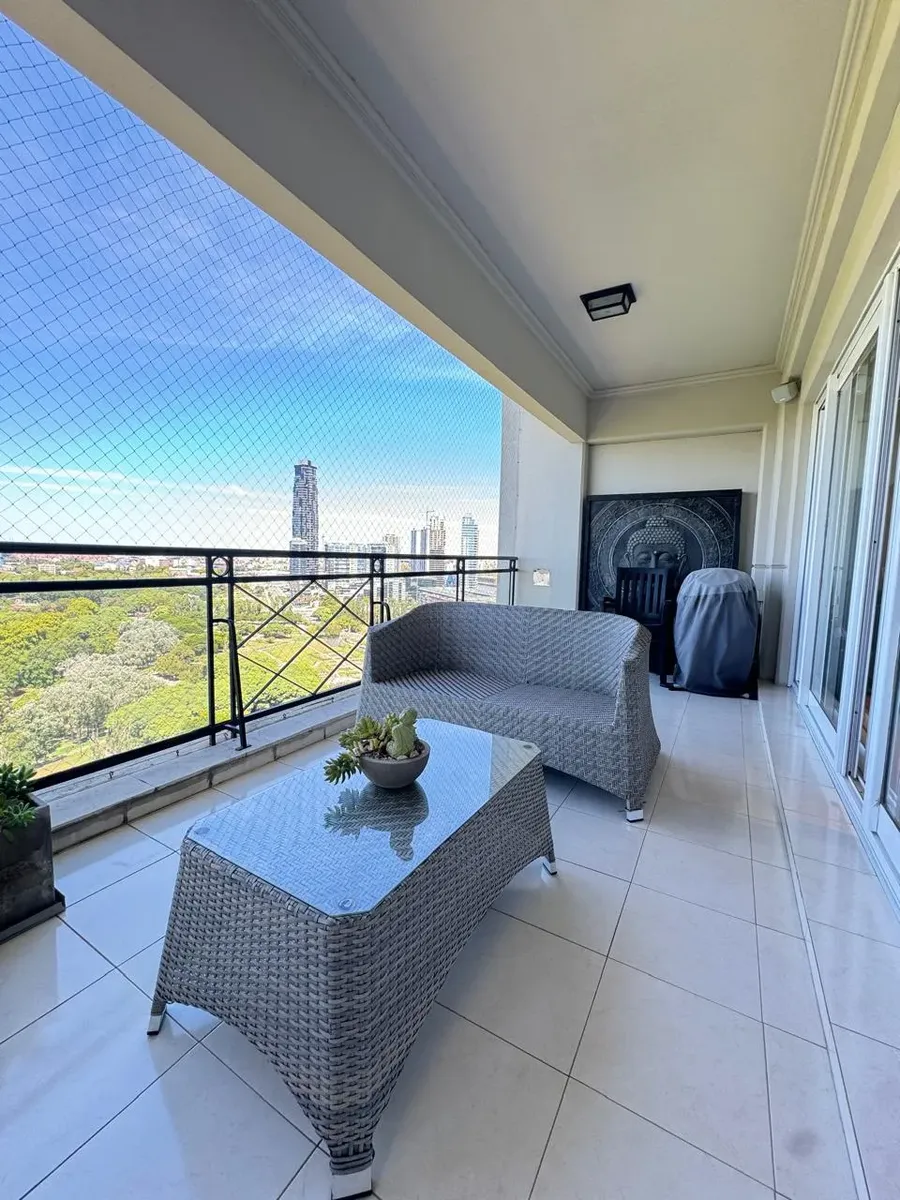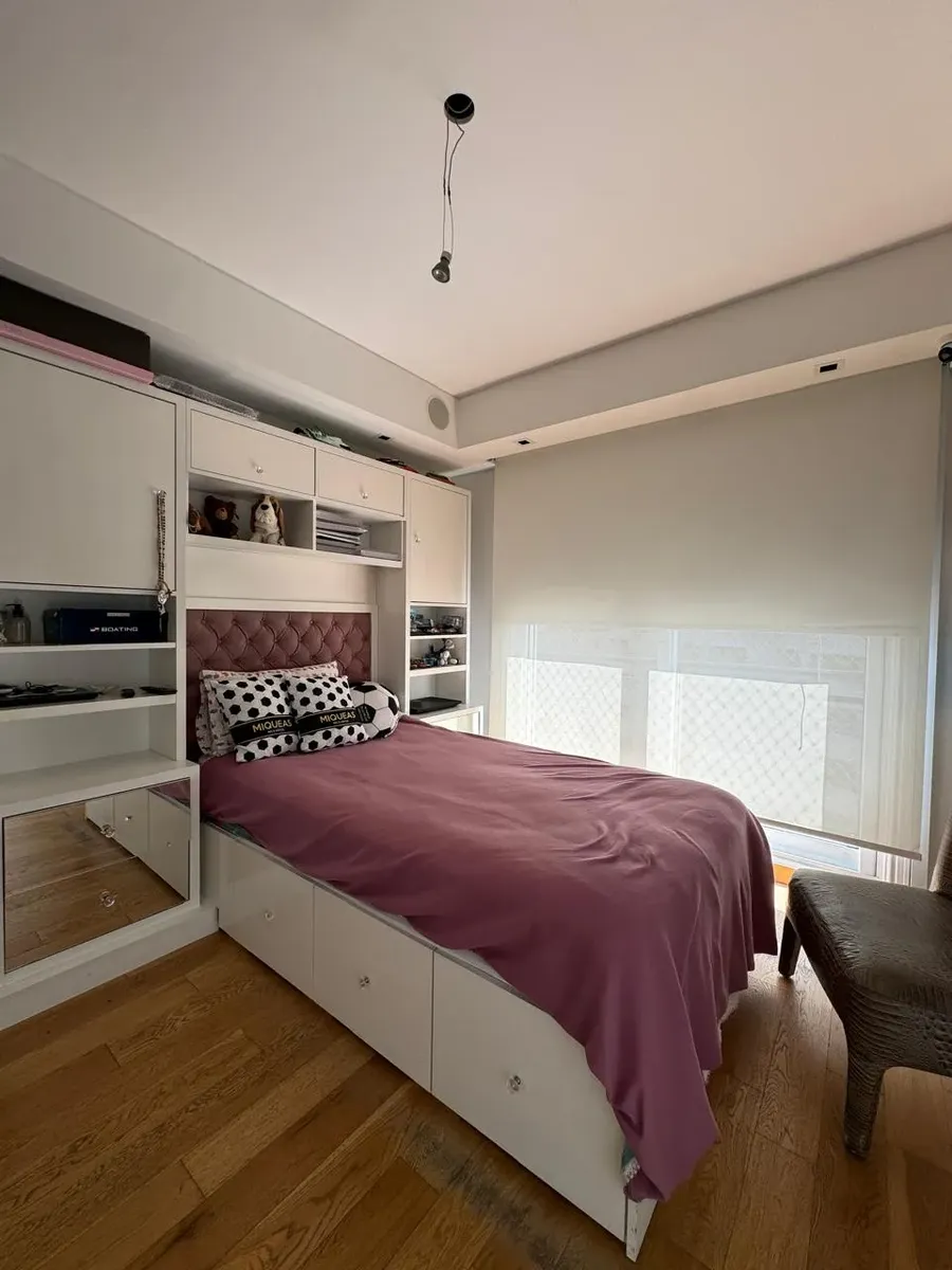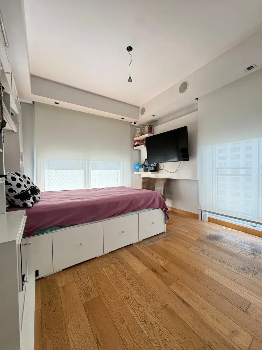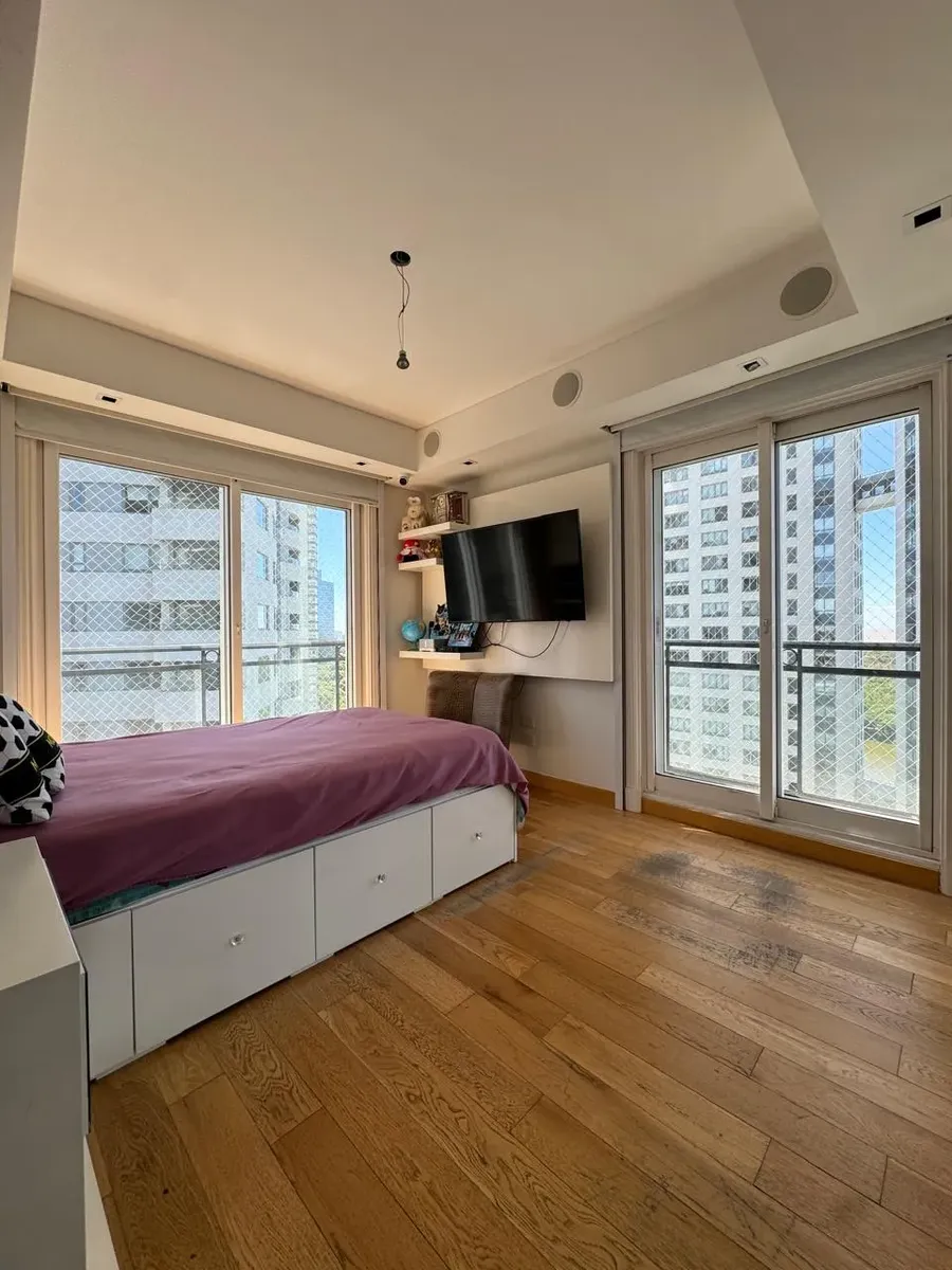 Apartment of 187 m² in Puerto Madero, with 3 bedrooms plus a service room and 4 bathrooms in total. Living-dining area with large windows, separate kitchen with built-in fittings, and a dining area connected to the social space through windows. Bedrooms have exterior windows and wooden flooring; the main bedroom includes a dressing area. The unit has a balcony with open views. The building allows pets and includes a covered and outdoor pool, an equipped gym, and marble-finished entrance areas wi