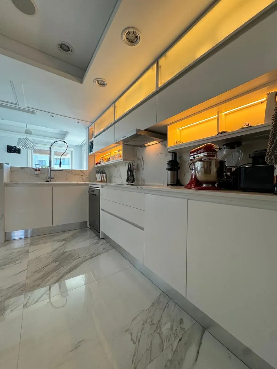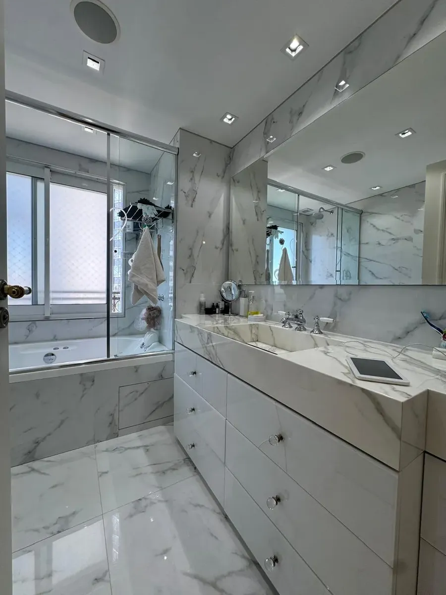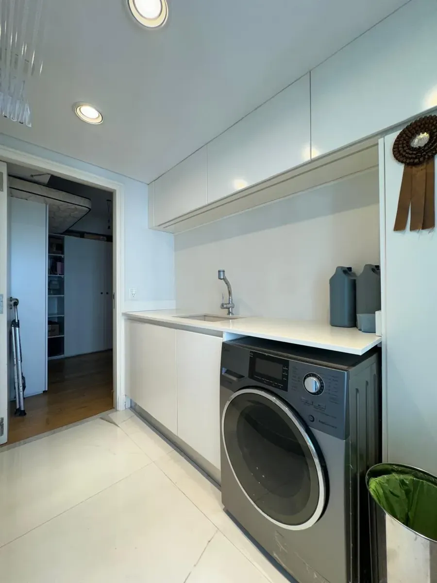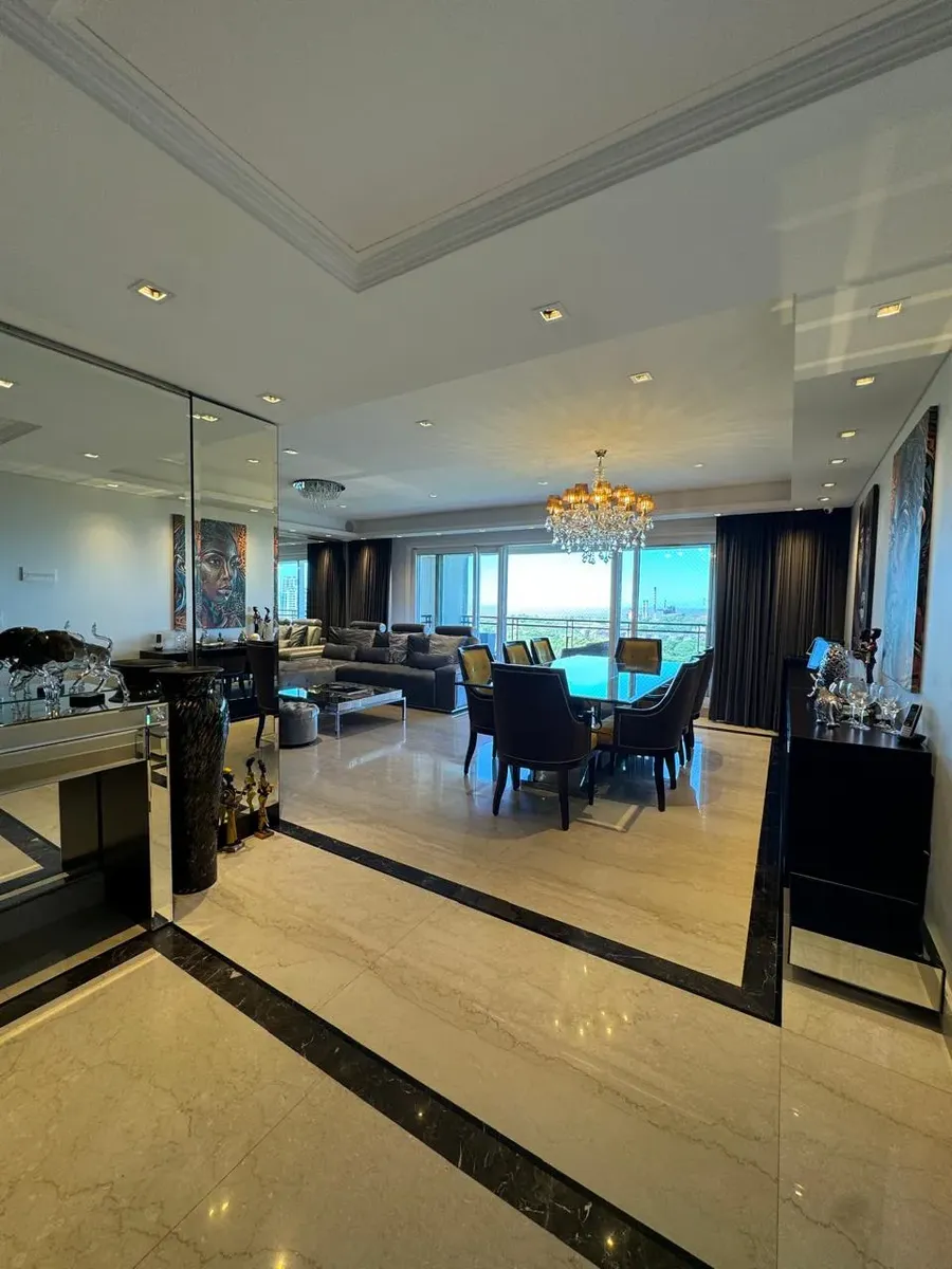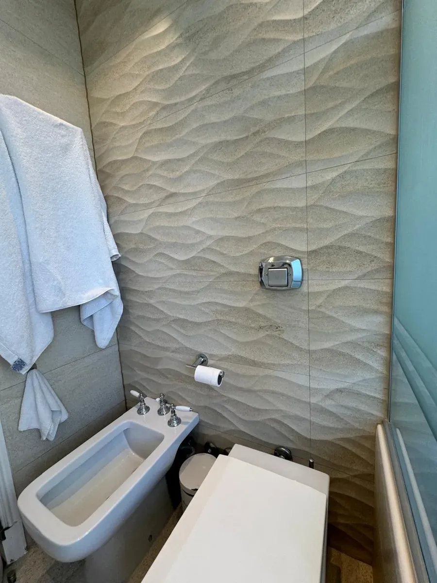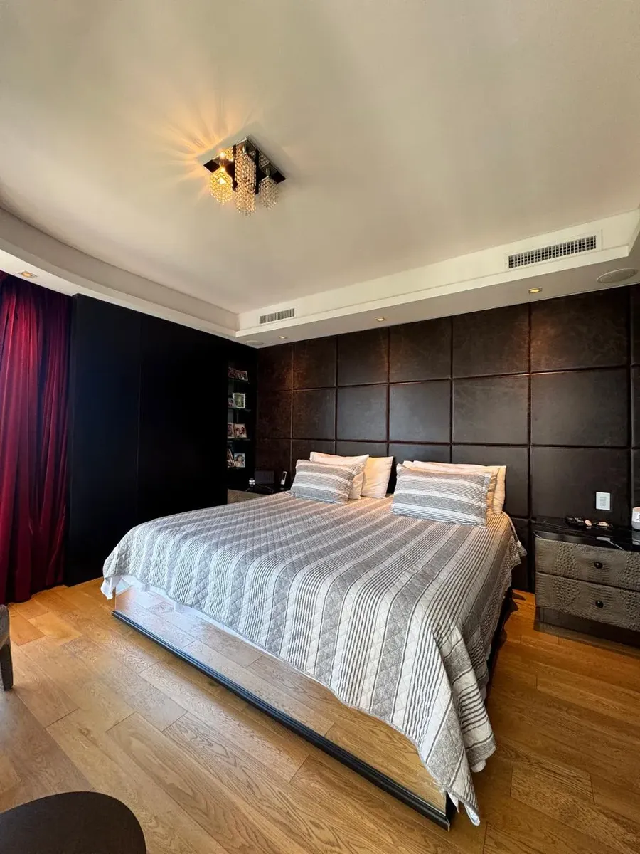 Apartment of 187 m² in Puerto Madero, with 3 bedrooms plus a service room and 4 bathrooms in total. Living-dining area with large windows, separate kitchen with built-in fittings, and a dining area connected to the social space through windows. Bedrooms have exterior windows and wooden flooring; the main bedroom includes a dressing area. The unit has a balcony with open views. The building allows pets and includes a covered and outdoor pool, an equipped gym, and marble-finished entrance areas wi
