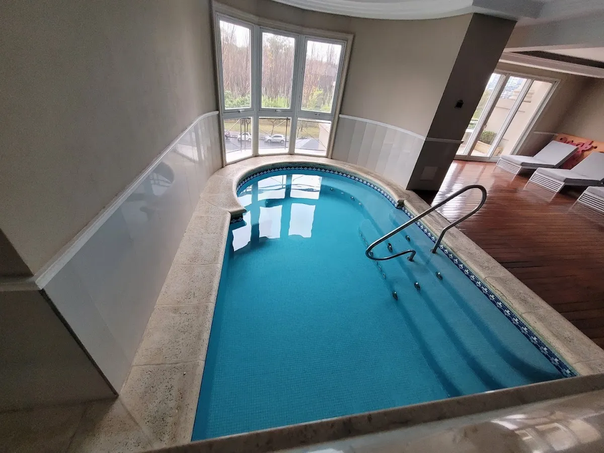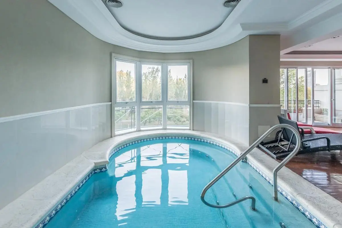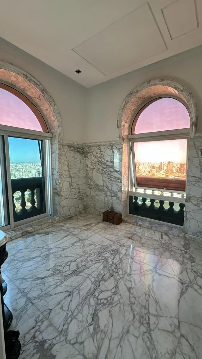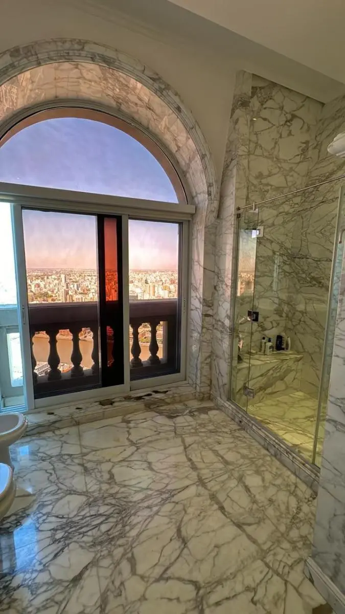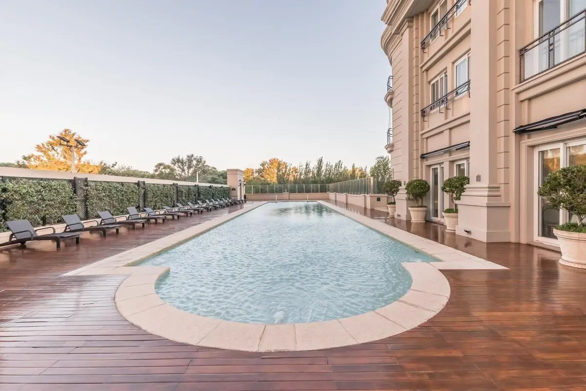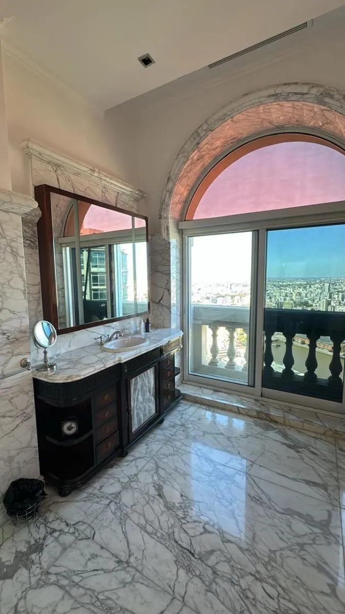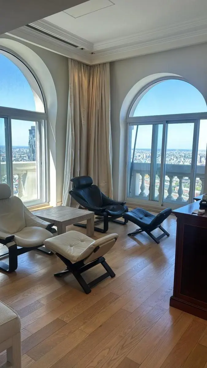 Duplex apartment in Chateau, Puerto Madero, arranged over two floors with a private lift and open views. Building amenities include a party room, communal room, music room, micro-cinema, bar lounge, tennis court, outdoor play area, and a fitness and gym room with an outdoor deck. Additional facilities include massage rooms, dry and wet saunas, a heated indoor pool with hydromassage, and an outdoor pool with a solarium.