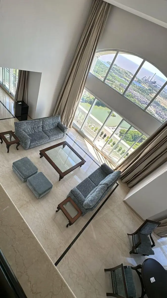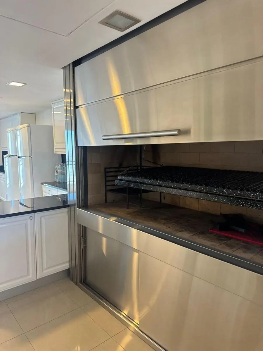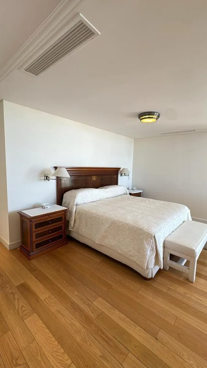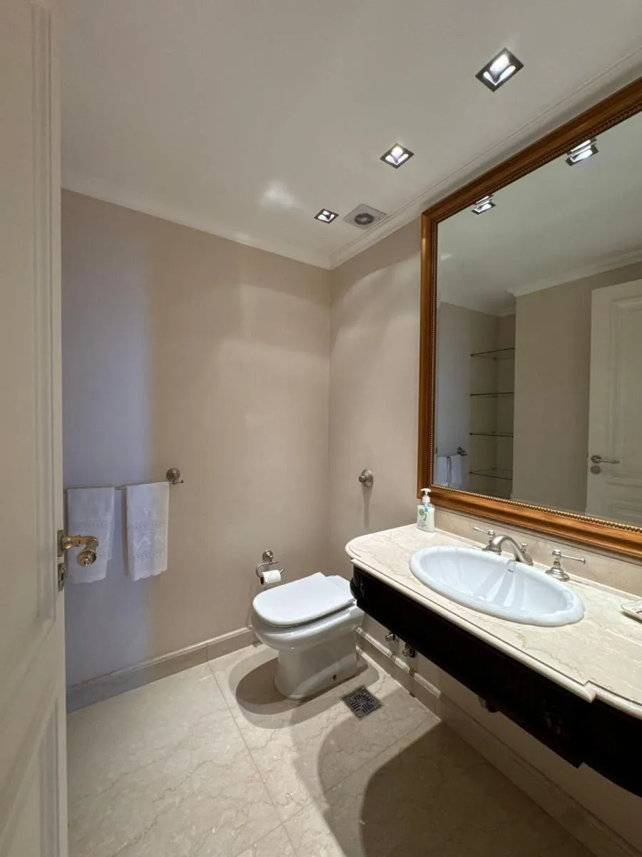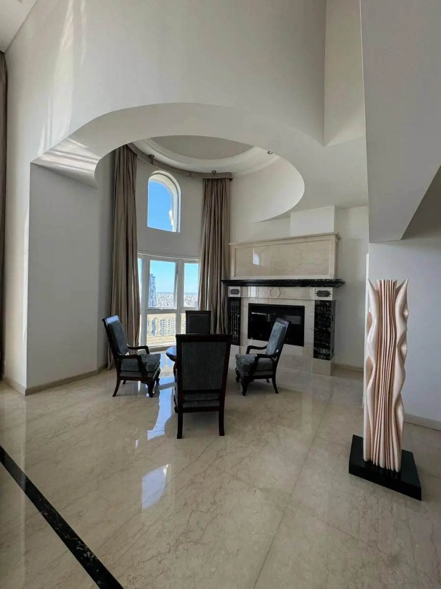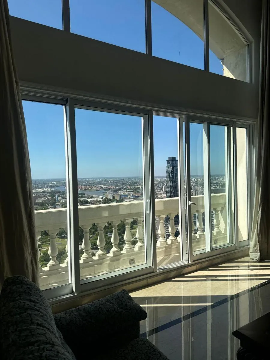 Duplex apartment in Chateau, Puerto Madero, arranged over two floors with a private lift and open views. Building amenities include a party room, communal room, music room, micro-cinema, bar lounge, tennis court, outdoor play area, and a fitness and gym room with an outdoor deck. Additional facilities include massage rooms, dry and wet saunas, a heated indoor pool with hydromassage, and an outdoor pool with a solarium.