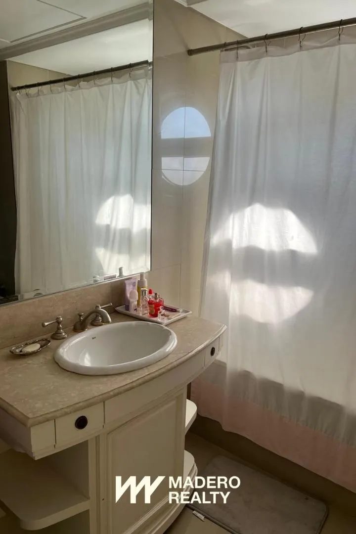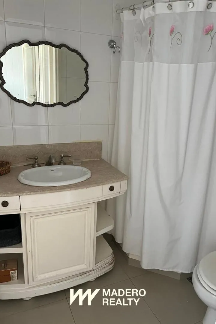 Furnished apartment in Puerto Madero with 4 bedrooms and 4 en-suite bathrooms plus 1 guest toilet, in a 350 m² unit. Includes a large living area, office, dining room, daily-meal dining area off a large kitchen, and a separate laundry area with service quarters. The listing includes 2 assigned parking spaces and access to a covered and semi-Olympic outdoor pool, event hall, bar/restaurant, tennis court, hairdressing services, massage rooms with hydromassage and saunas, microcinema, car wash area