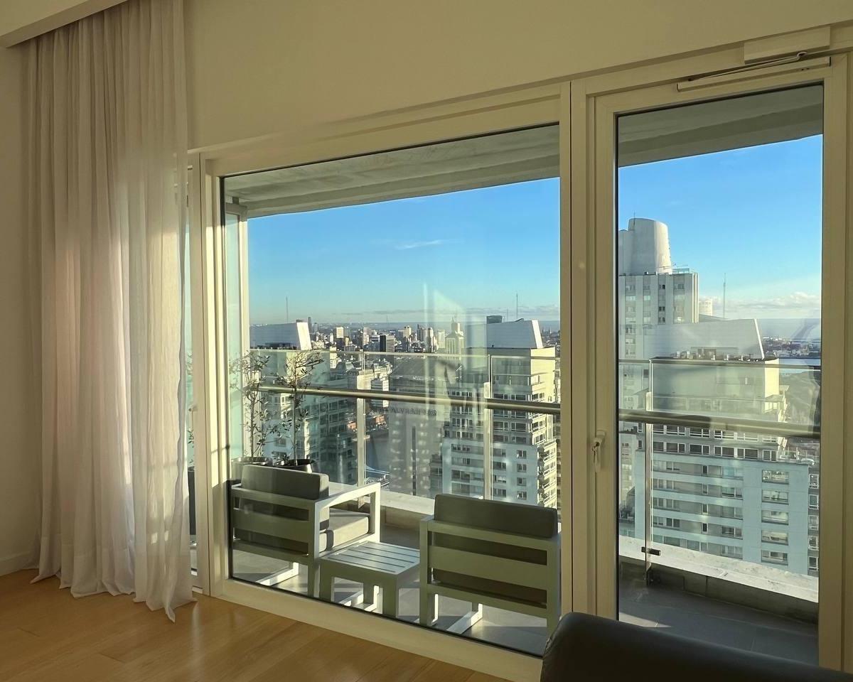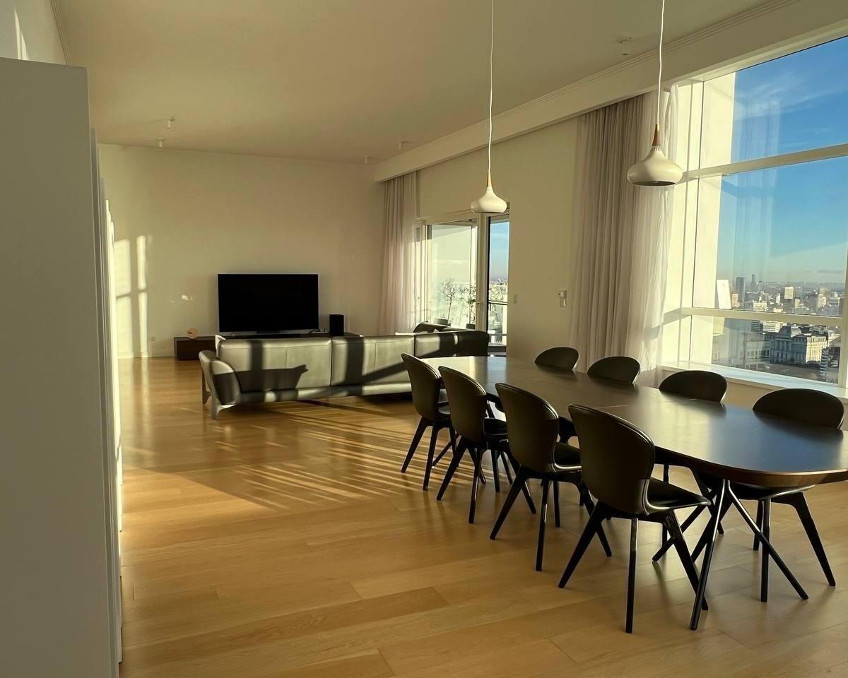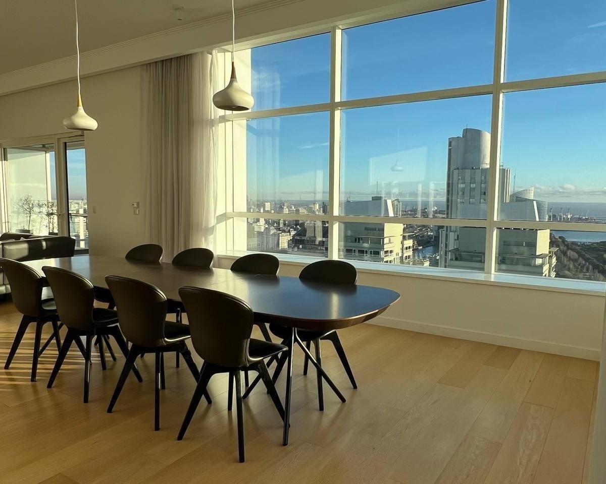 Half-floor apartment with 256 m² total area in Alvear Puerto Madero, Buenos Aires. Private foyer, living-dining room, balcony, guest toilet, separate kitchen with a breakfast area, separate laundry, and a service dependency with a bathroom. The layout includes a master suite with a dressing room and 2 junior en-suite bedrooms with dressing rooms, plus a study/home theatre or 4th bedroom. Central hot water and central heating/cooling with cold/heat air conditioning, double-glazed windows (DVH), p