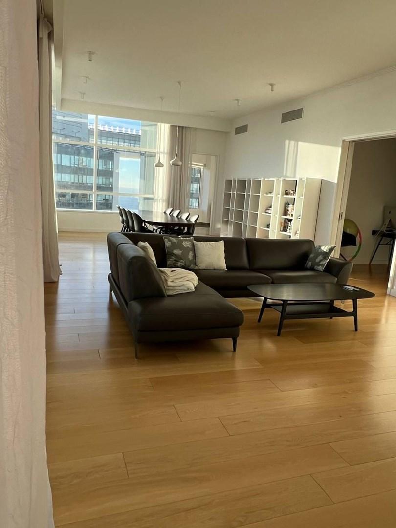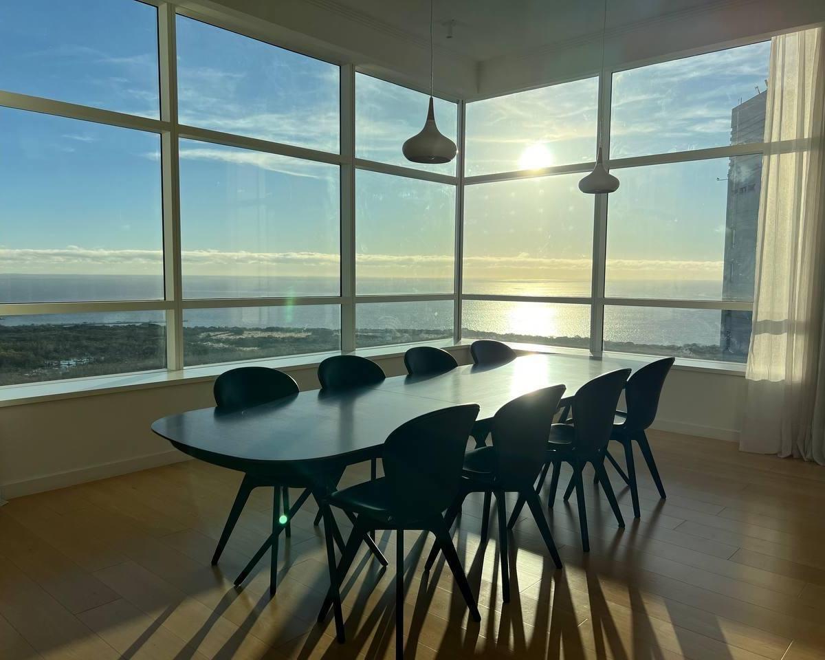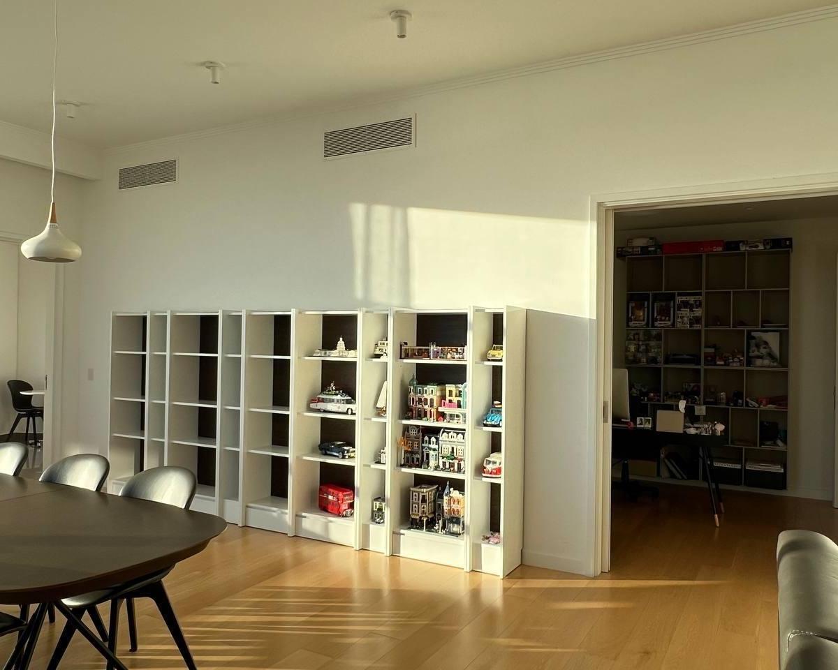 Half-floor apartment with 256 m² total area in Alvear Puerto Madero, Buenos Aires. Private foyer, living-dining room, balcony, guest toilet, separate kitchen with a breakfast area, separate laundry, and a service dependency with a bathroom. The layout includes a master suite with a dressing room and 2 junior en-suite bedrooms with dressing rooms, plus a study/home theatre or 4th bedroom. Central hot water and central heating/cooling with cold/heat air conditioning, double-glazed windows (DVH), p