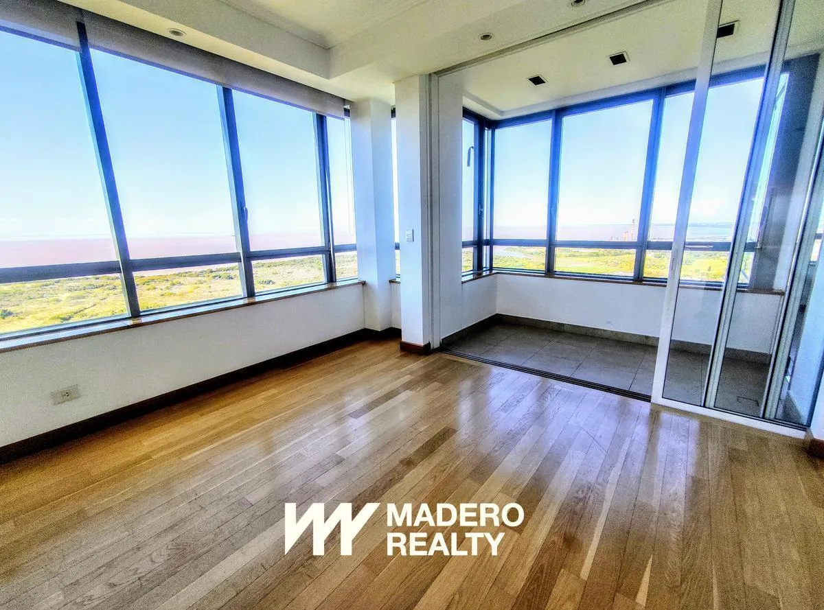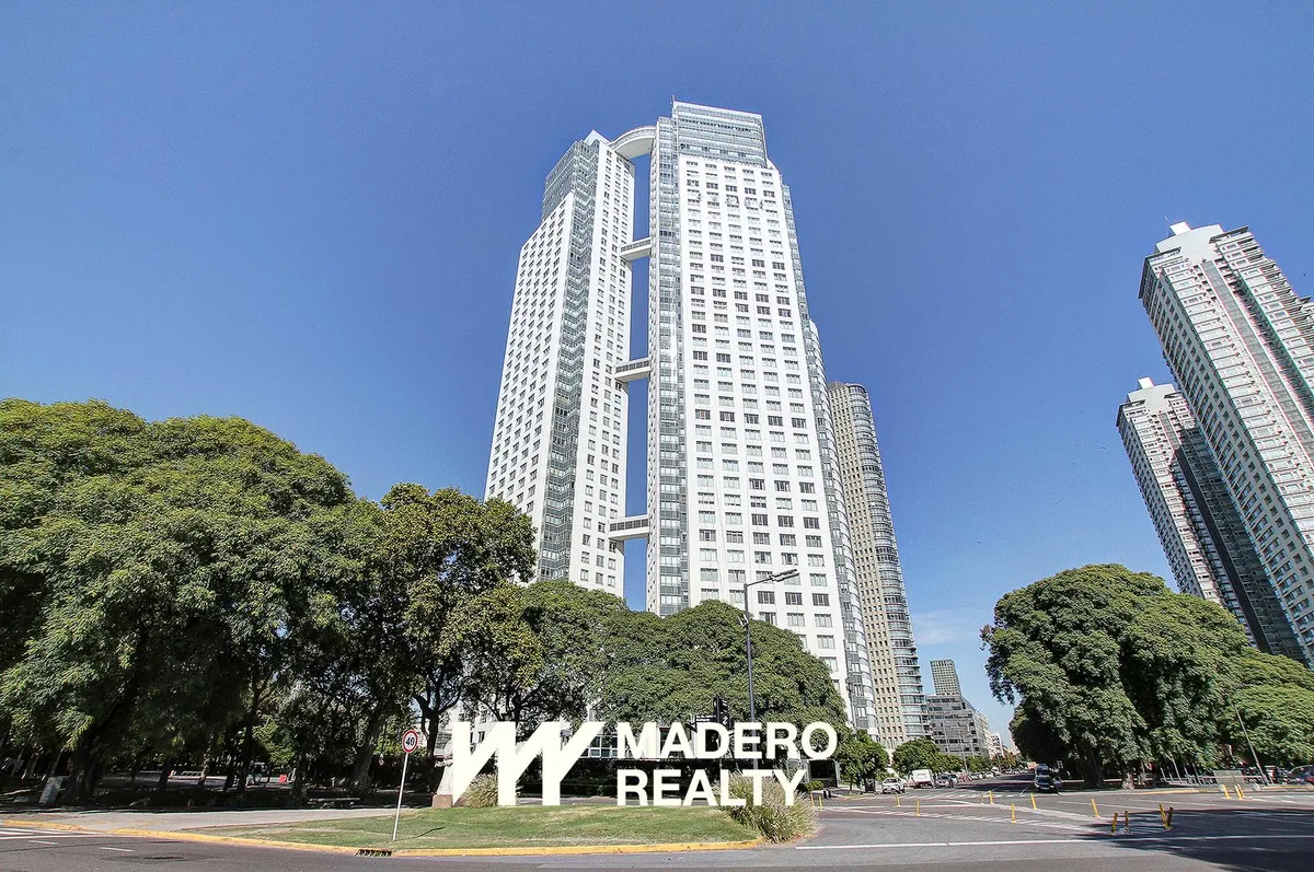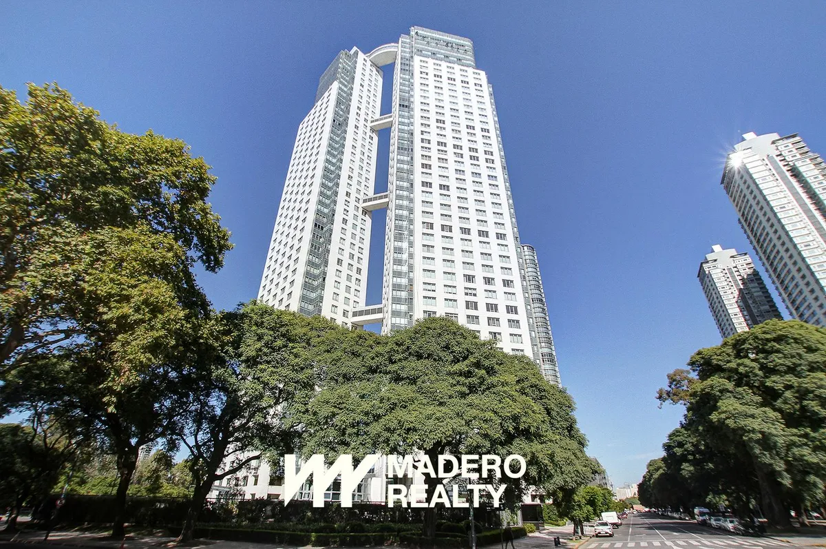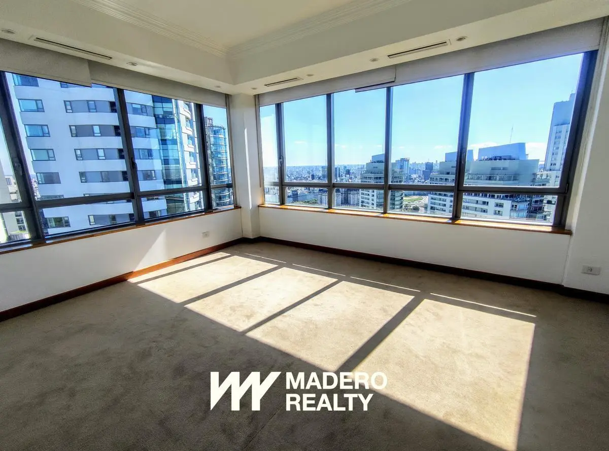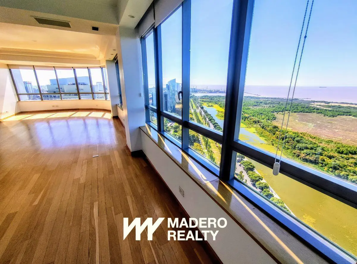 Full-floor apartment for rent in Torres El Faro, Puerto Madero, with 380 m². High floor with panoramic views of the Río de la Plata and the city, and a private grill. Entrance via a private landing from the elevator; large living-dining area with guest toilet; independent kitchen with separate dining room access via a second elevator; separate laundry area and service quarters with bathroom. Private area includes 3 bedrooms (two with shared full bathroom, plus a suite with dressing room and bath