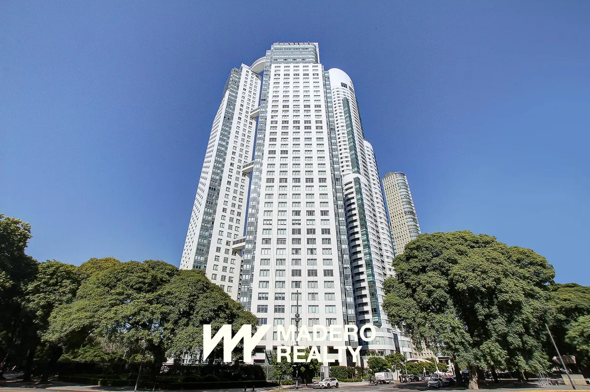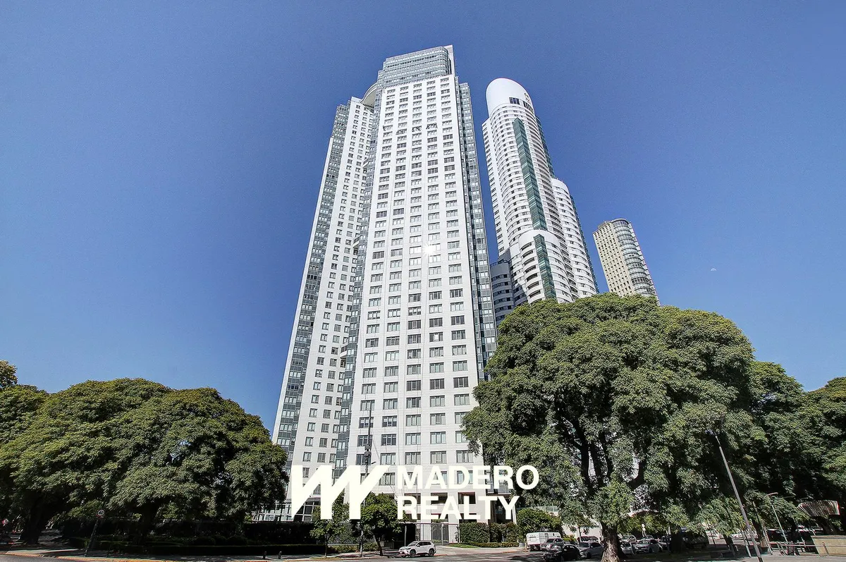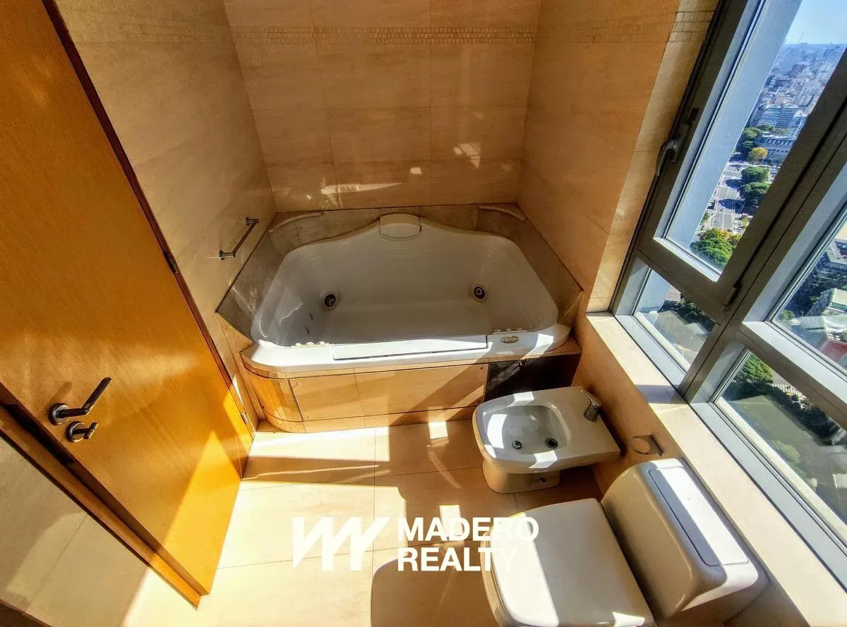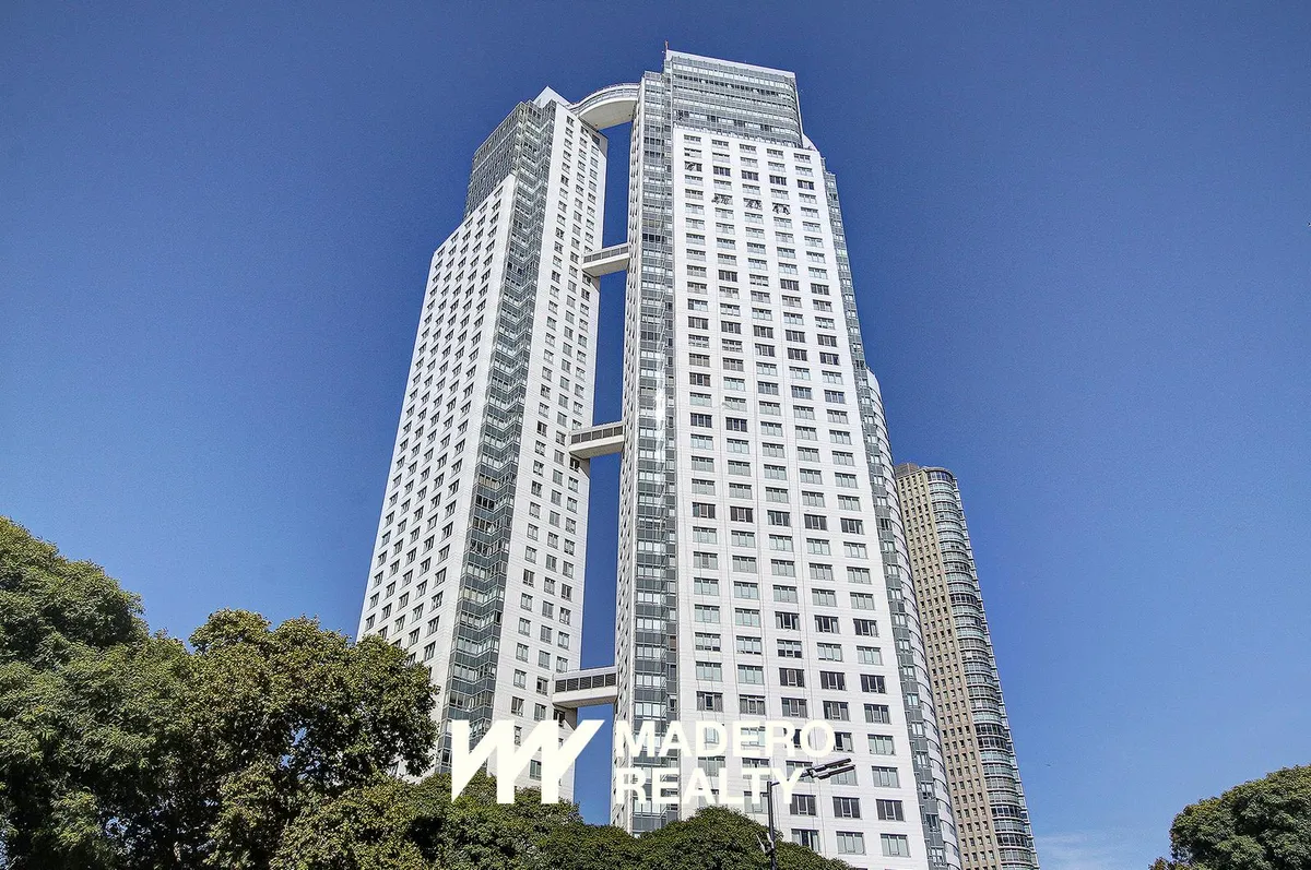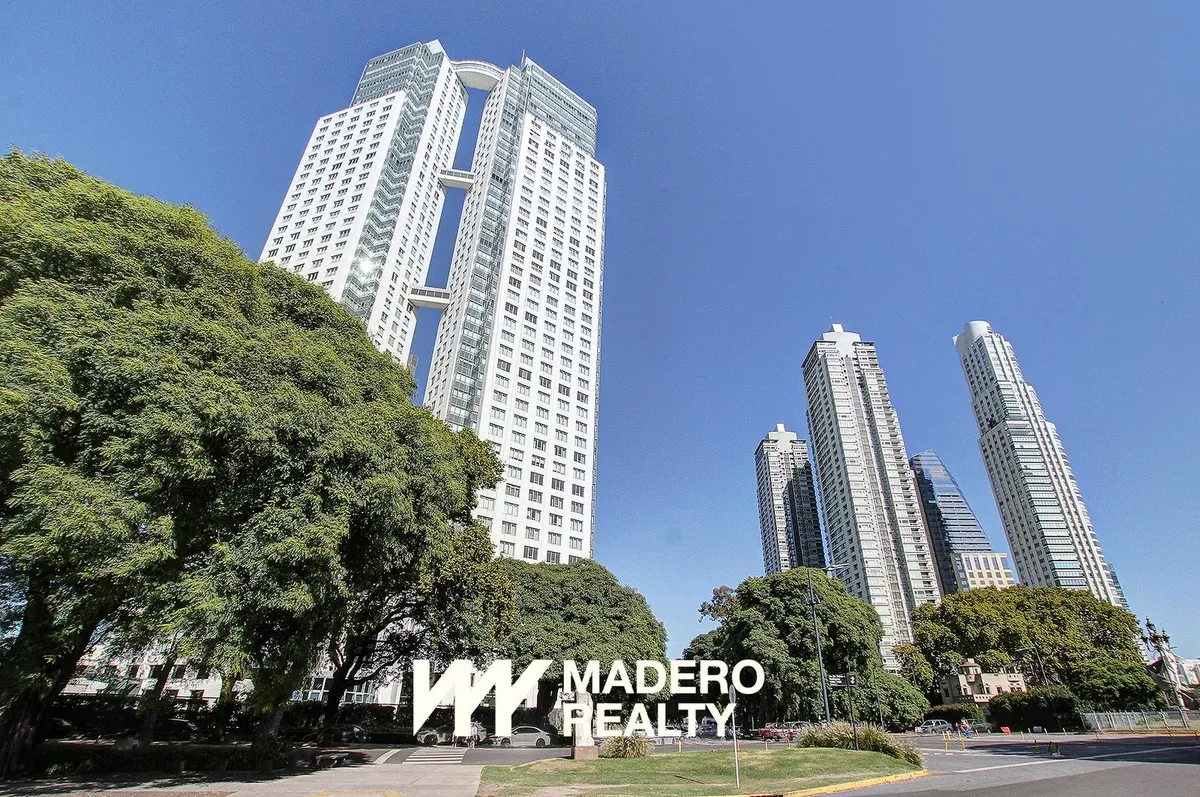 Full-floor apartment for rent in Torres El Faro, Puerto Madero, with 380 m². High floor with panoramic views of the Río de la Plata and the city, and a private grill. Entrance via a private landing from the elevator; large living-dining area with guest toilet; independent kitchen with separate dining room access via a second elevator; separate laundry area and service quarters with bathroom. Private area includes 3 bedrooms (two with shared full bathroom, plus a suite with dressing room and bath