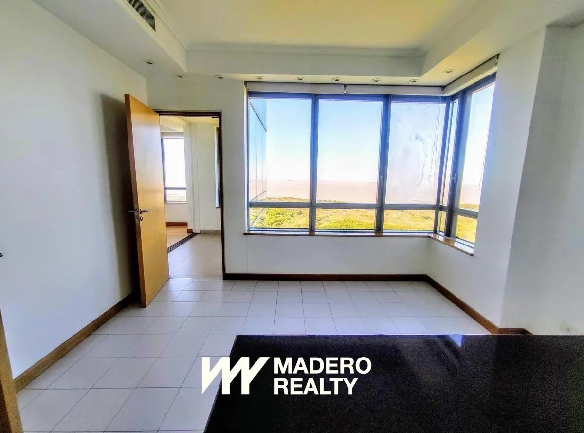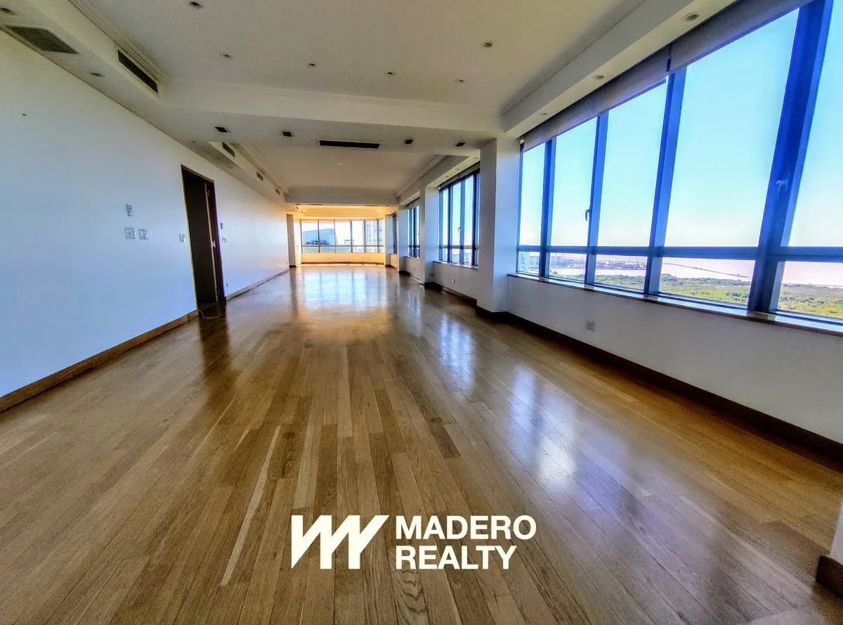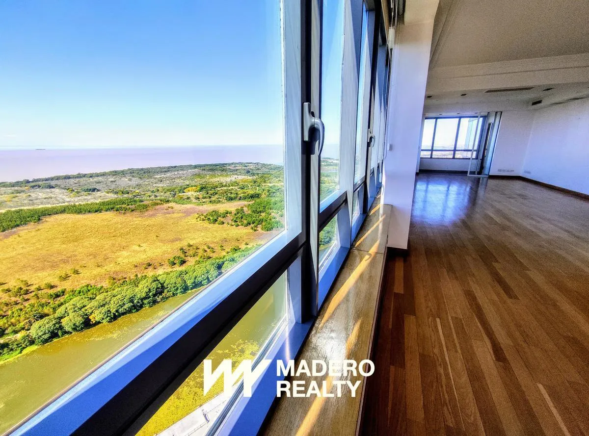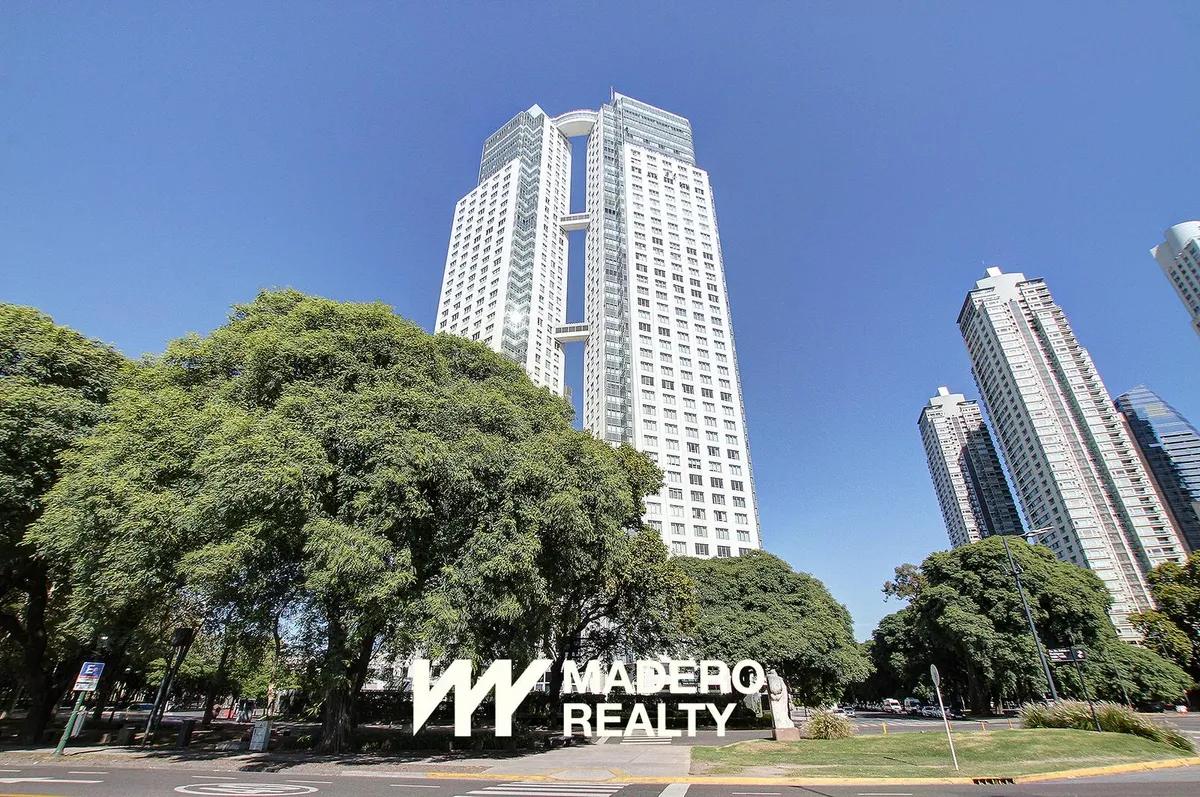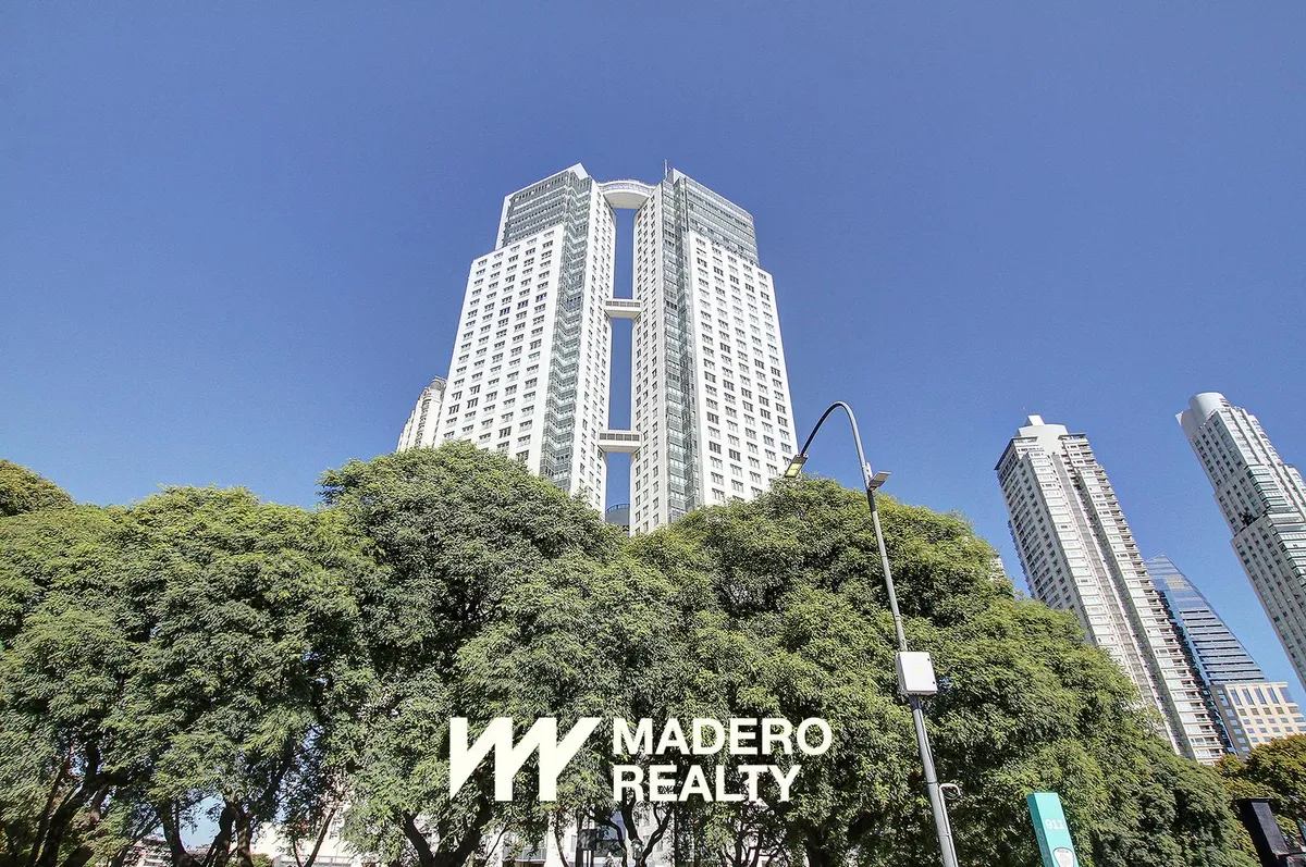 Full-floor apartment for rent in Torres El Faro, Puerto Madero, with 380 m². High floor with panoramic views of the Río de la Plata and the city, and a private grill. Entrance via a private landing from the elevator; large living-dining area with guest toilet; independent kitchen with separate dining room access via a second elevator; separate laundry area and service quarters with bathroom. Private area includes 3 bedrooms (two with shared full bathroom, plus a suite with dressing room and bath