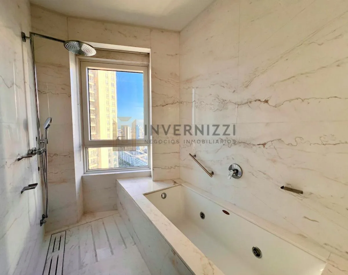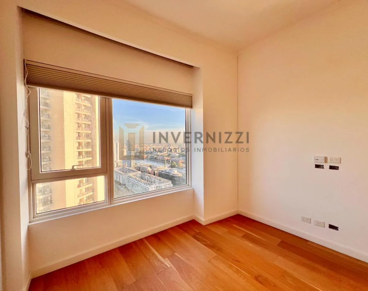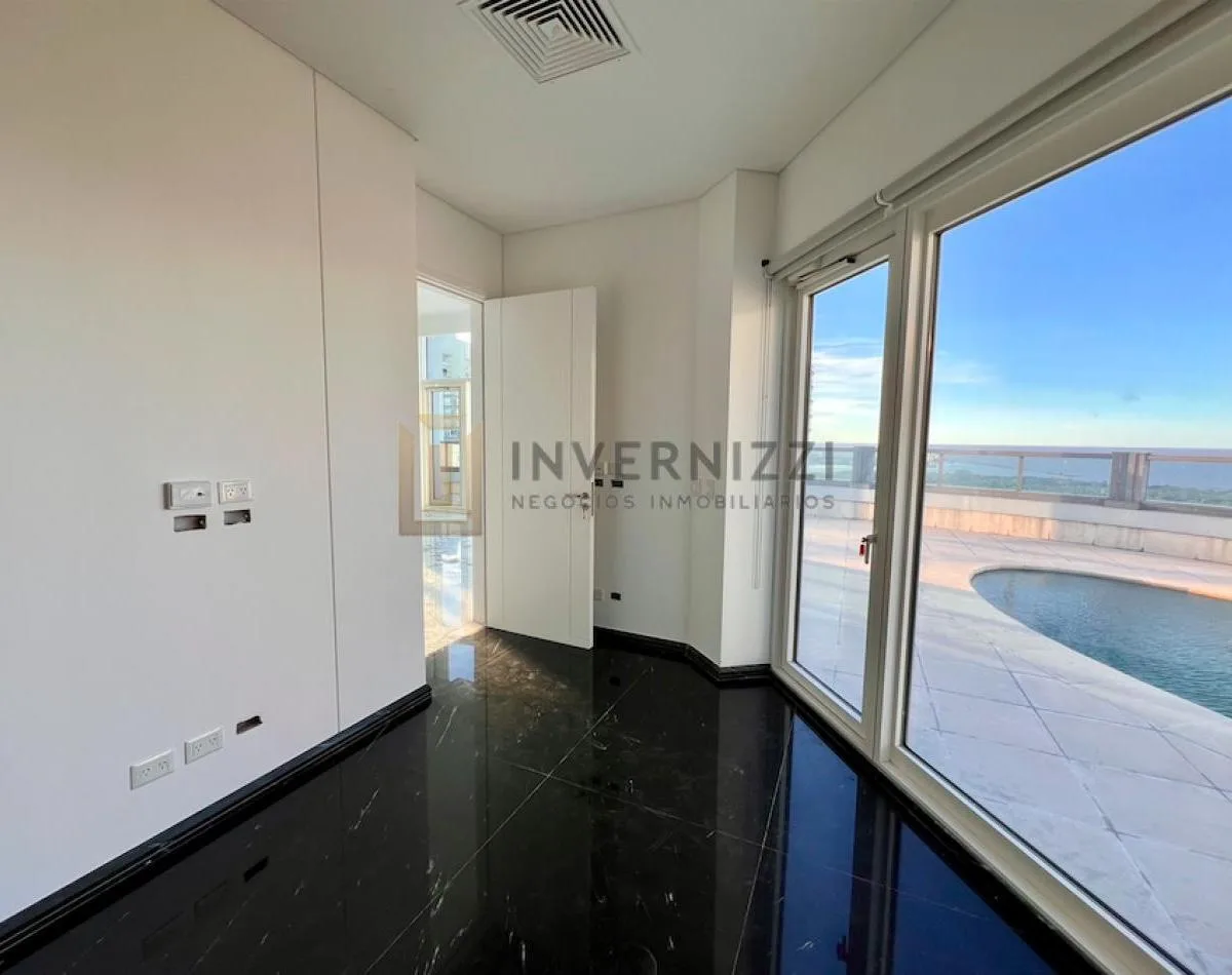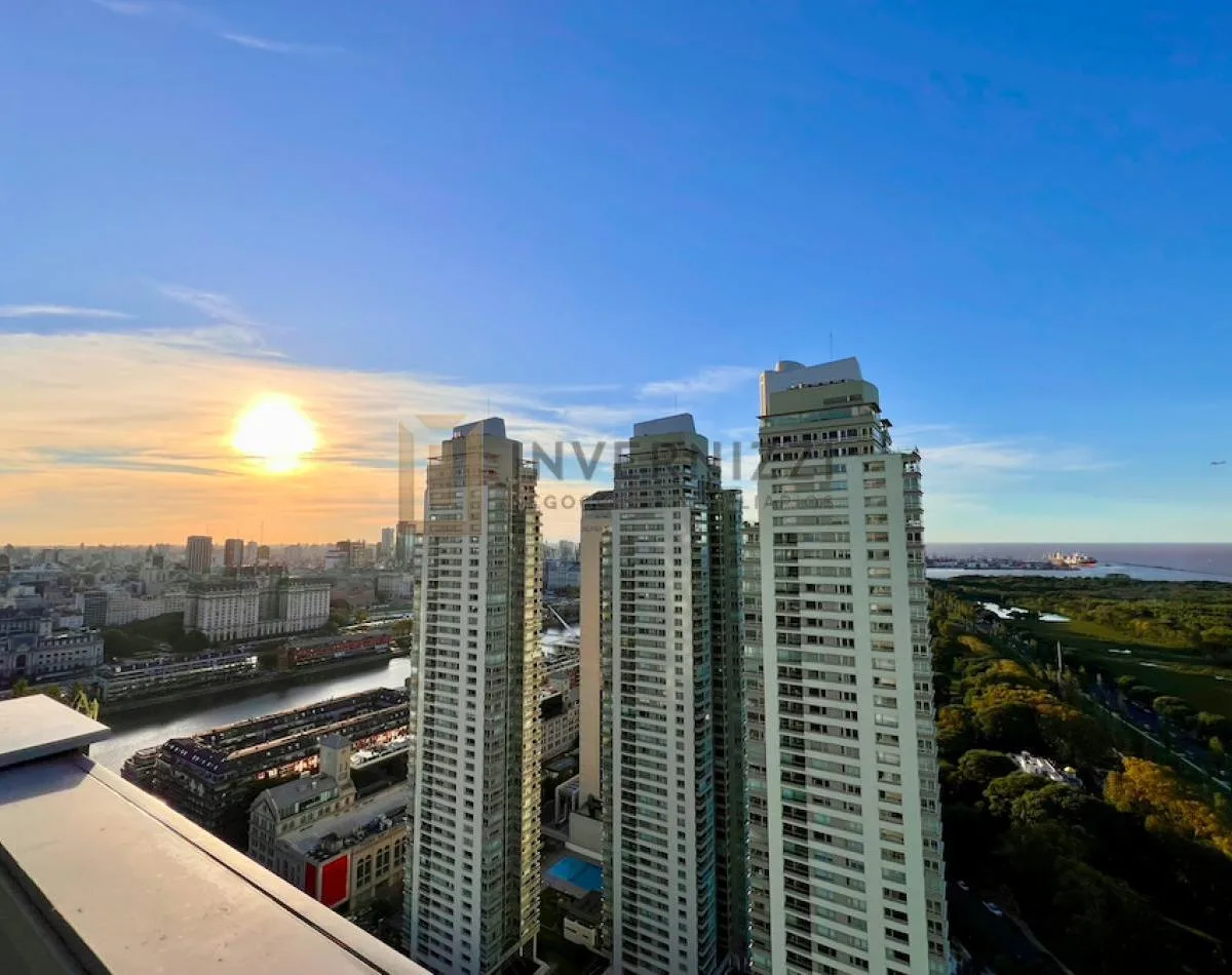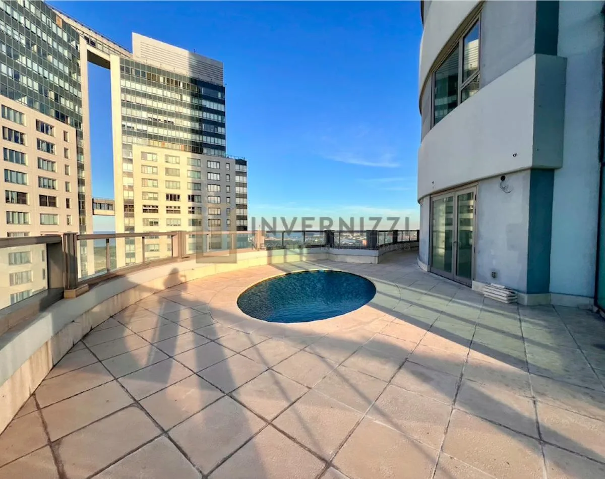 Half-floor apartment in Puerto Madero, furnished, with a total area of 425 m² (300 m² covered and 125 m² semi-covered). High floor with views of the Río de la Plata and the city. The unit has a private lobby with two main elevators, a living-dining room, a wine cellar area, a terrace with a private pool, a separate kitchen with a breakfast area, a guest toilet, 4 bedrooms each with an en-suite bathroom, service staff quarters, and a laundry area. Includes 2 parking spaces and marble and wood flo
