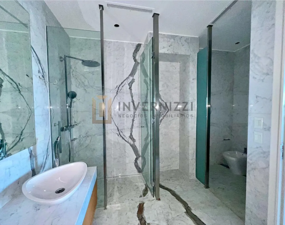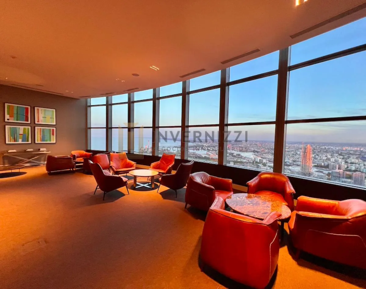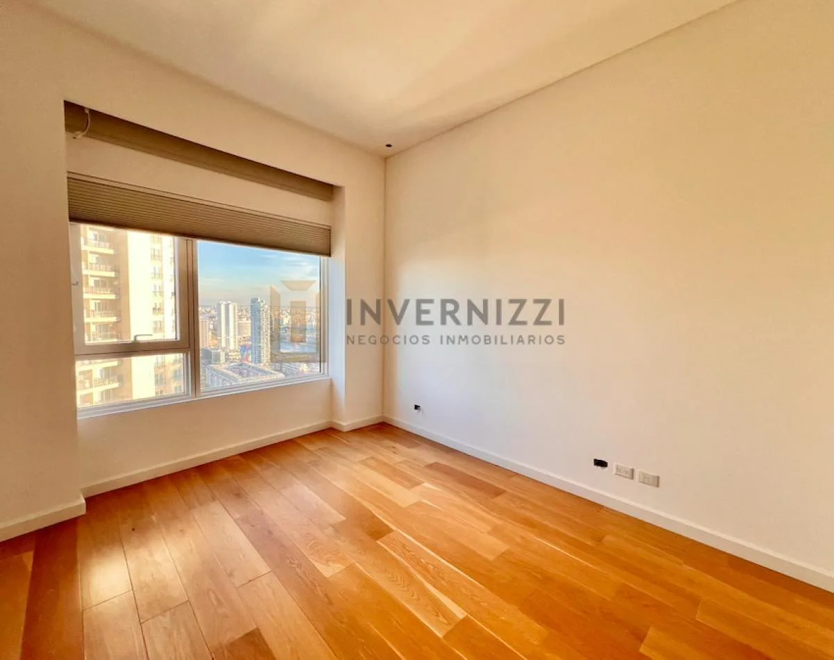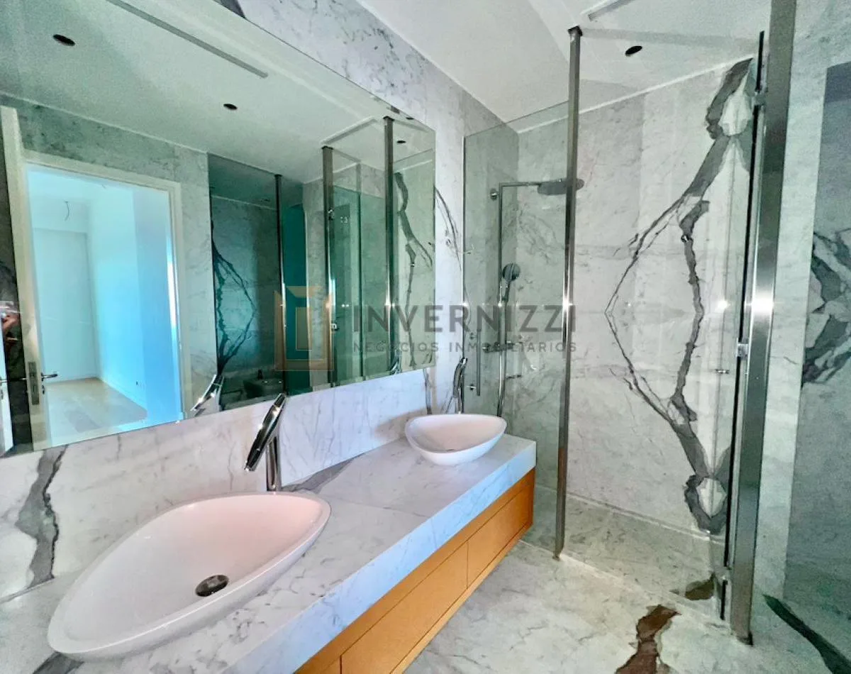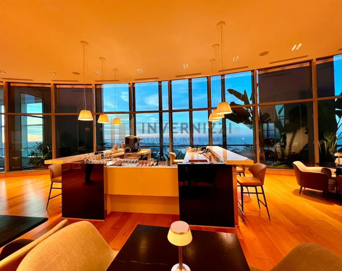 Half-floor apartment in Puerto Madero, furnished, with a total area of 425 m² (300 m² covered and 125 m² semi-covered). High floor with views of the Río de la Plata and the city. The unit has a private lobby with two main elevators, a living-dining room, a wine cellar area, a terrace with a private pool, a separate kitchen with a breakfast area, a guest toilet, 4 bedrooms each with an en-suite bathroom, service staff quarters, and a laundry area. Includes 2 parking spaces and marble and wood flo