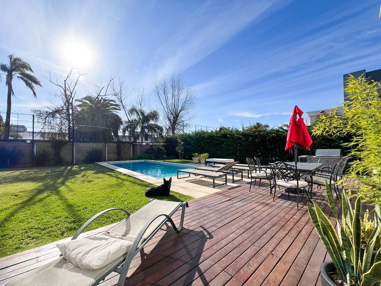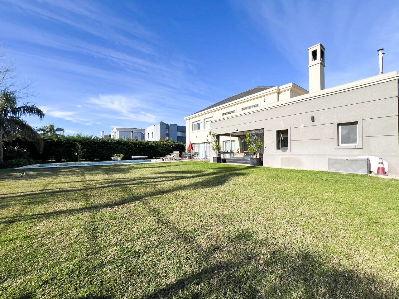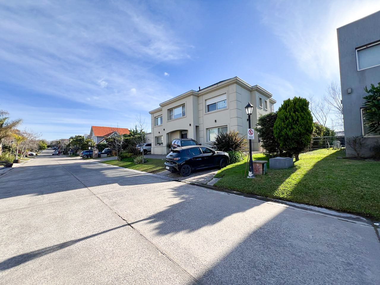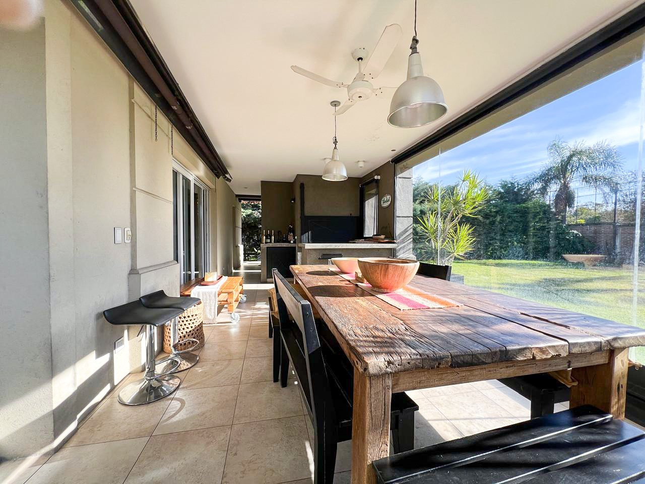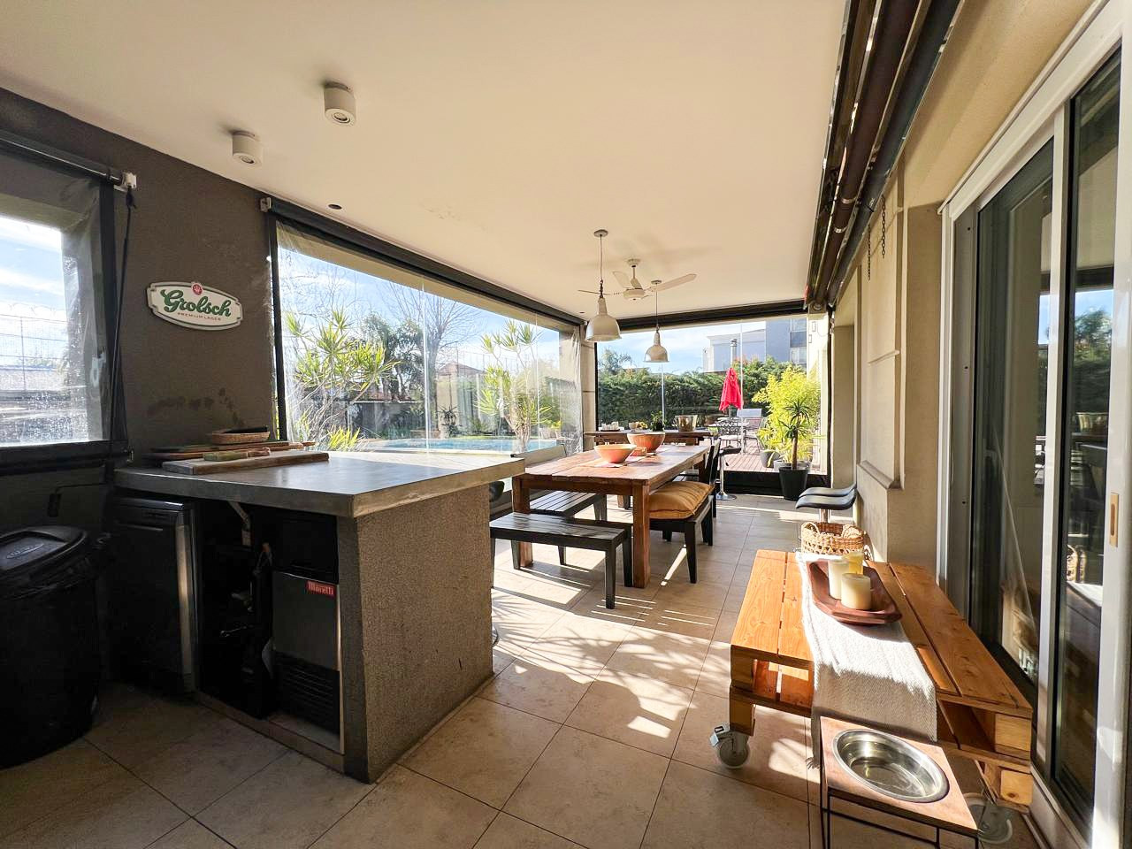 Four-bedroom house in Barrancas de Guido, a gated community in Quilmes. The 1,092 m² lot has 400 m² of built area and includes a main and service access, living room with views of the park and pool, dining room, separate kitchen-dining room, laundry area, and a guest toilet. There are 5 bedrooms in total, including 2 en suite with dressing rooms, plus a full bathroom, playroom, family room, covered gallery, grill area, swimming pool and park, and central heating.