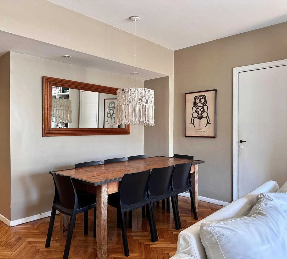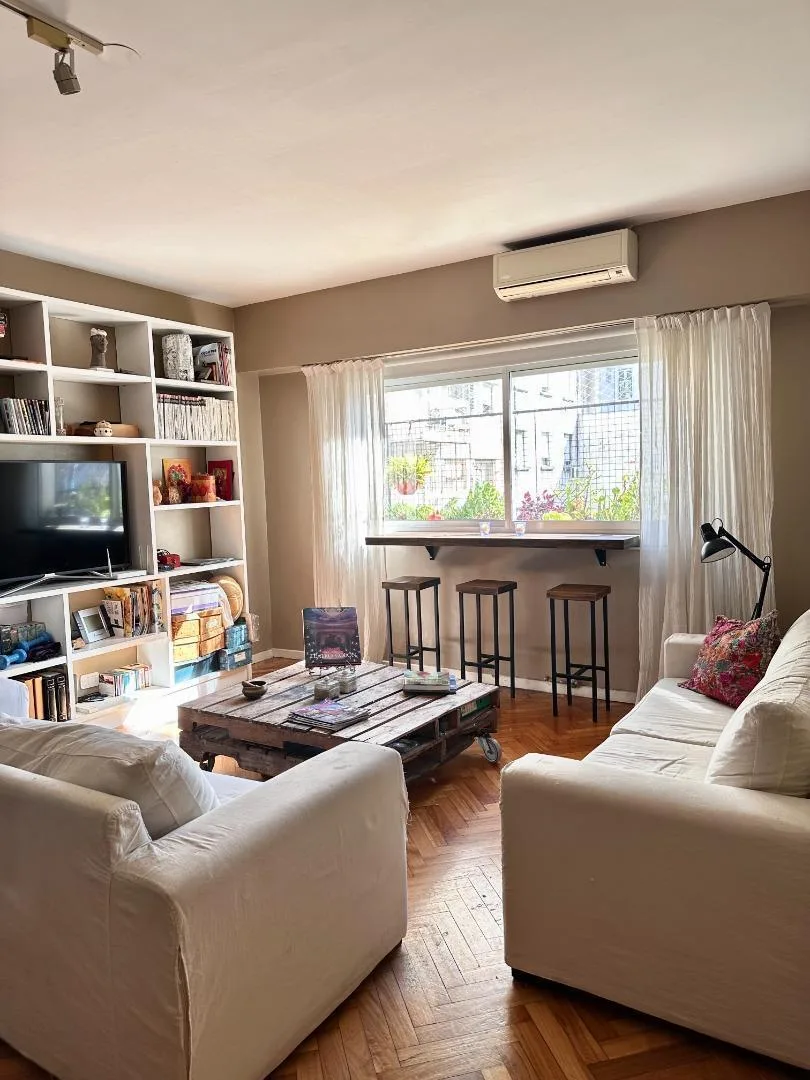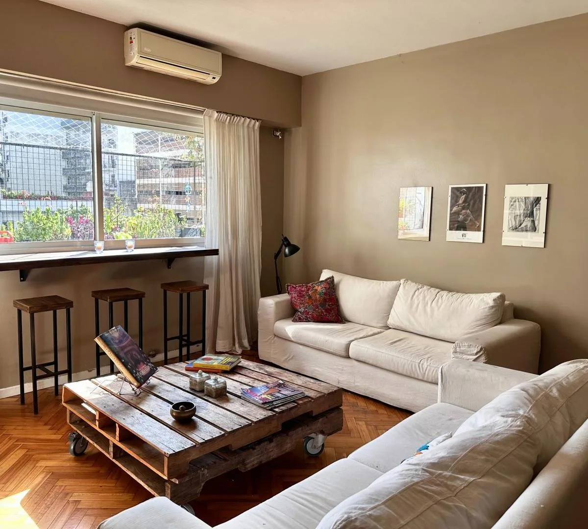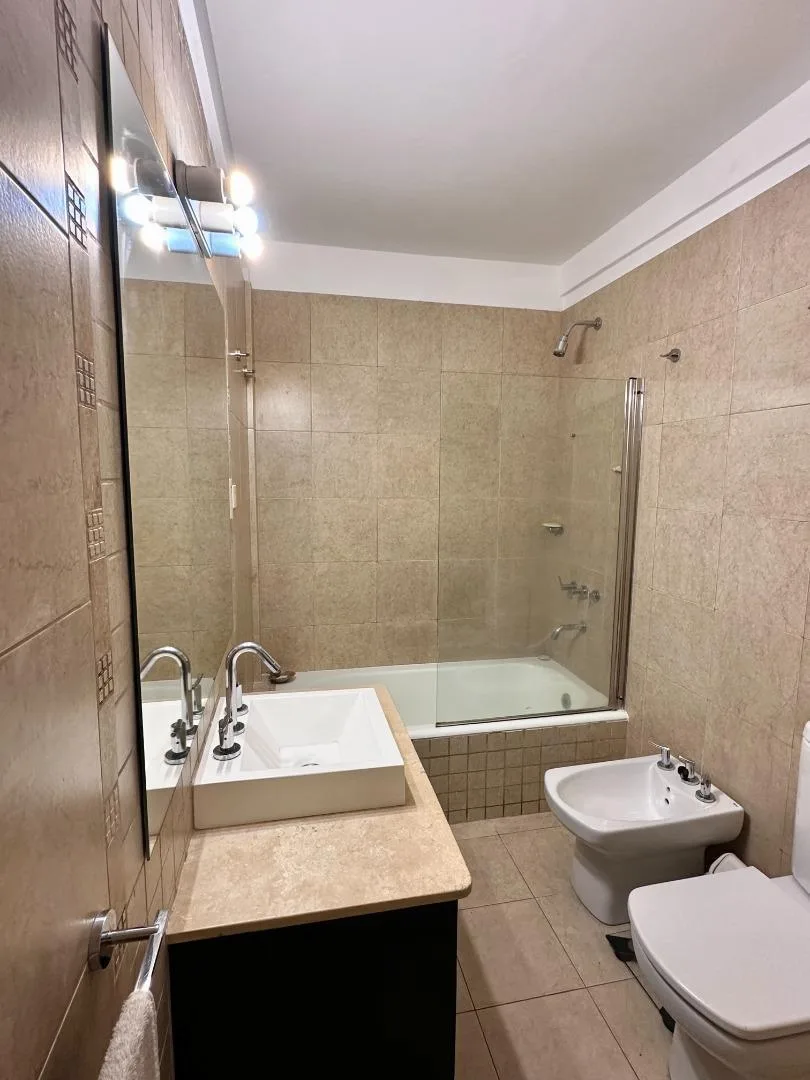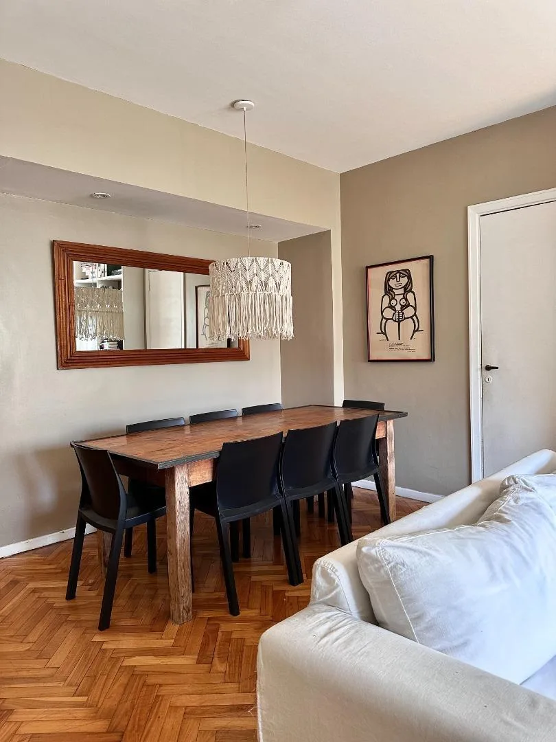 Four-bedroom apartment in Recoleta with decoration and storage space. The layout includes a main bedroom with a double bed, a second bedroom with a double bed, a third bedroom with two single beds, and a fourth room in the service area with a single bed, plus a TV and desk. There is a living room with TV and seating for 4, a dining table with 8 chairs, 2 bathrooms and 1 guest toilet, and an equipped kitchen. Annual rental contract for 2 years with quarterly rent adjustment linked to IPC.