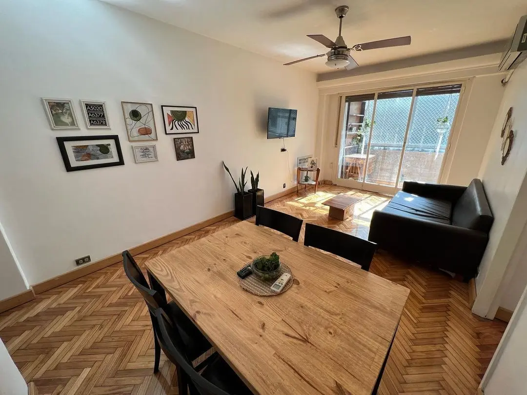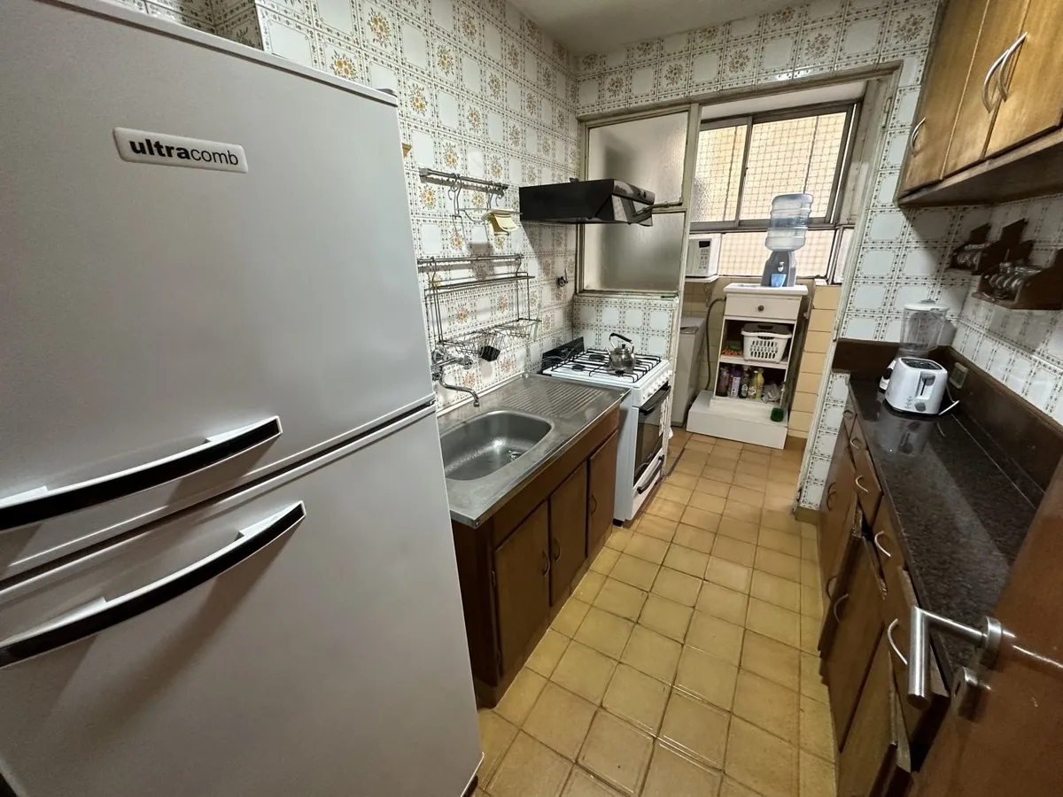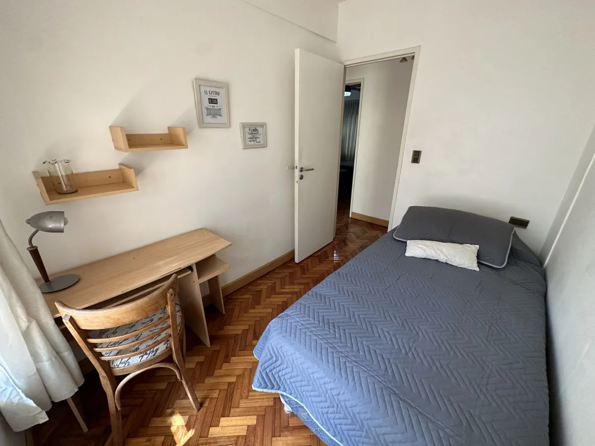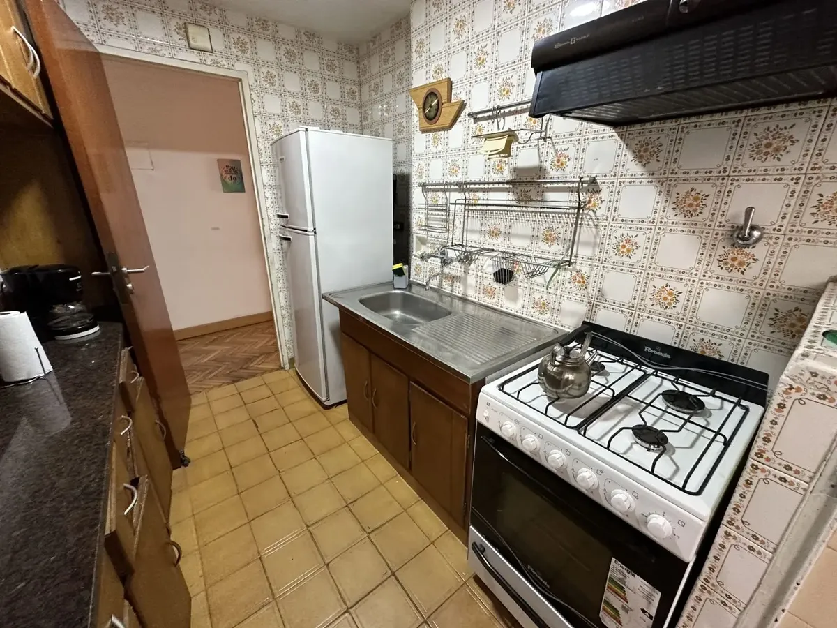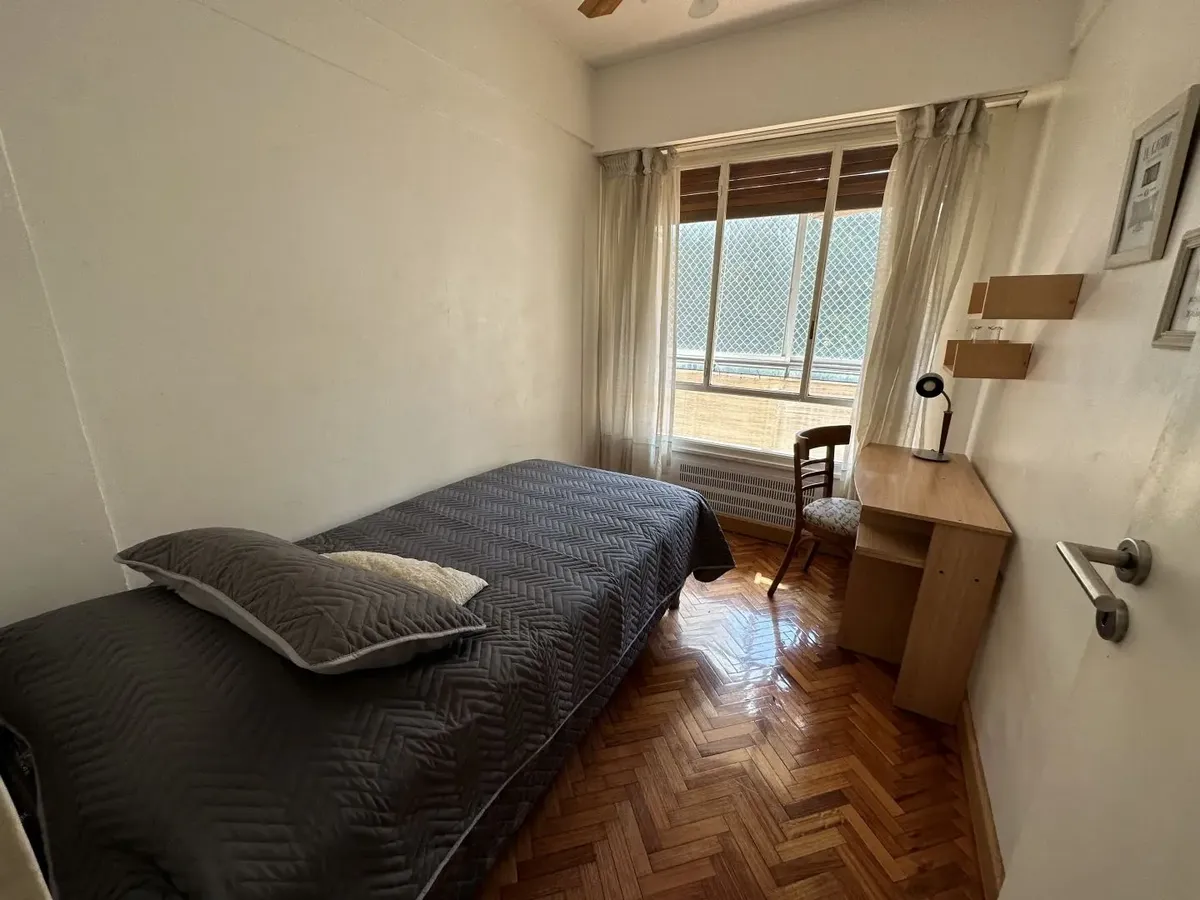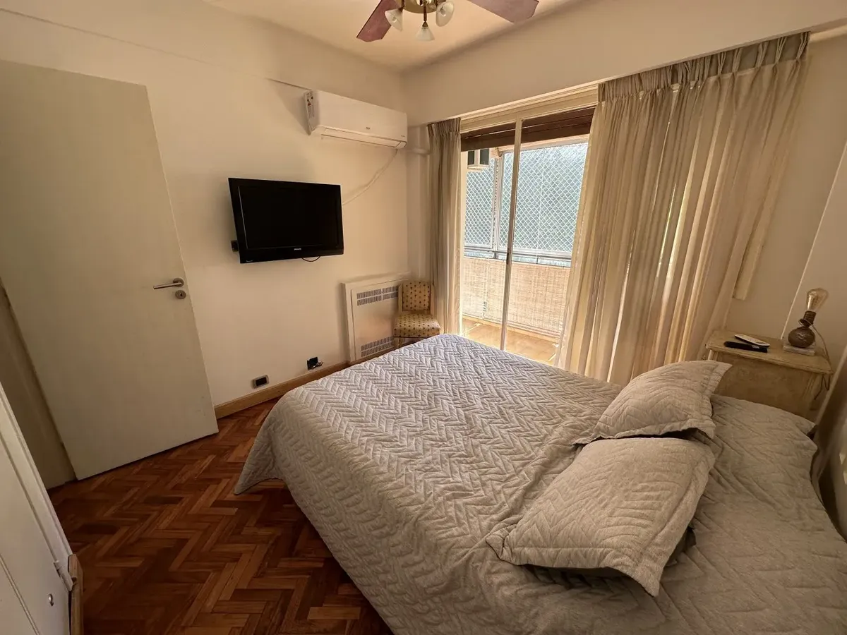 Furnished 4-room apartment of 90 m² in Recoleta, on the 1st floor and courtyard-facing. It has a reception toilet plus 1 full bathroom, a living-dining room with air conditioning and a 42-inch TV, and a corridor with 3 bedrooms plus an additional bedroom with a service room. The apartment is equipped with a linear kitchen including a fridge with freezer and a gas stove, and it includes a laundry area with a washing machine or a service dependency with a bed and wardrobe. Monthly rent is US$1,100