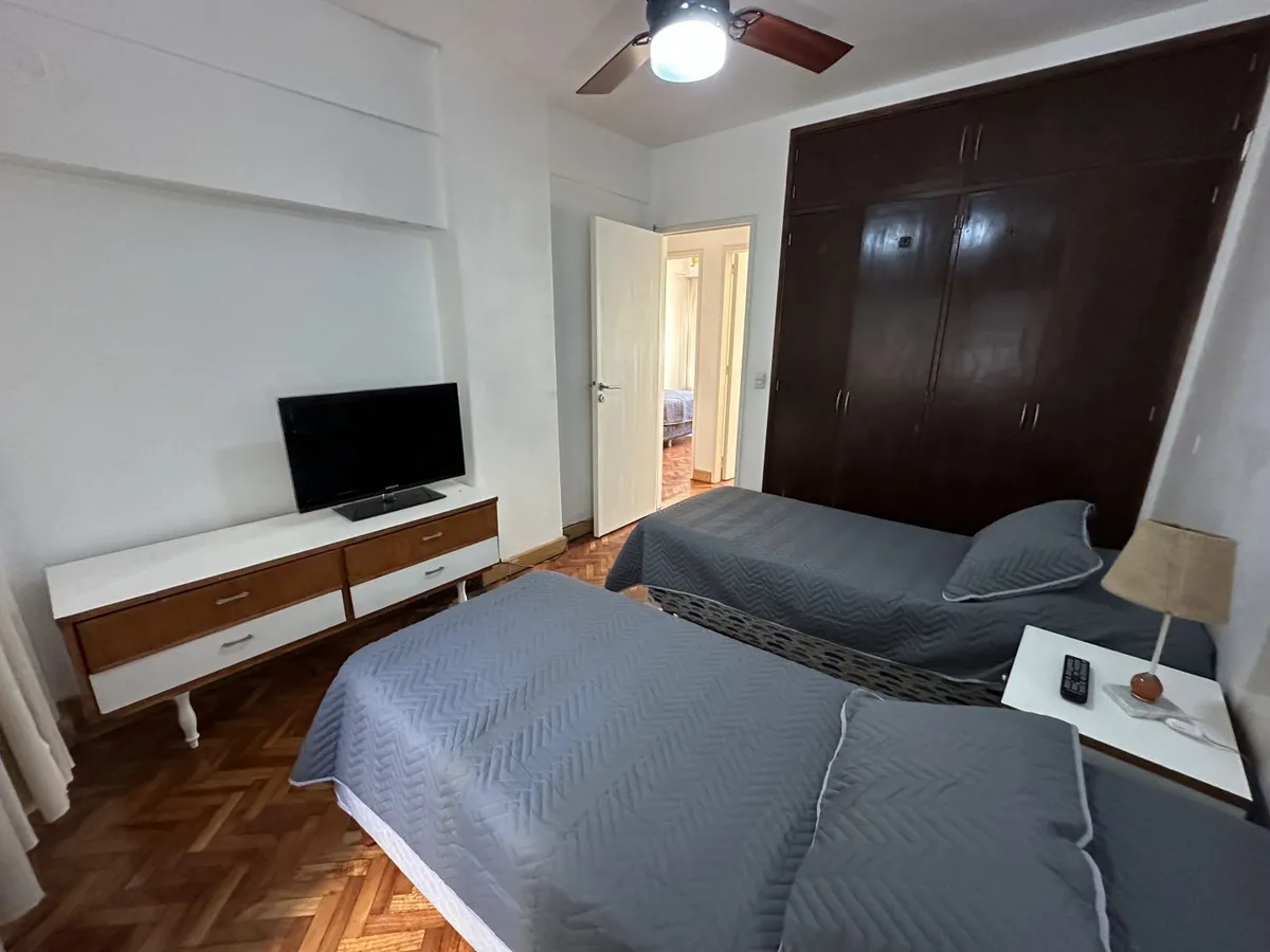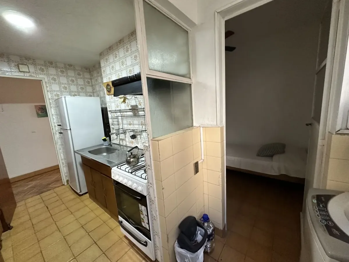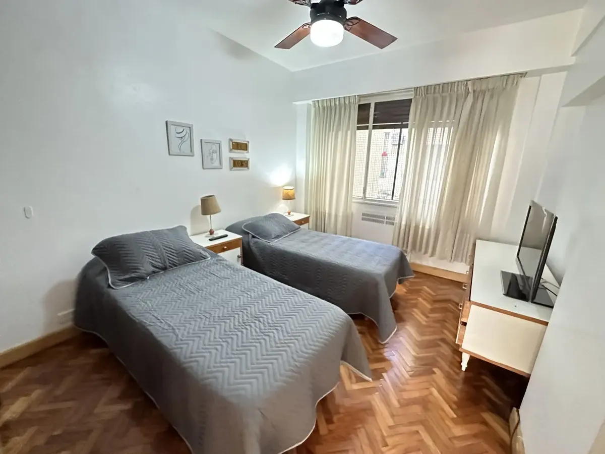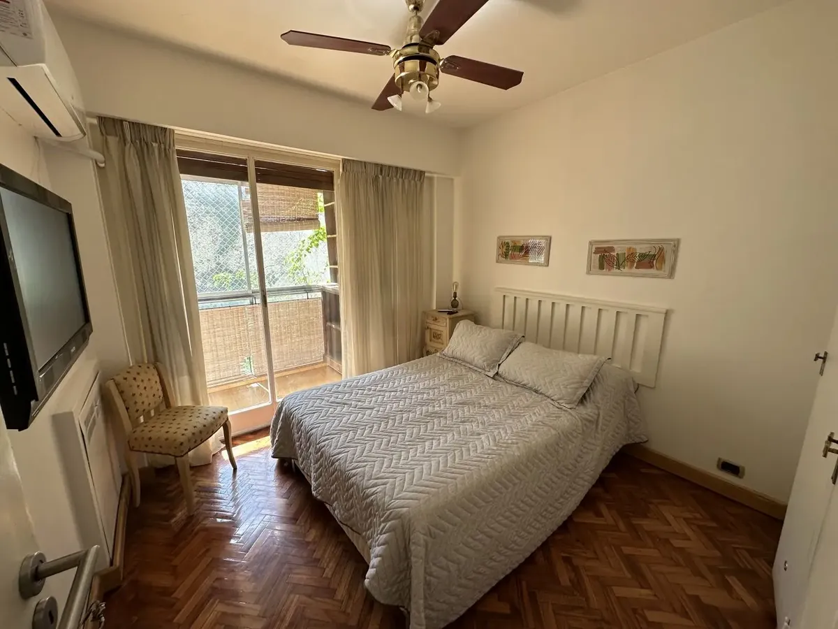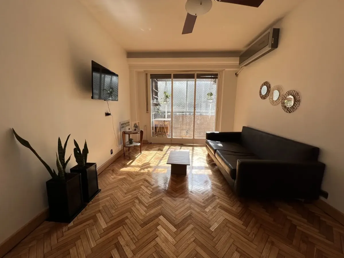 Furnished 4-room apartment of 90 m² in Recoleta, on the 1st floor and courtyard-facing. It has a reception toilet plus 1 full bathroom, a living-dining room with air conditioning and a 42-inch TV, and a corridor with 3 bedrooms plus an additional bedroom with a service room. The apartment is equipped with a linear kitchen including a fridge with freezer and a gas stove, and it includes a laundry area with a washing machine or a service dependency with a bed and wardrobe. Monthly rent is US$1,100