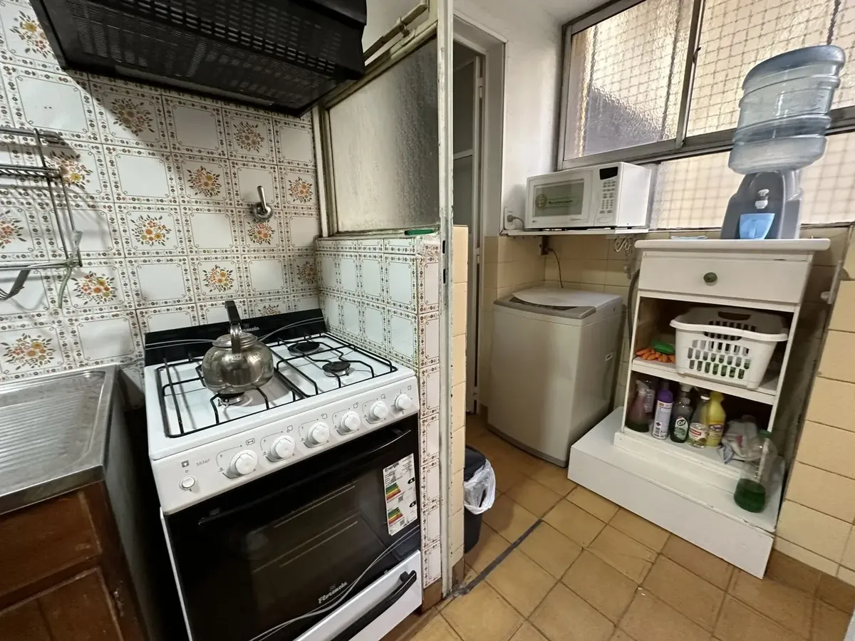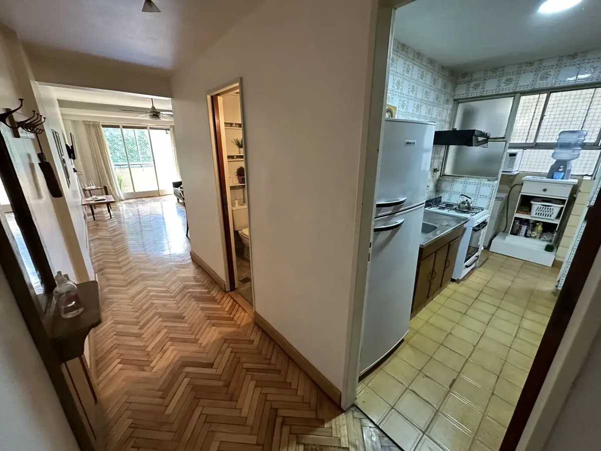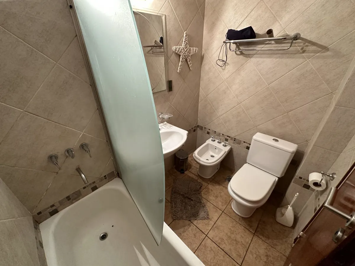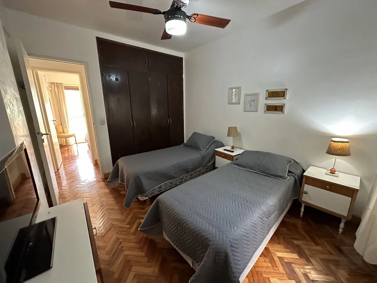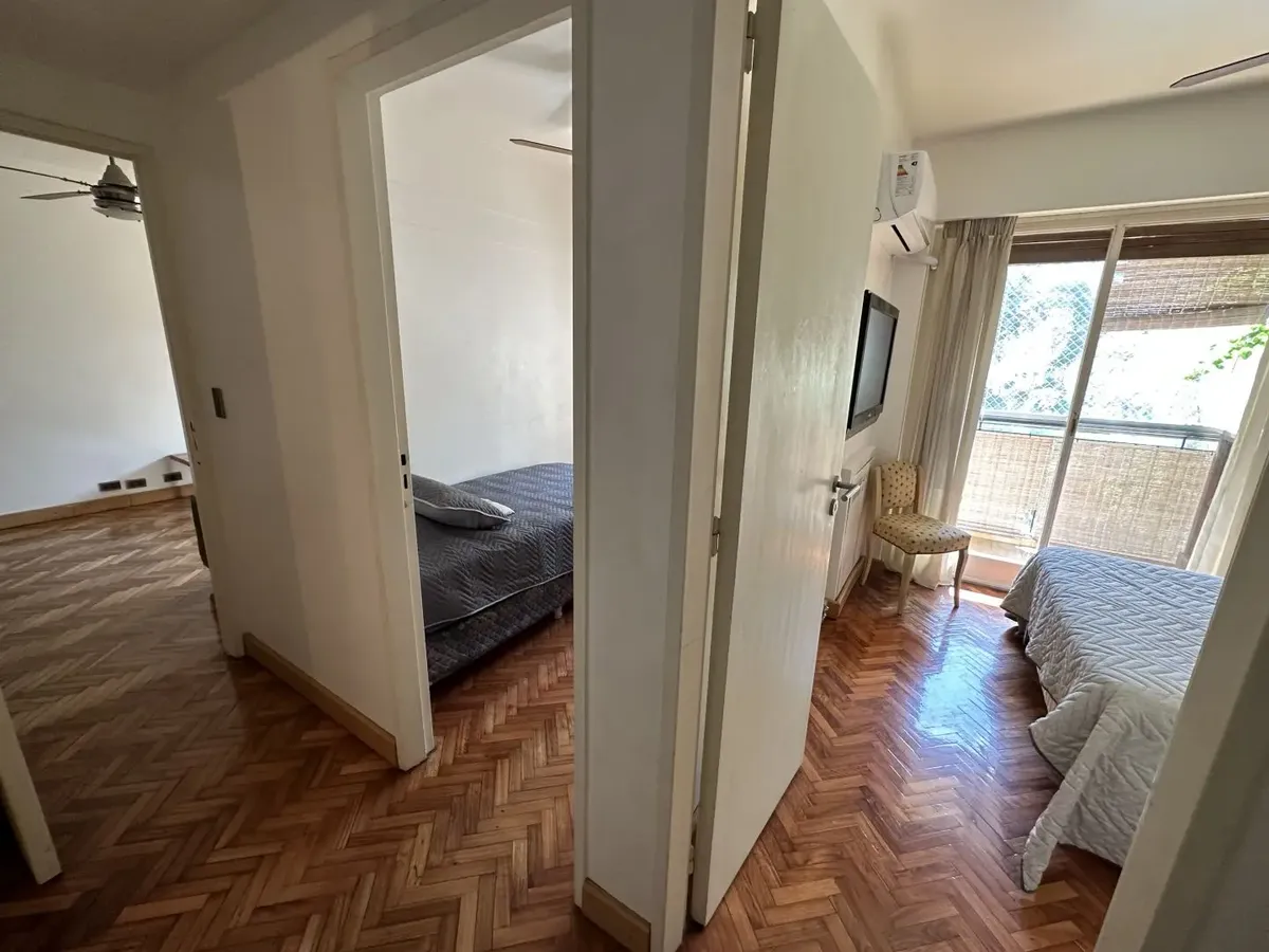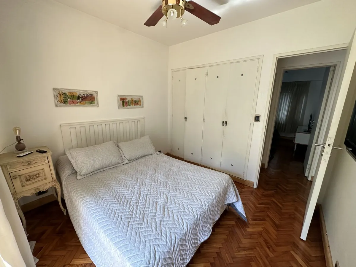 Furnished 4-room apartment of 90 m² in Recoleta, on the 1st floor and courtyard-facing. It has a reception toilet plus 1 full bathroom, a living-dining room with air conditioning and a 42-inch TV, and a corridor with 3 bedrooms plus an additional bedroom with a service room. The apartment is equipped with a linear kitchen including a fridge with freezer and a gas stove, and it includes a laundry area with a washing machine or a service dependency with a bed and wardrobe. Monthly rent is US$1,100