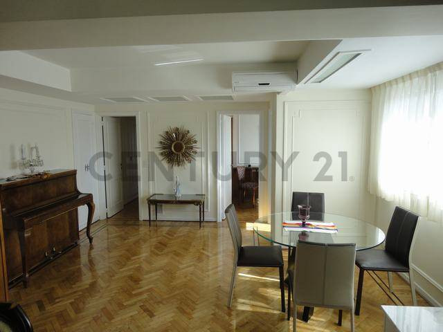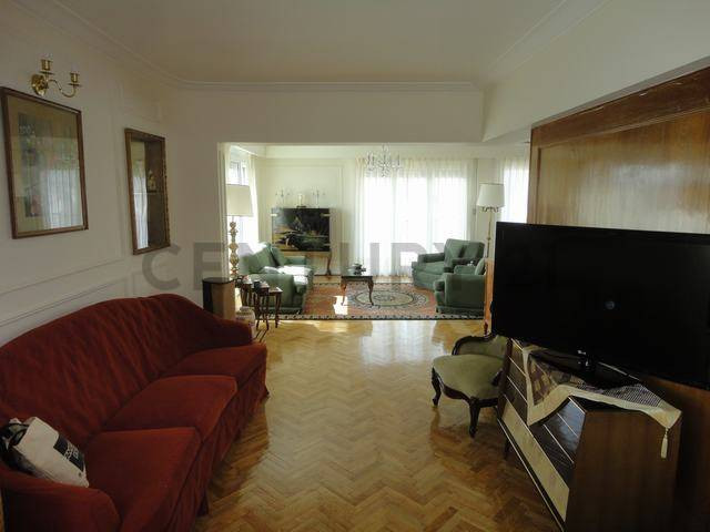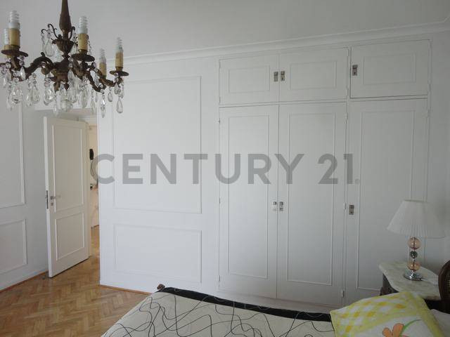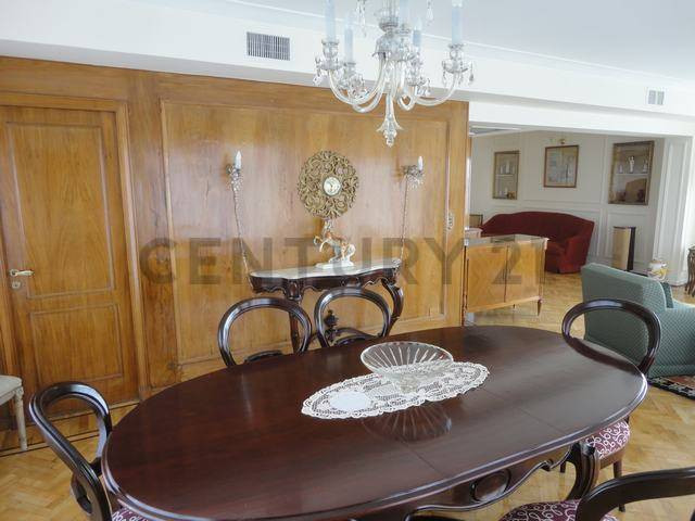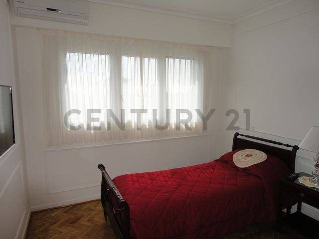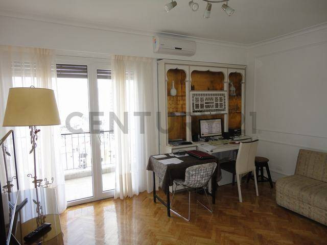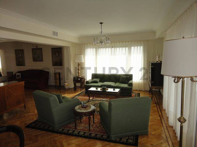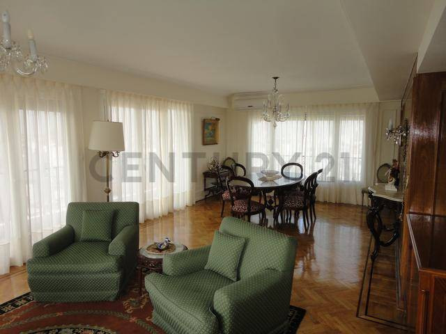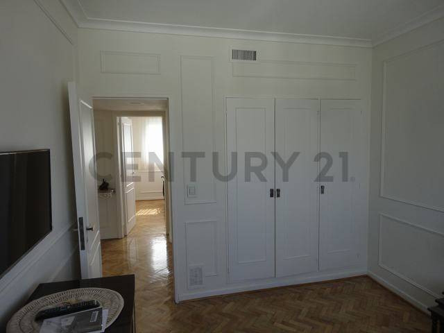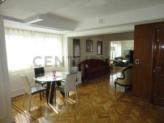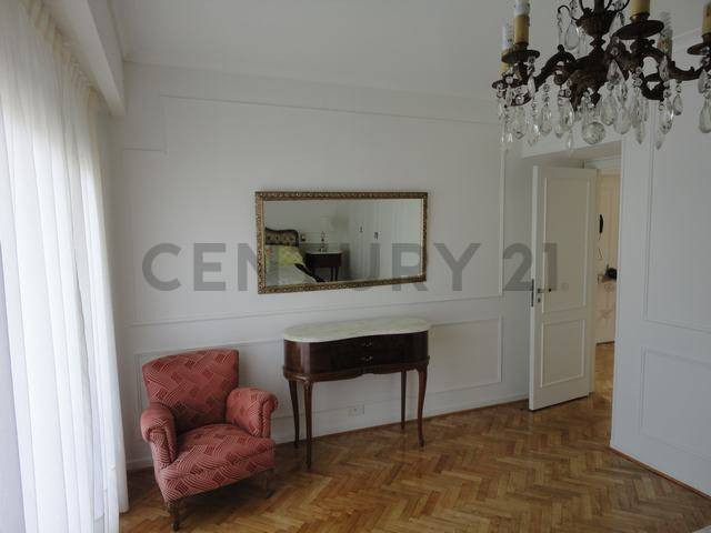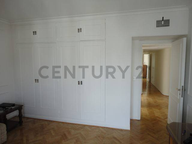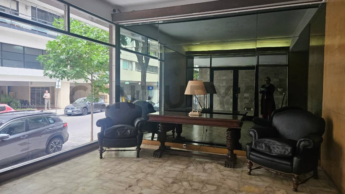 Four-bedroom apartment in Recoleta with an L-shaped living-dining room. Two of the bedrooms have balconies and views; the other two have exterior windows and built-in wardrobes. There is an office area, a spacious kitchen with extensive storage, and a service unit with a service bedroom and service bathroom, plus a separate laundry area with a washing machine. The unit includes a reception toilet and two compartmentalised bathrooms, one refurbished and one from the original period, with ducted c