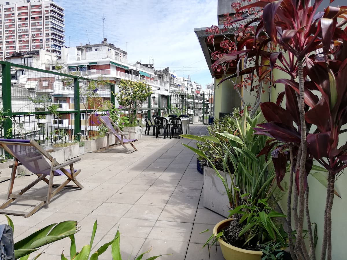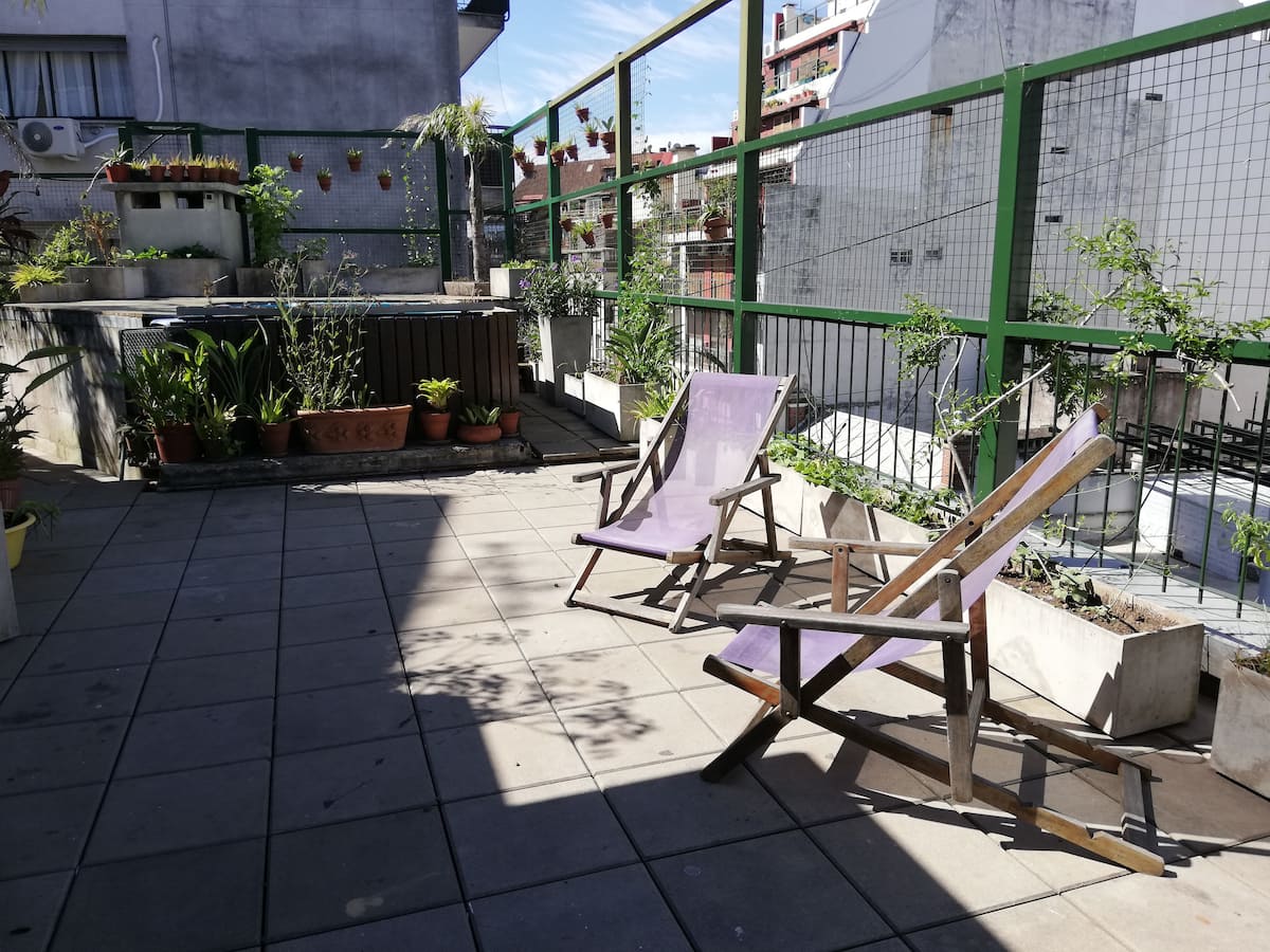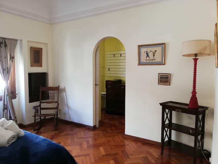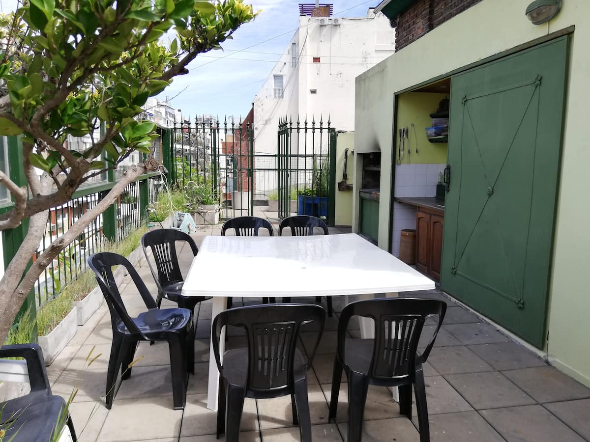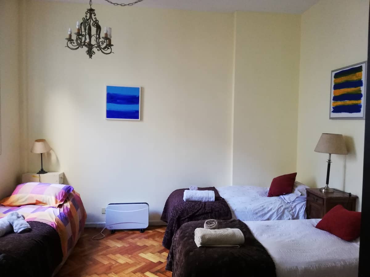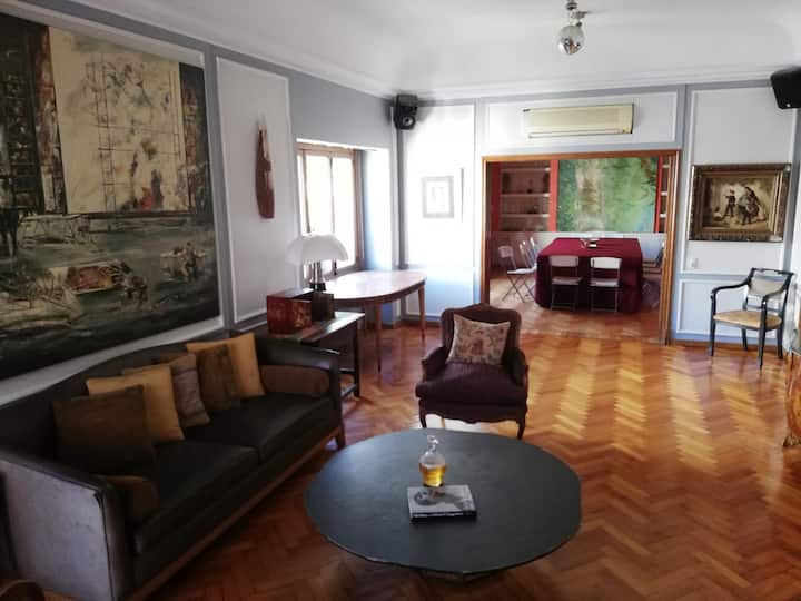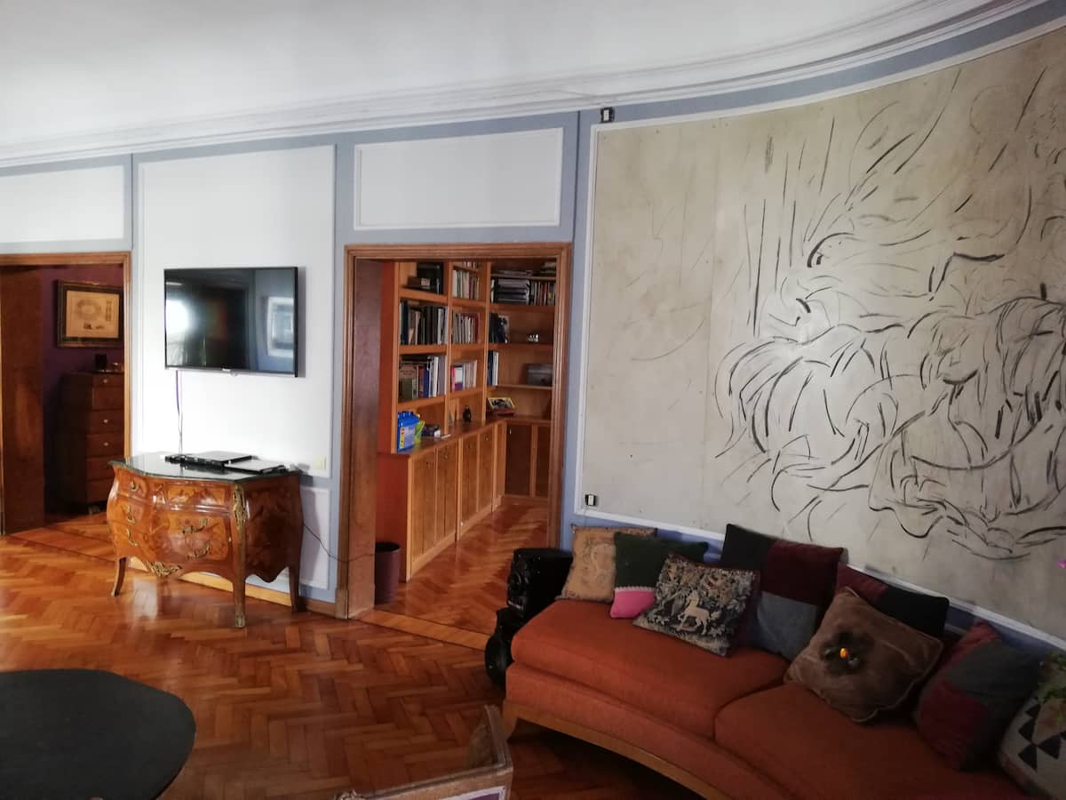 Four-bedroom apartment in Recoleta with air conditioning in each room. Each bedroom has a private en-suite bathroom; the main bedroom has a king-size bed, two bedrooms have queen-size beds, and the fourth has 3 single beds, with an additional two single mattresses available in the library area. The living room has a 40” TV; the dining room has a large table for up to 18 people and there is a well-equipped kitchen with two ovens and two refrigerators. Guests have private access to a terrace with