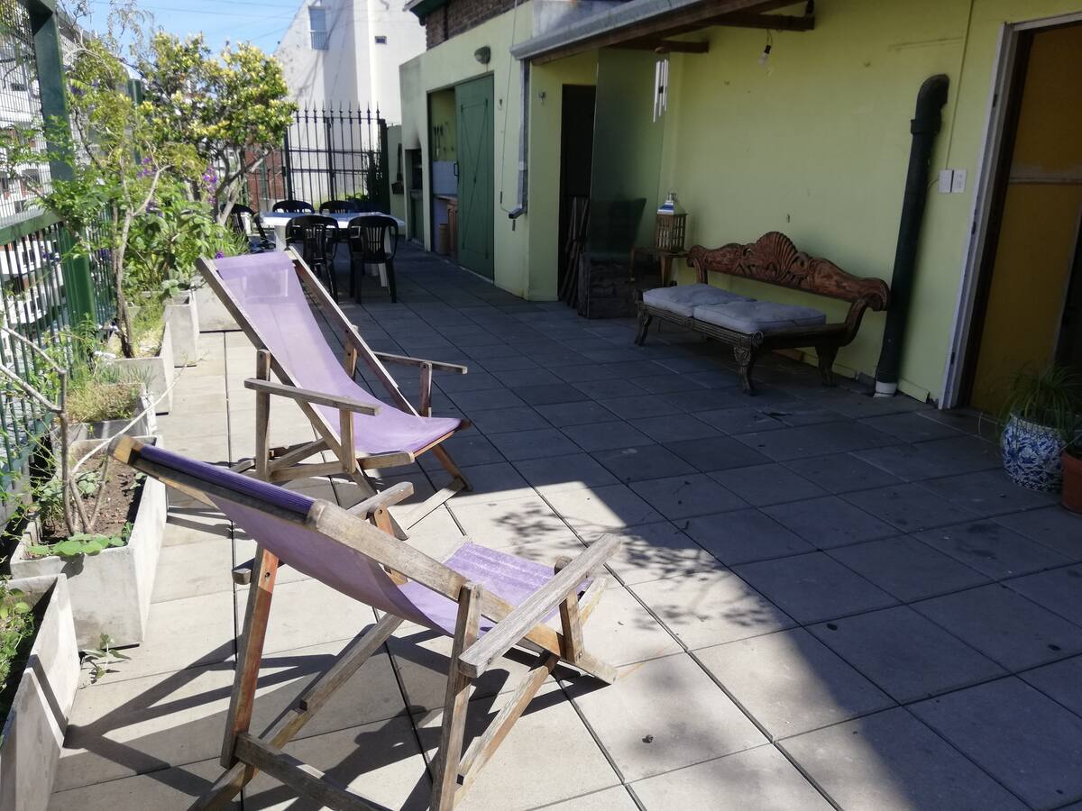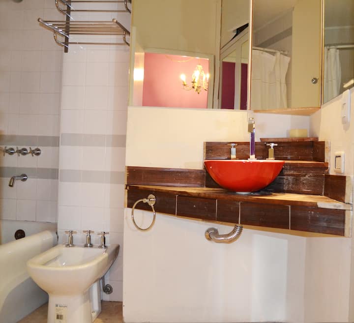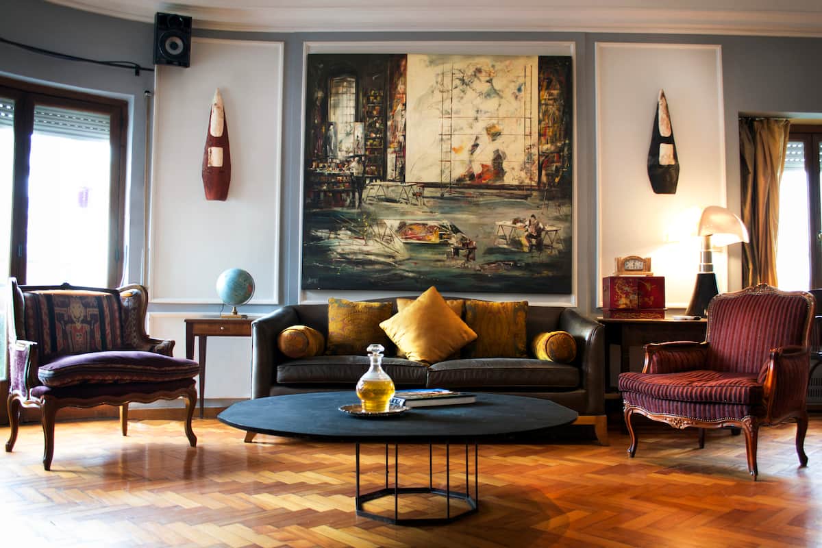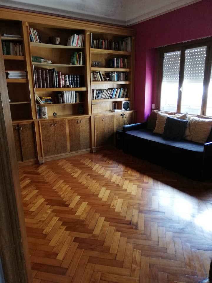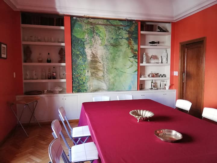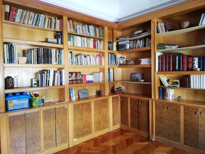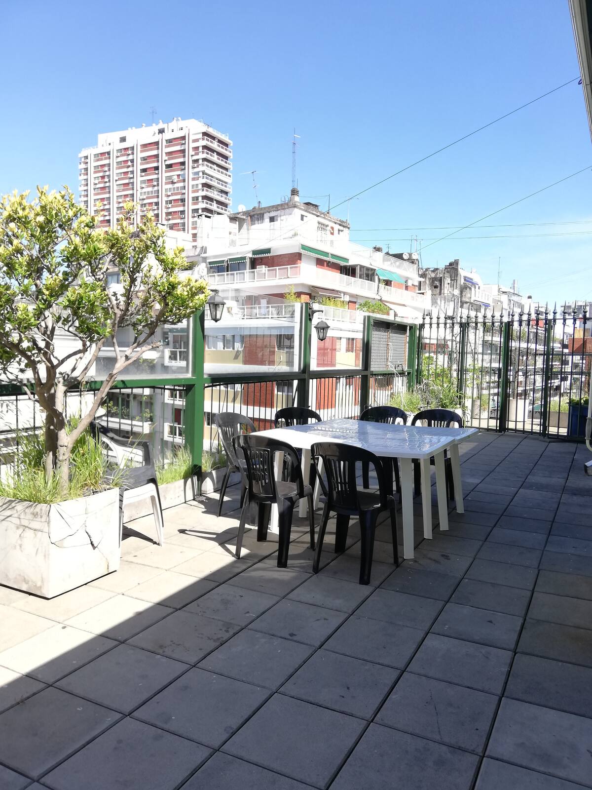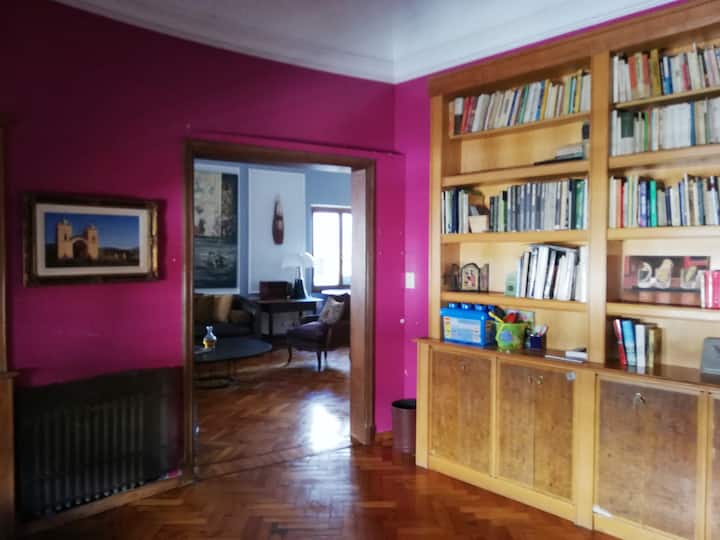 Four-bedroom apartment in Recoleta with air conditioning in each room. Each bedroom has a private en-suite bathroom; the main bedroom has a king-size bed, two bedrooms have queen-size beds, and the fourth has 3 single beds, with an additional two single mattresses available in the library area. The living room has a 40” TV; the dining room has a large table for up to 18 people and there is a well-equipped kitchen with two ovens and two refrigerators. Guests have private access to a terrace with