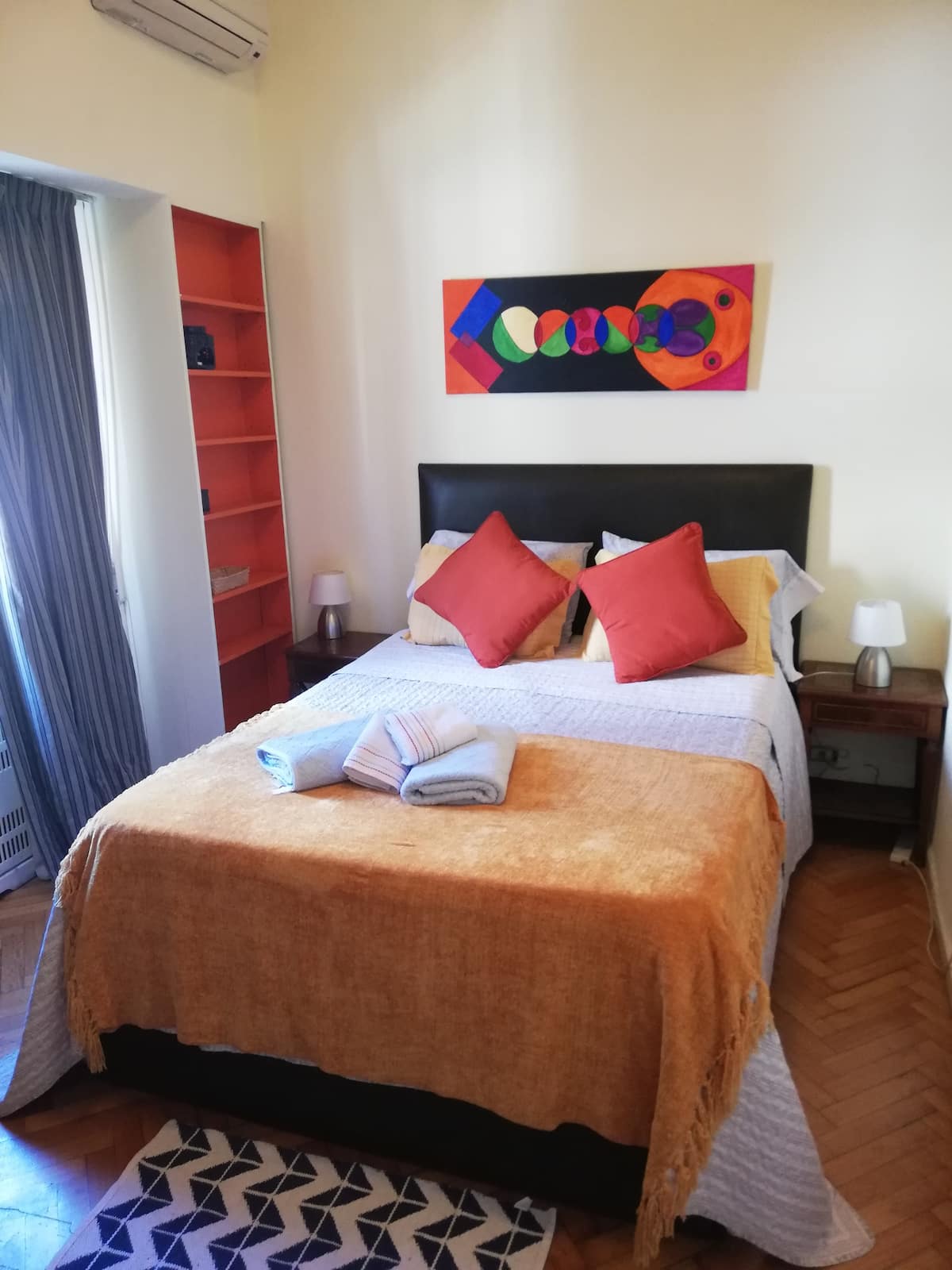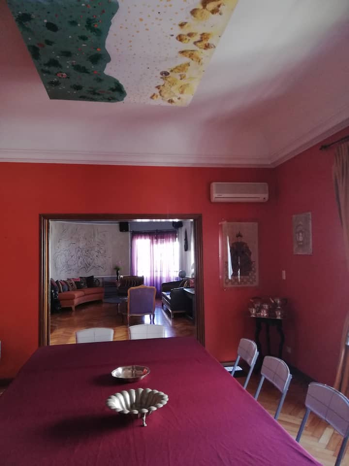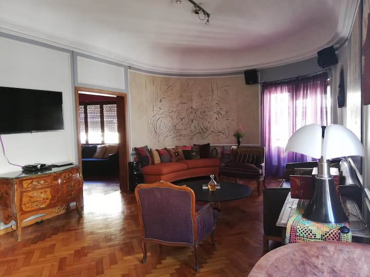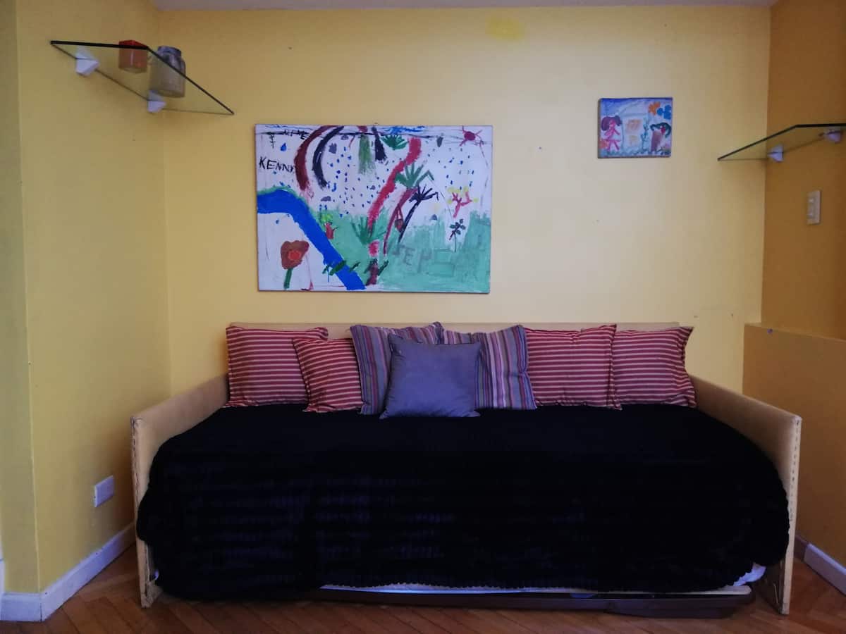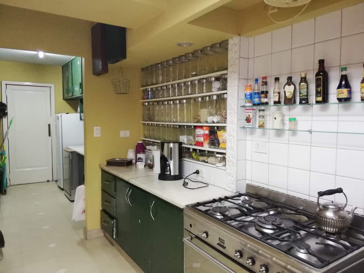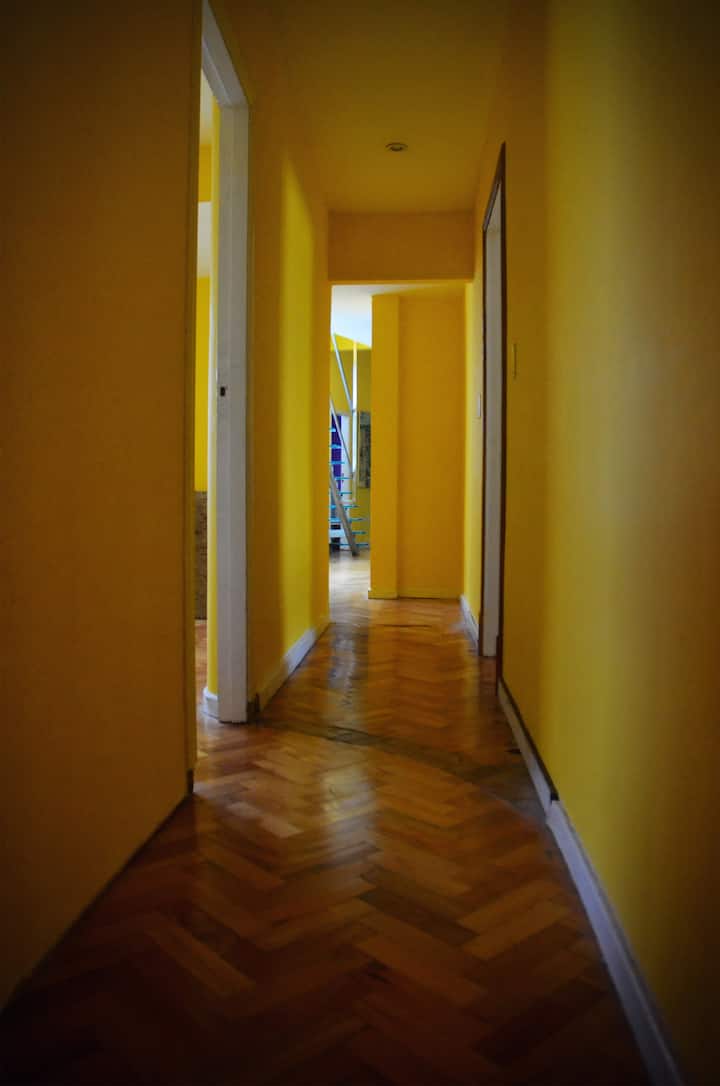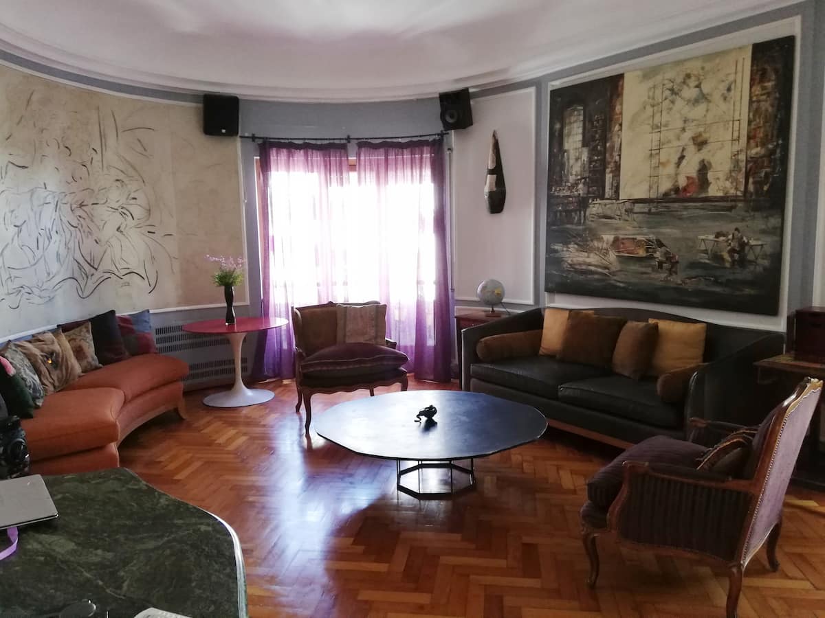Four-bedroom apartment in Recoleta with air conditioning in each room. Each bedroom has a private en-suite bathroom; the main bedroom has a king-size bed, two bedrooms have queen-size beds, and the fourth has 3 single beds, with an additional two single mattresses available in the library area. The living room has a 40” TV; the dining room has a large table for up to 18 people and there is a well-equipped kitchen with two ovens and two refrigerators. Guests have private access to a terrace with