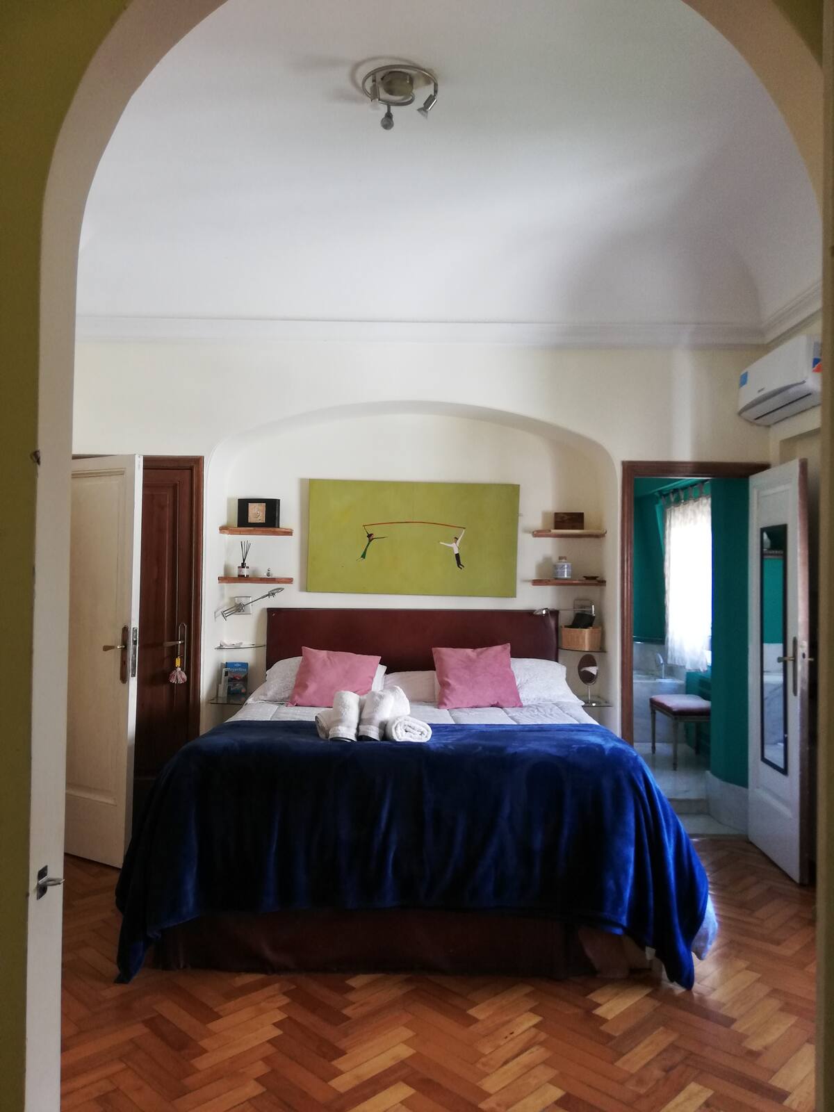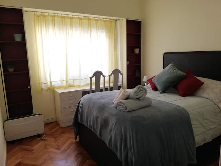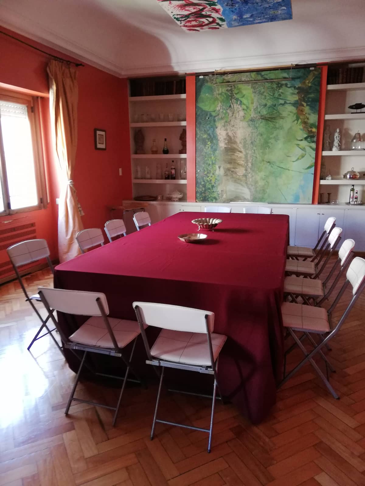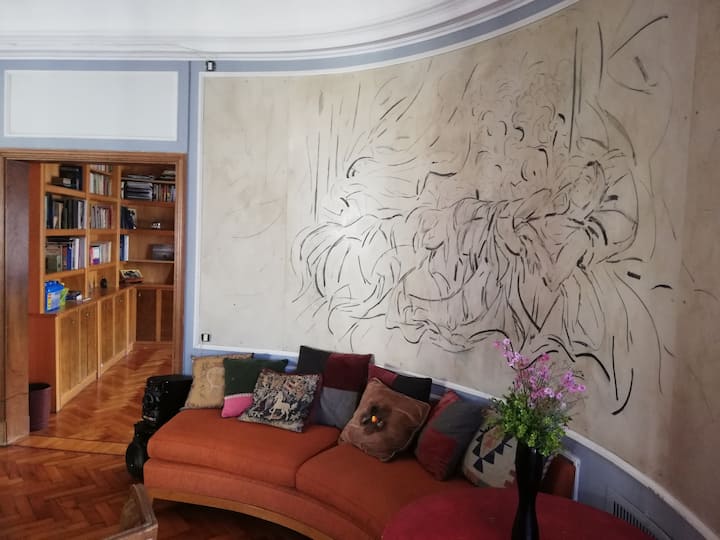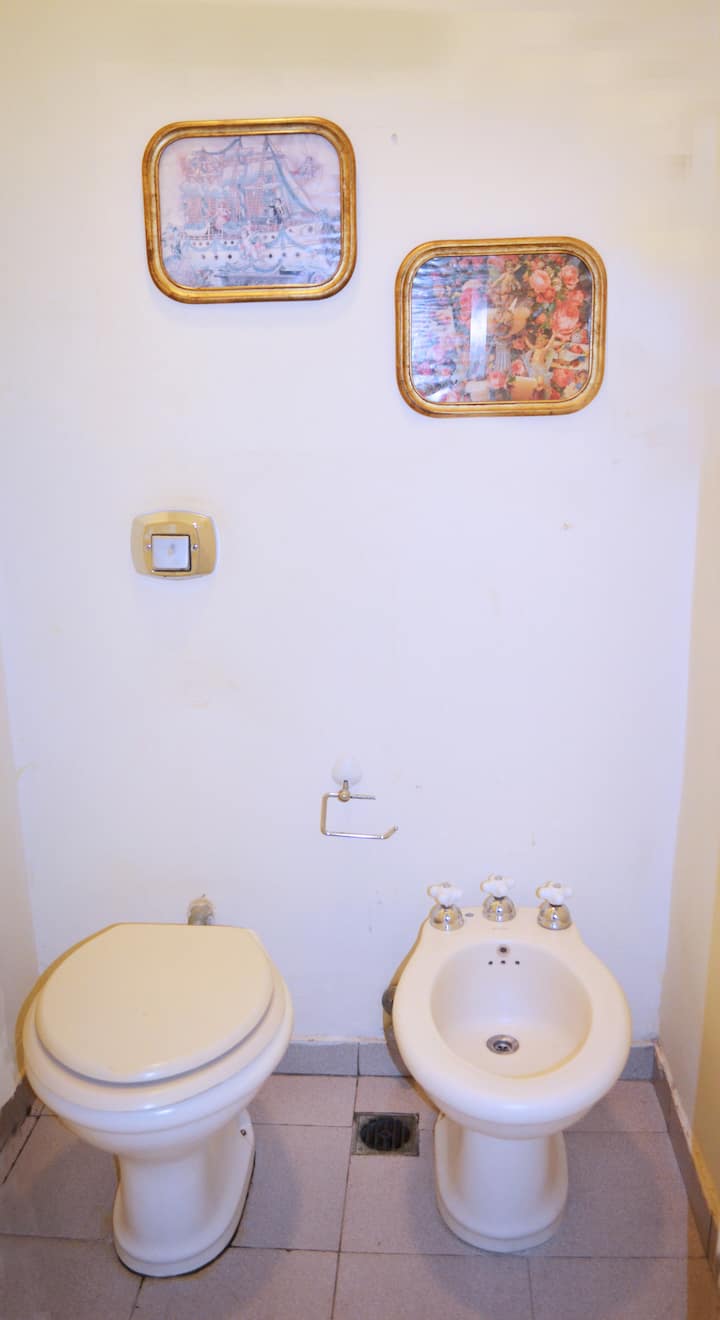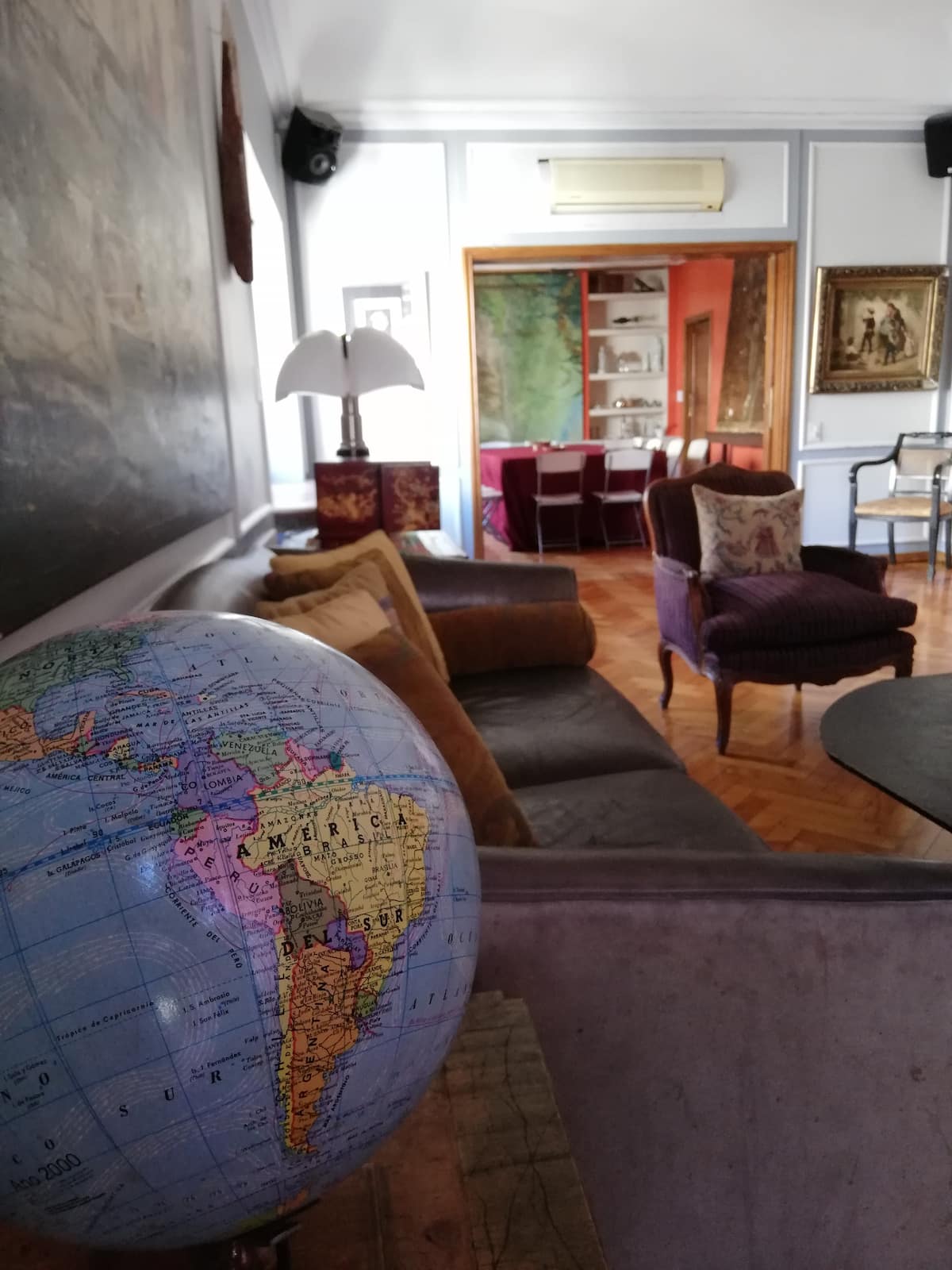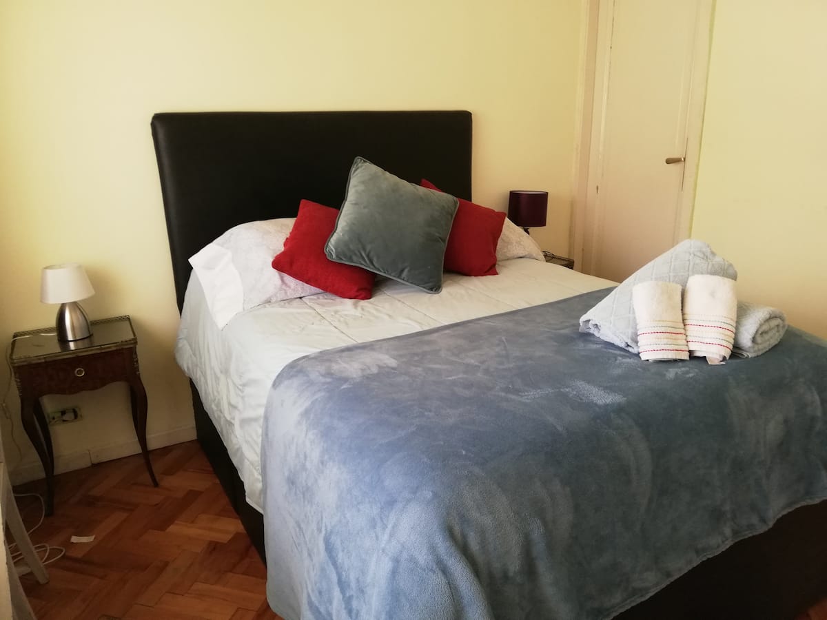 Four-bedroom apartment in Recoleta with air conditioning in each room. Each bedroom has a private en-suite bathroom; the main bedroom has a king-size bed, two bedrooms have queen-size beds, and the fourth has 3 single beds, with an additional two single mattresses available in the library area. The living room has a 40” TV; the dining room has a large table for up to 18 people and there is a well-equipped kitchen with two ovens and two refrigerators. Guests have private access to a terrace with