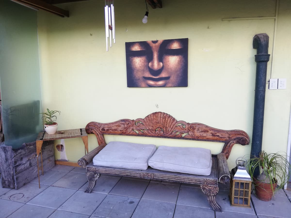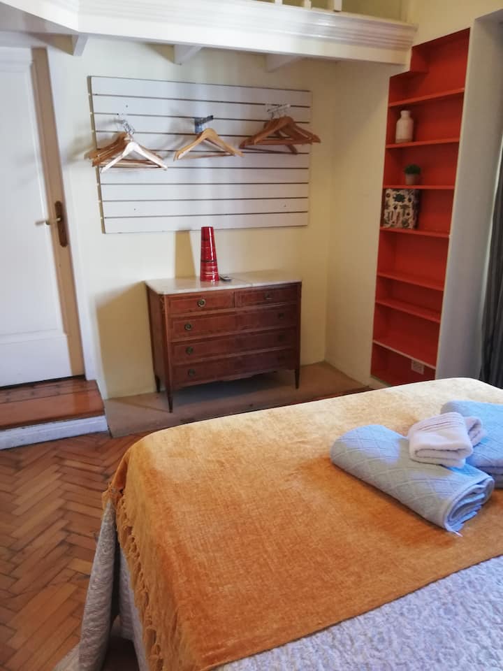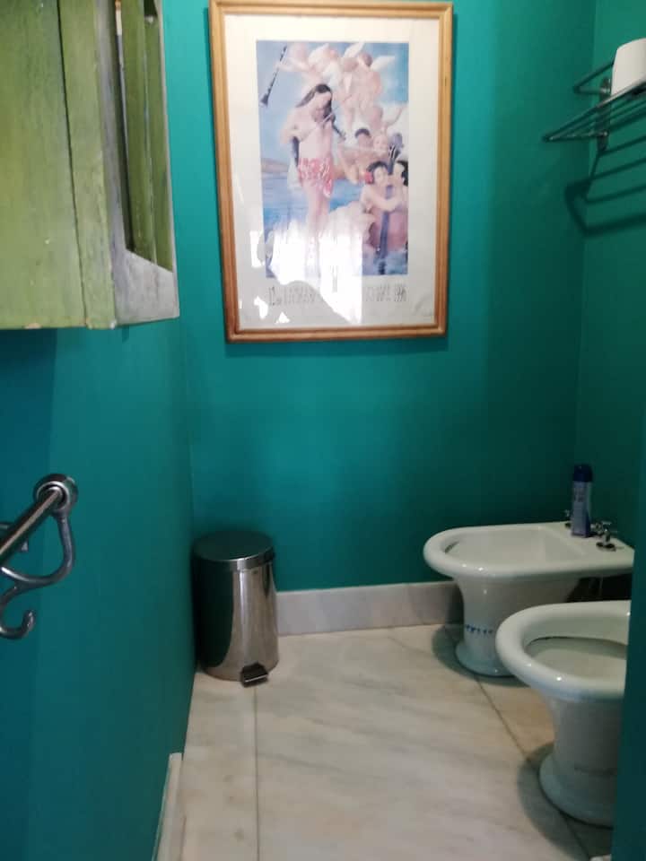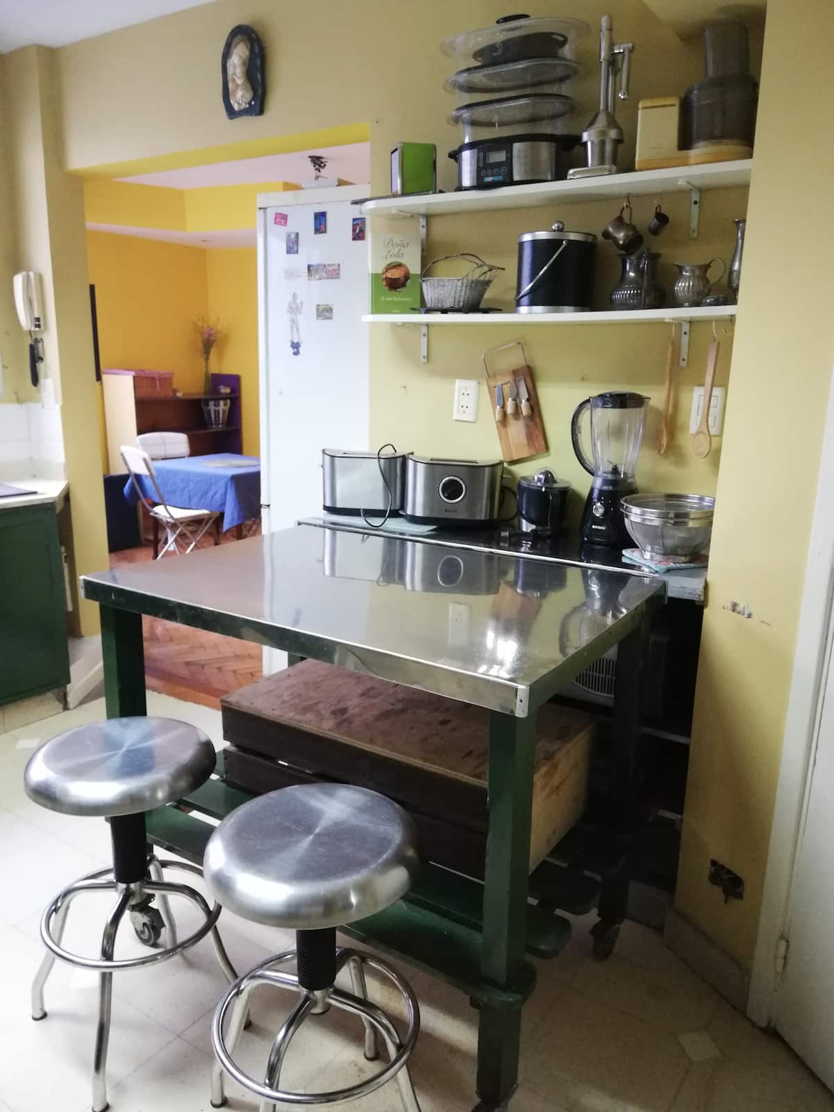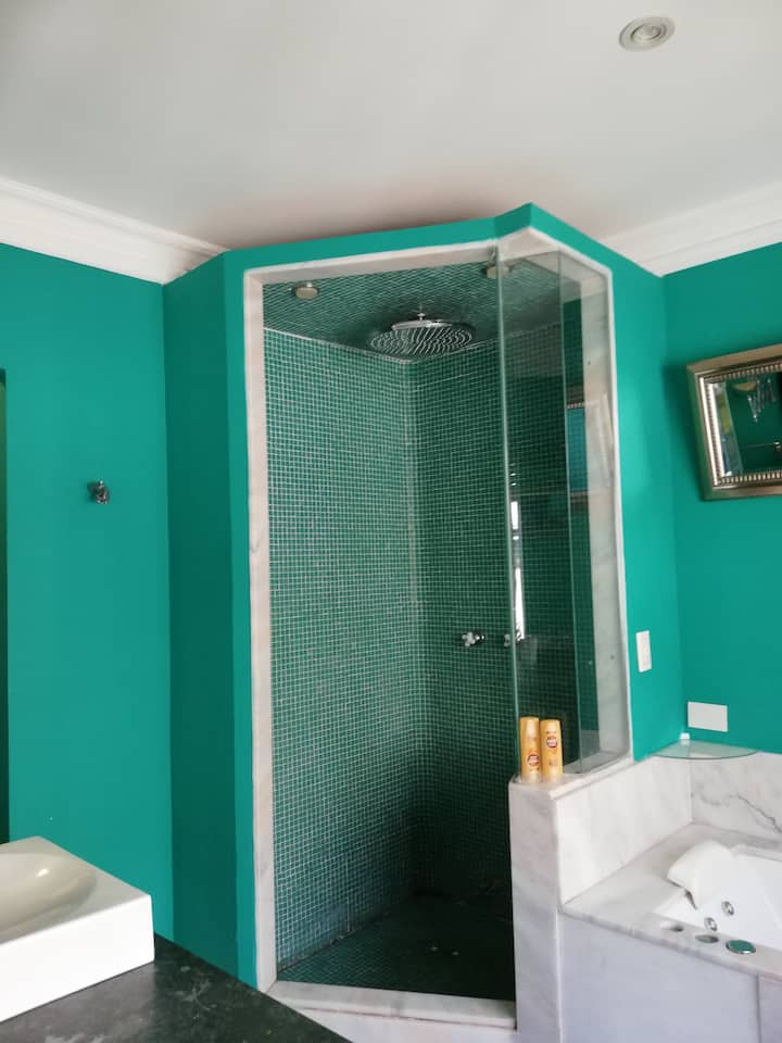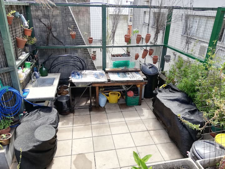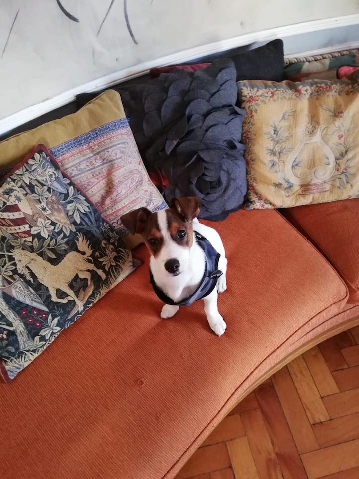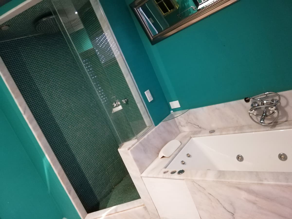 Four-bedroom apartment in Recoleta with air conditioning in each room. Each bedroom has a private en-suite bathroom; the main bedroom has a king-size bed, two bedrooms have queen-size beds, and the fourth has 3 single beds, with an additional two single mattresses available in the library area. The living room has a 40” TV; the dining room has a large table for up to 18 people and there is a well-equipped kitchen with two ovens and two refrigerators. Guests have private access to a terrace with