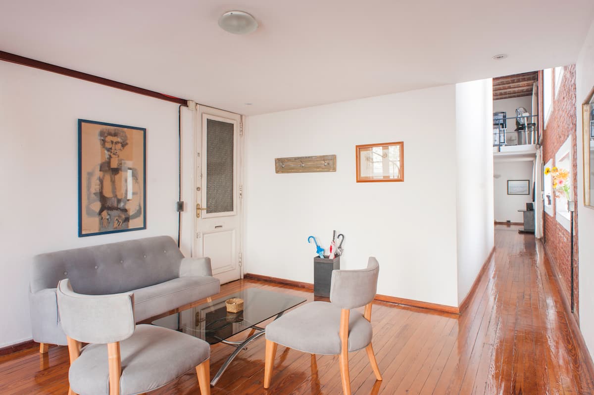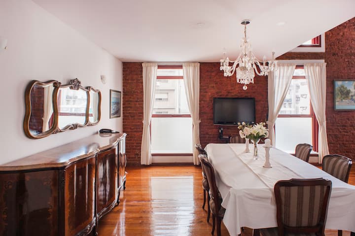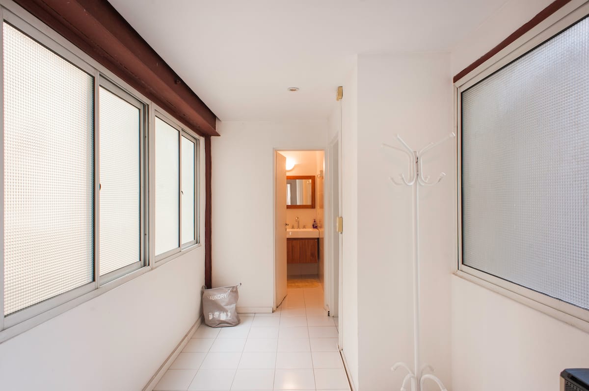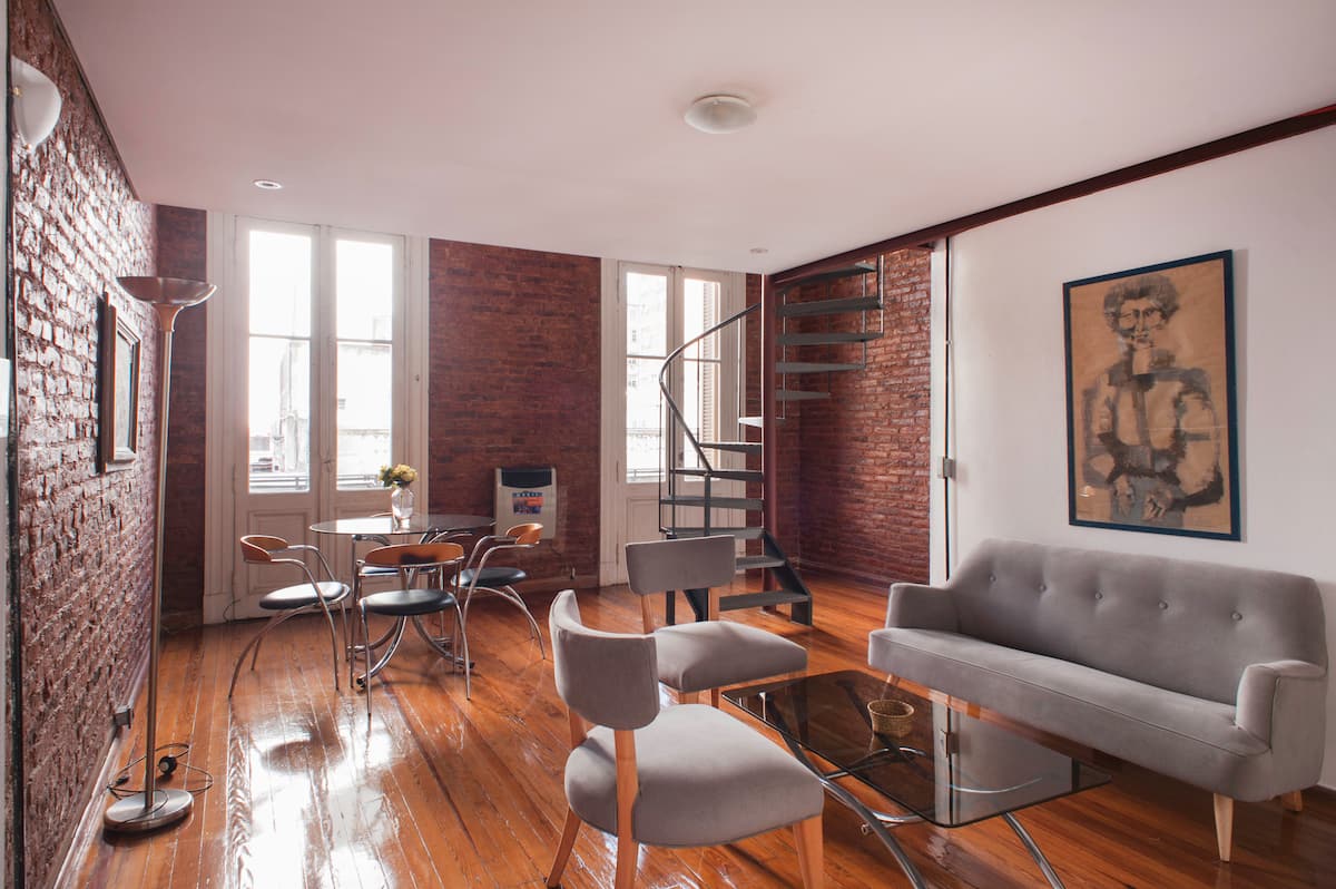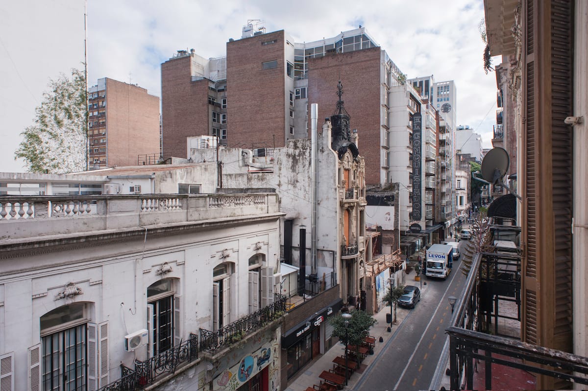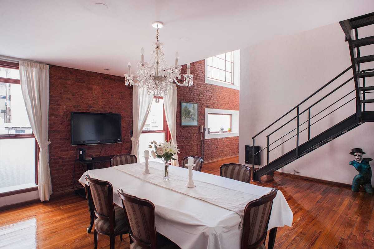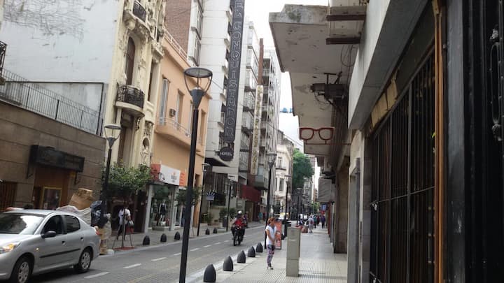 Apartment with 180 m² on two floors in Retiro, reported as very bright. It includes a spacious living room and a large reception area. There are 4 bedrooms (one double, one triple, two single) plus a common space with a futon for 2 people, and 2 full bathrooms. Internet with Wi‑Fi, cable TV, and a landline phone are mentioned. An alarm is included, and the reception has a balcony facing the street. Located 100 metres from Av 9 de Julio, Av Santa Fe and Av Córdoba, and 400 metres from Subte lines
