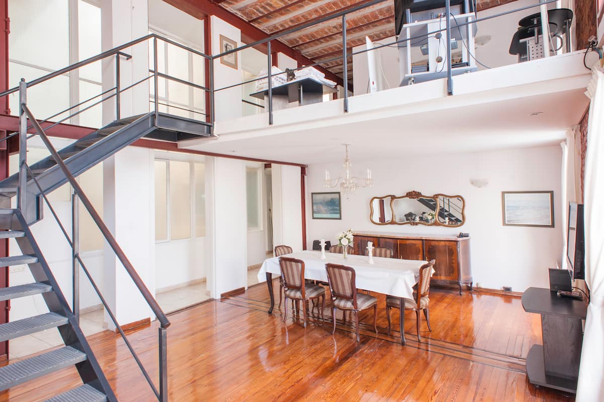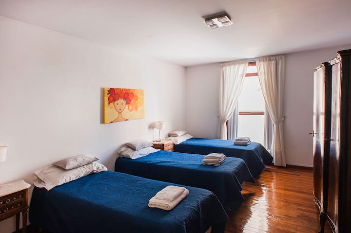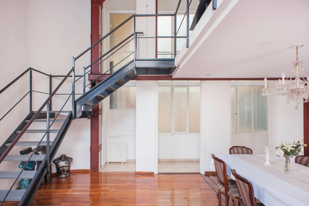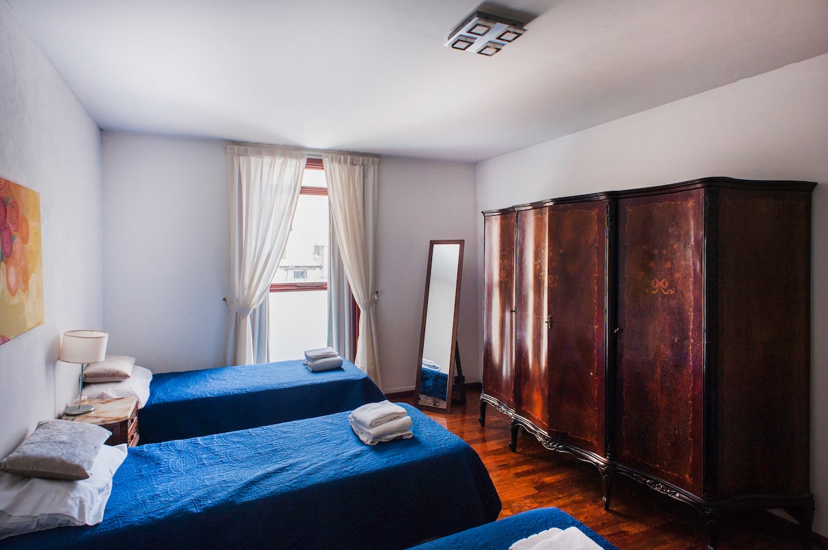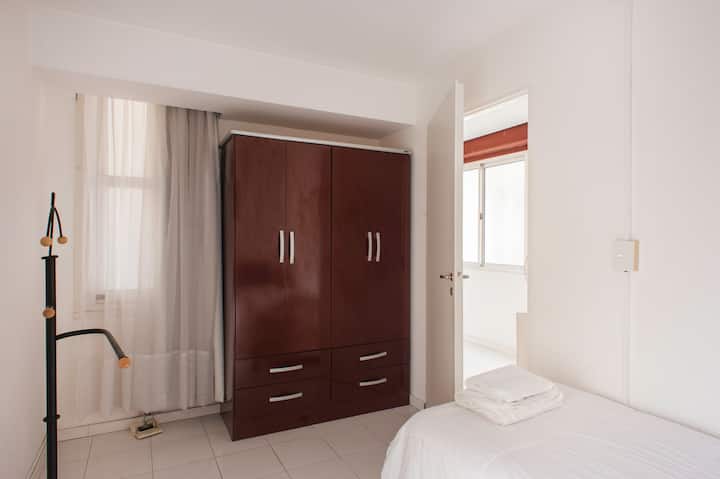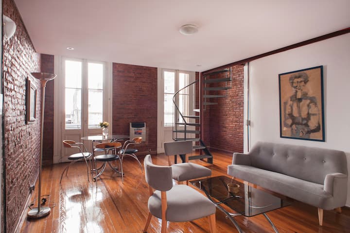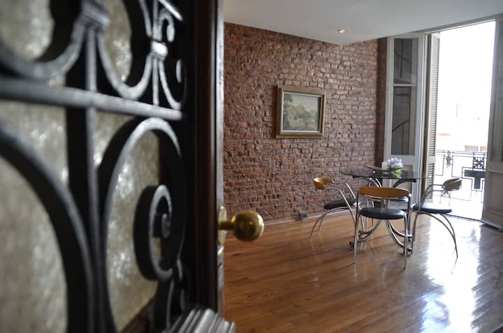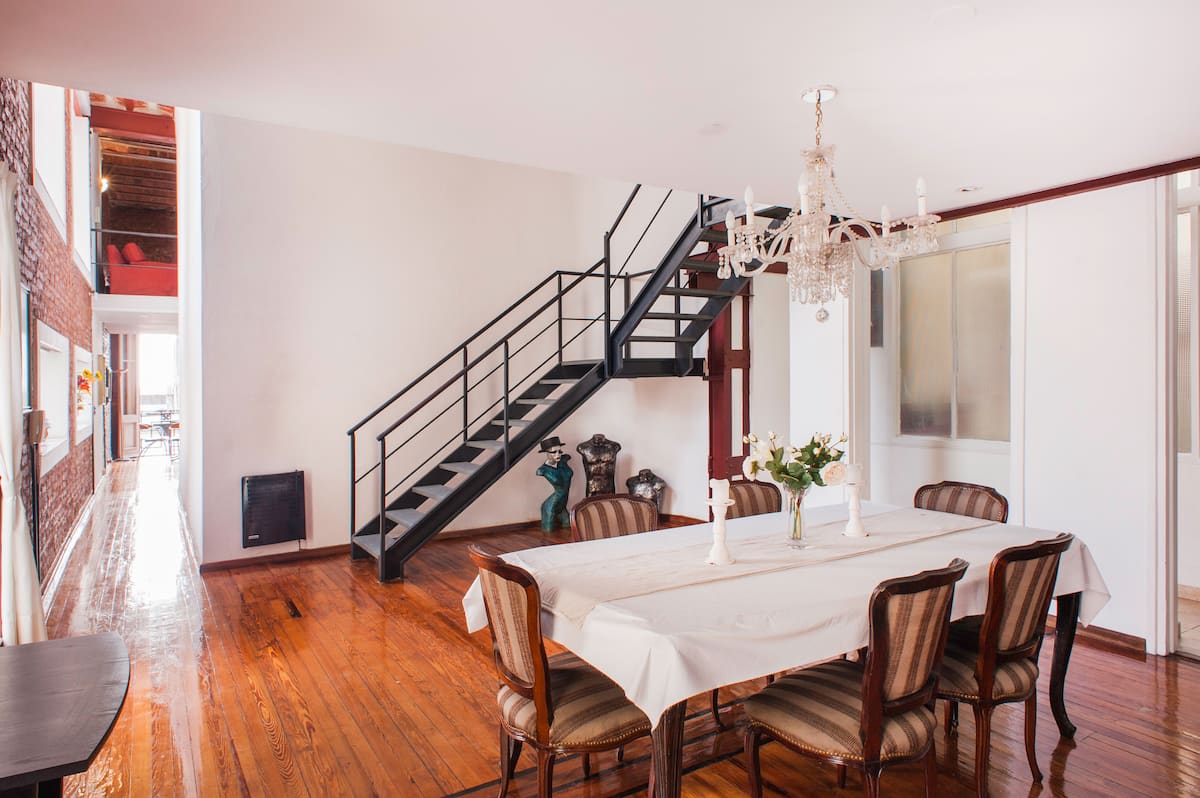 Apartment with 180 m² on two floors in Retiro, reported as very bright. It includes a spacious living room and a large reception area. There are 4 bedrooms (one double, one triple, two single) plus a common space with a futon for 2 people, and 2 full bathrooms. Internet with Wi‑Fi, cable TV, and a landline phone are mentioned. An alarm is included, and the reception has a balcony facing the street. Located 100 metres from Av 9 de Julio, Av Santa Fe and Av Córdoba, and 400 metres from Subte lines