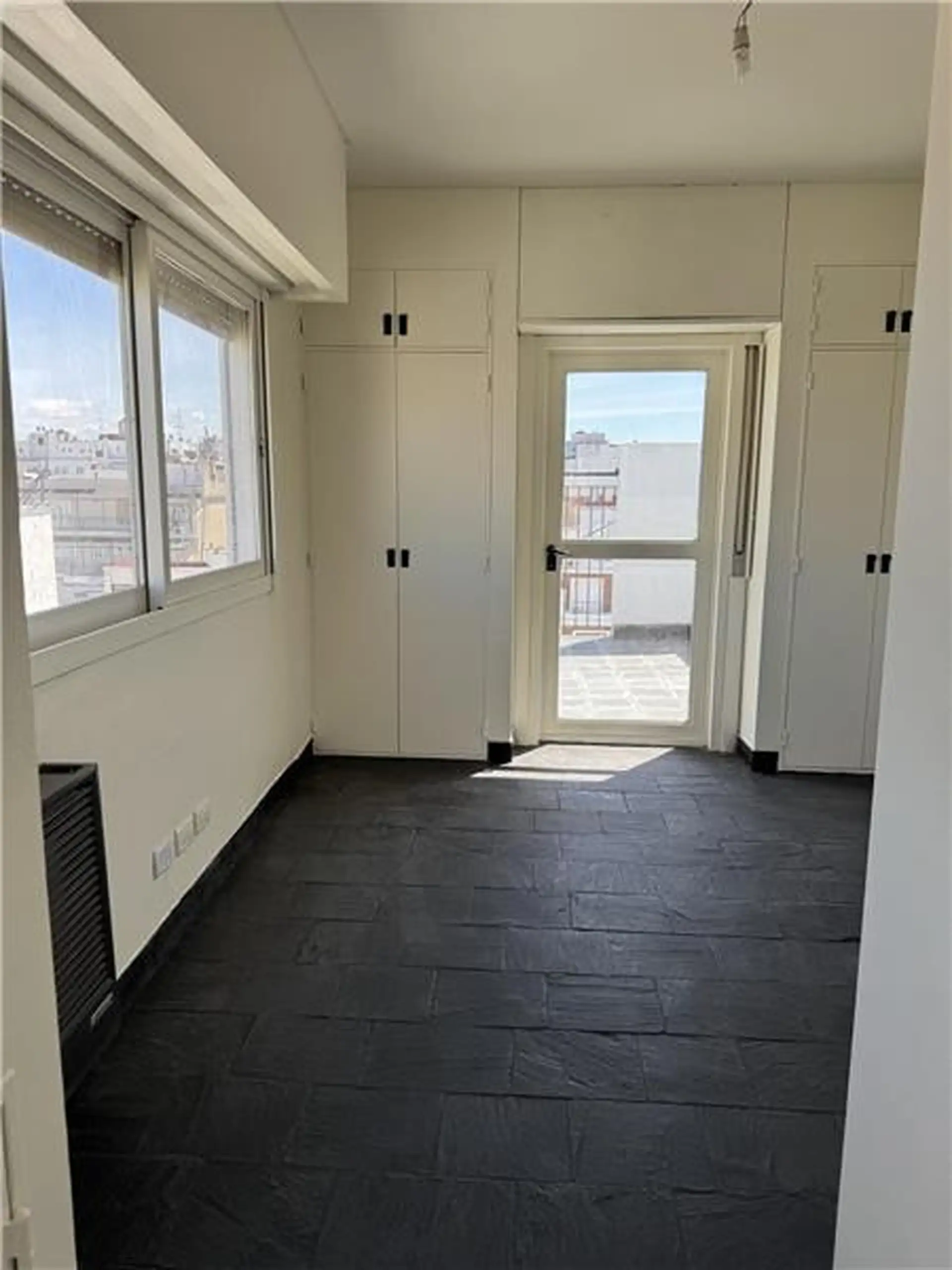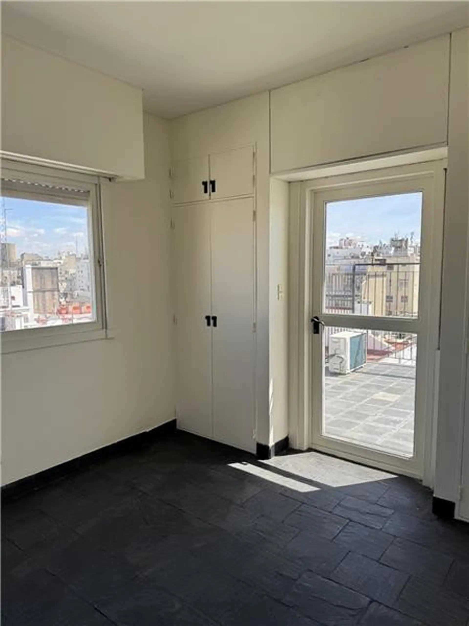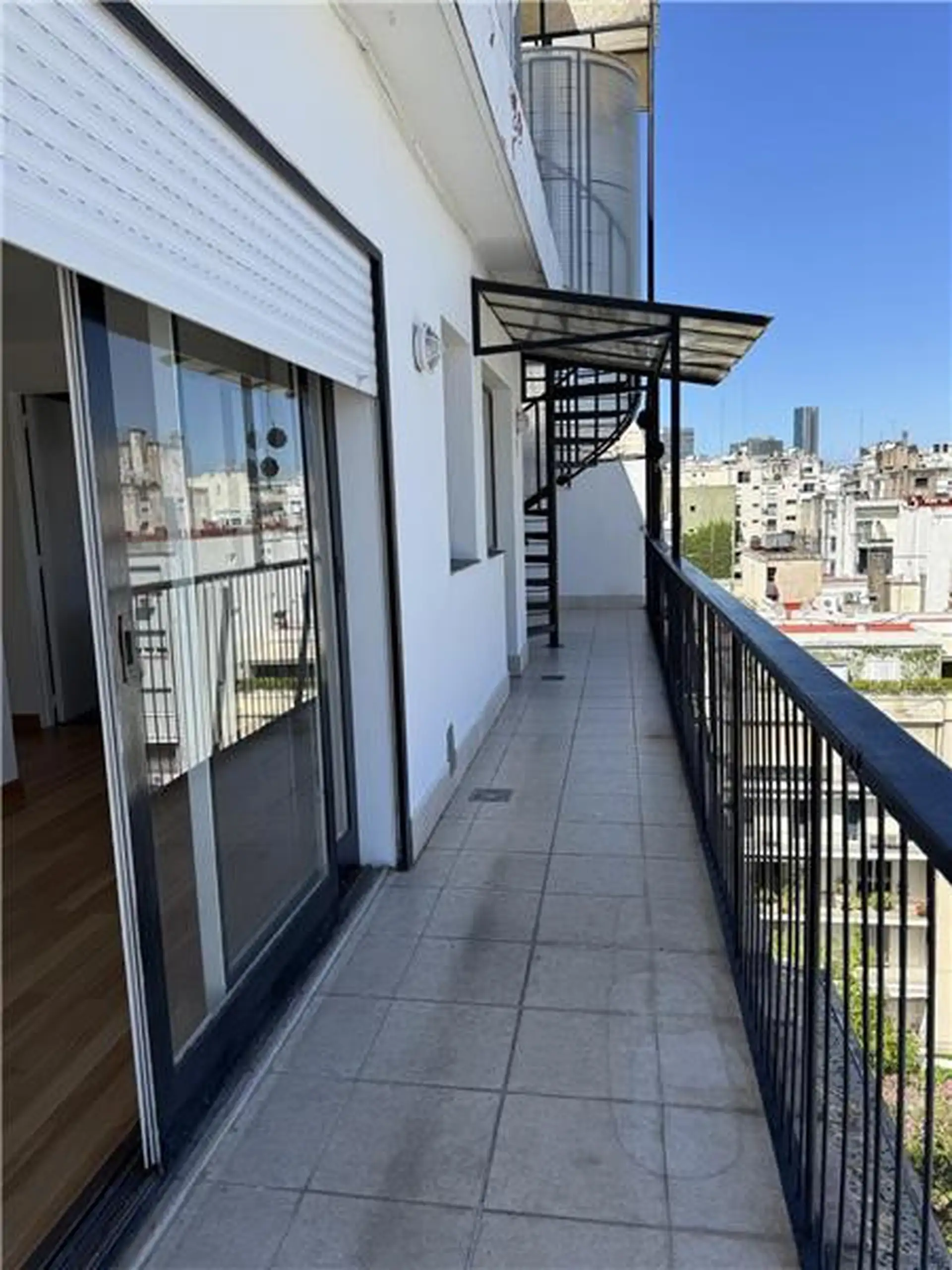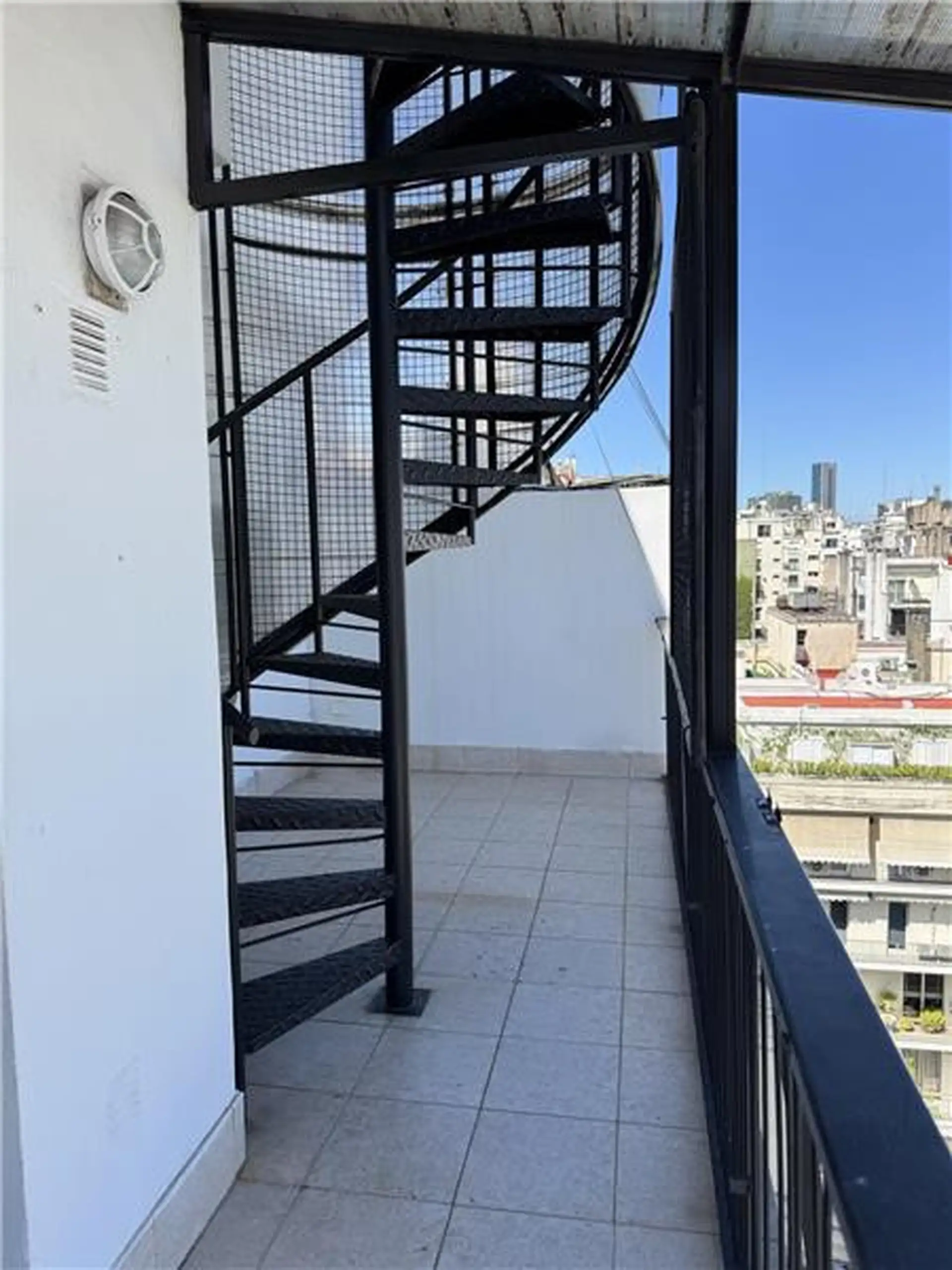 Duplex apartment with a 98 m² total area for exclusive use. On the 12th floor it has a living-dining room with a balcony, two bedrooms and a bathroom, plus a separate service kitchen and quarters. The balcony has a spiral staircase leading to two additional bedrooms and a bathroom on an upper terrace. The building offers 24-hour security.