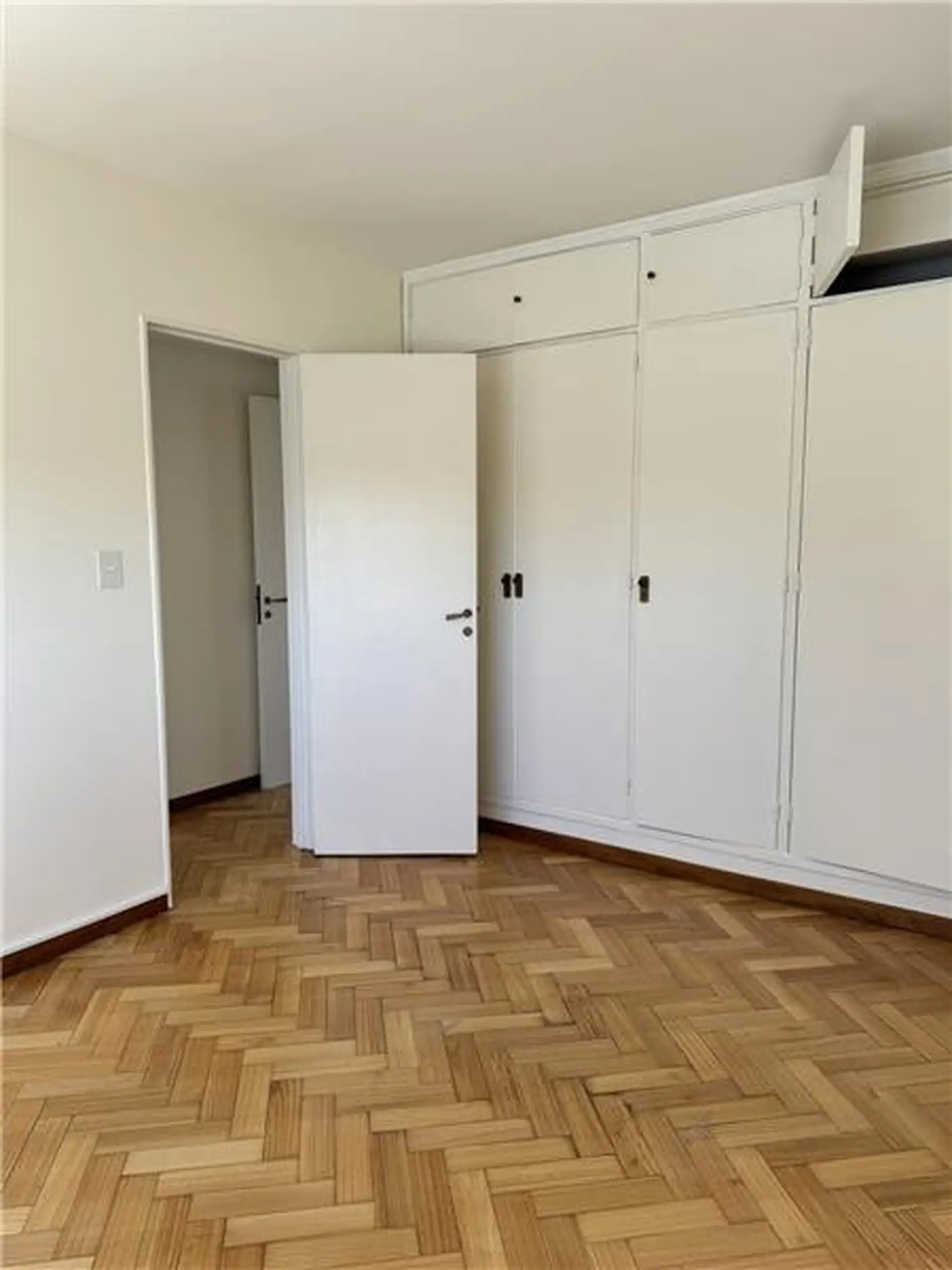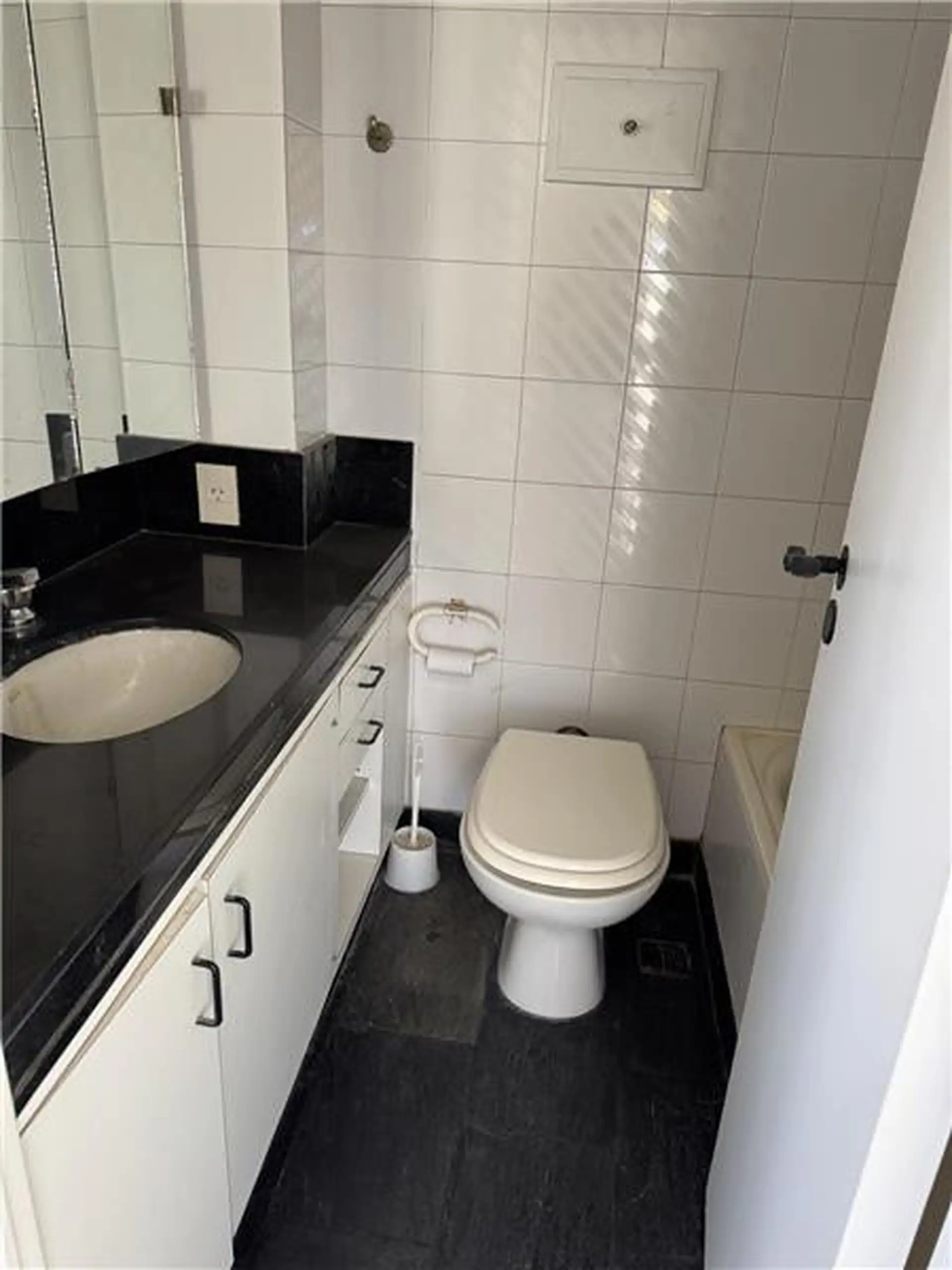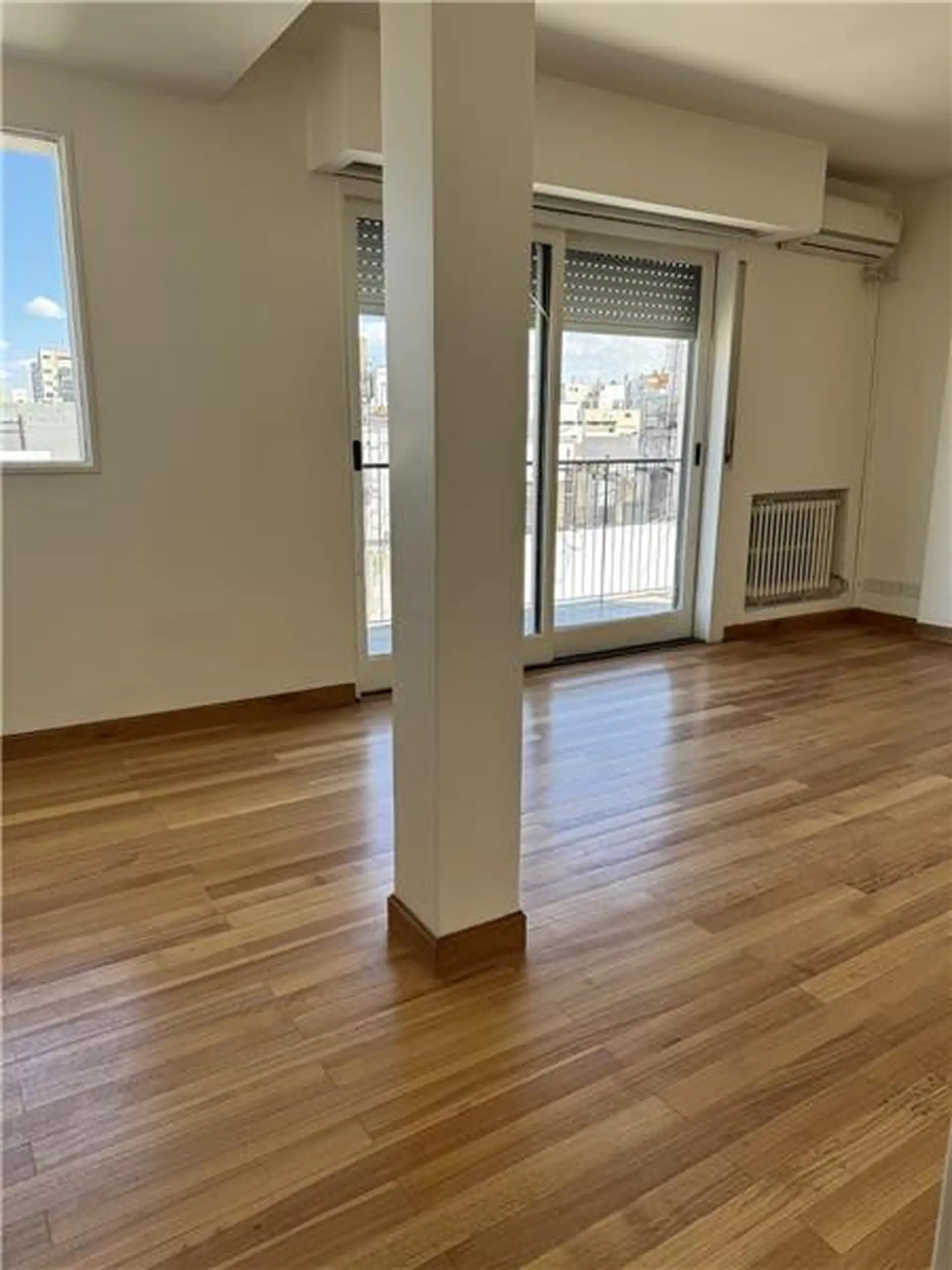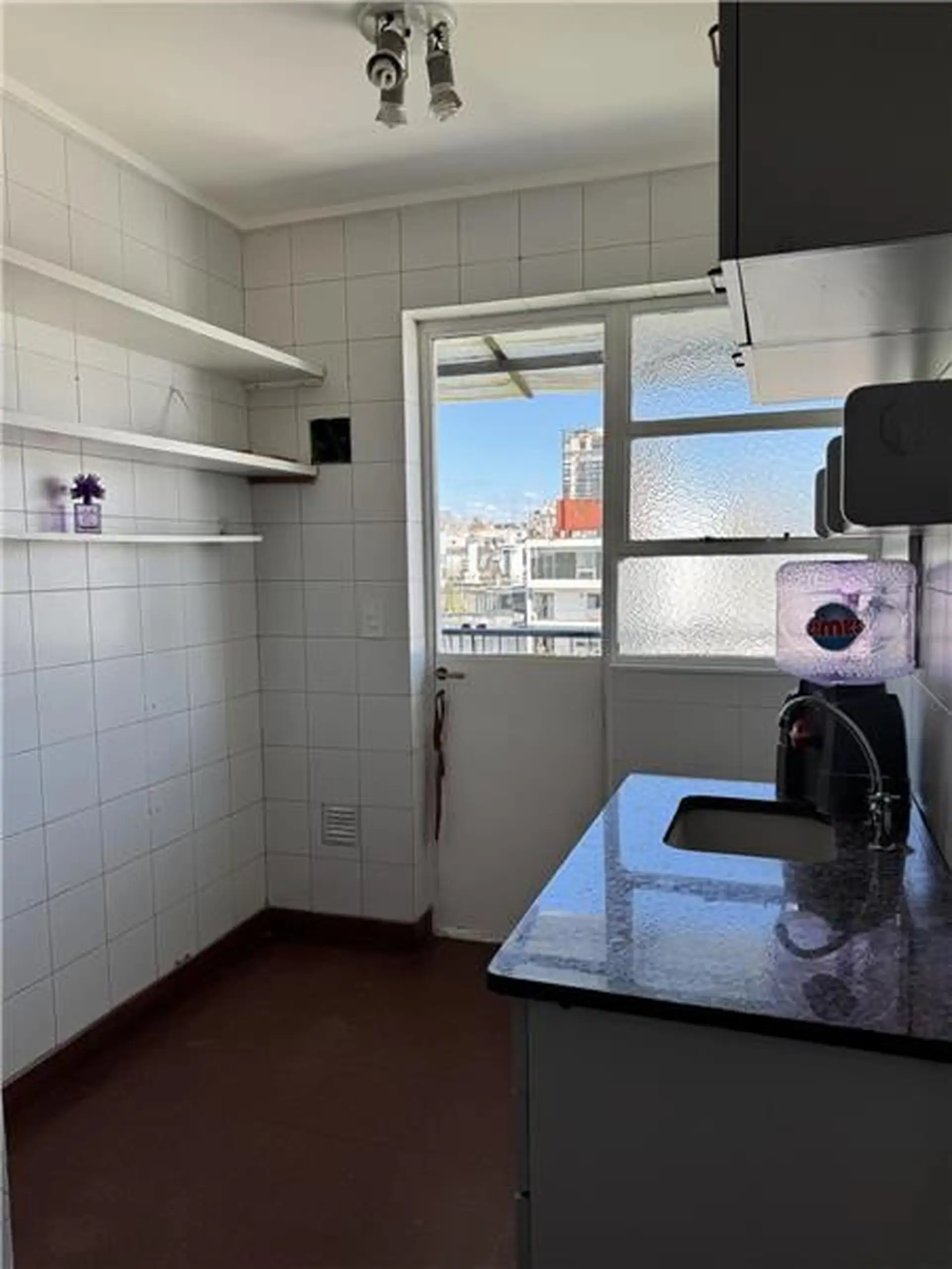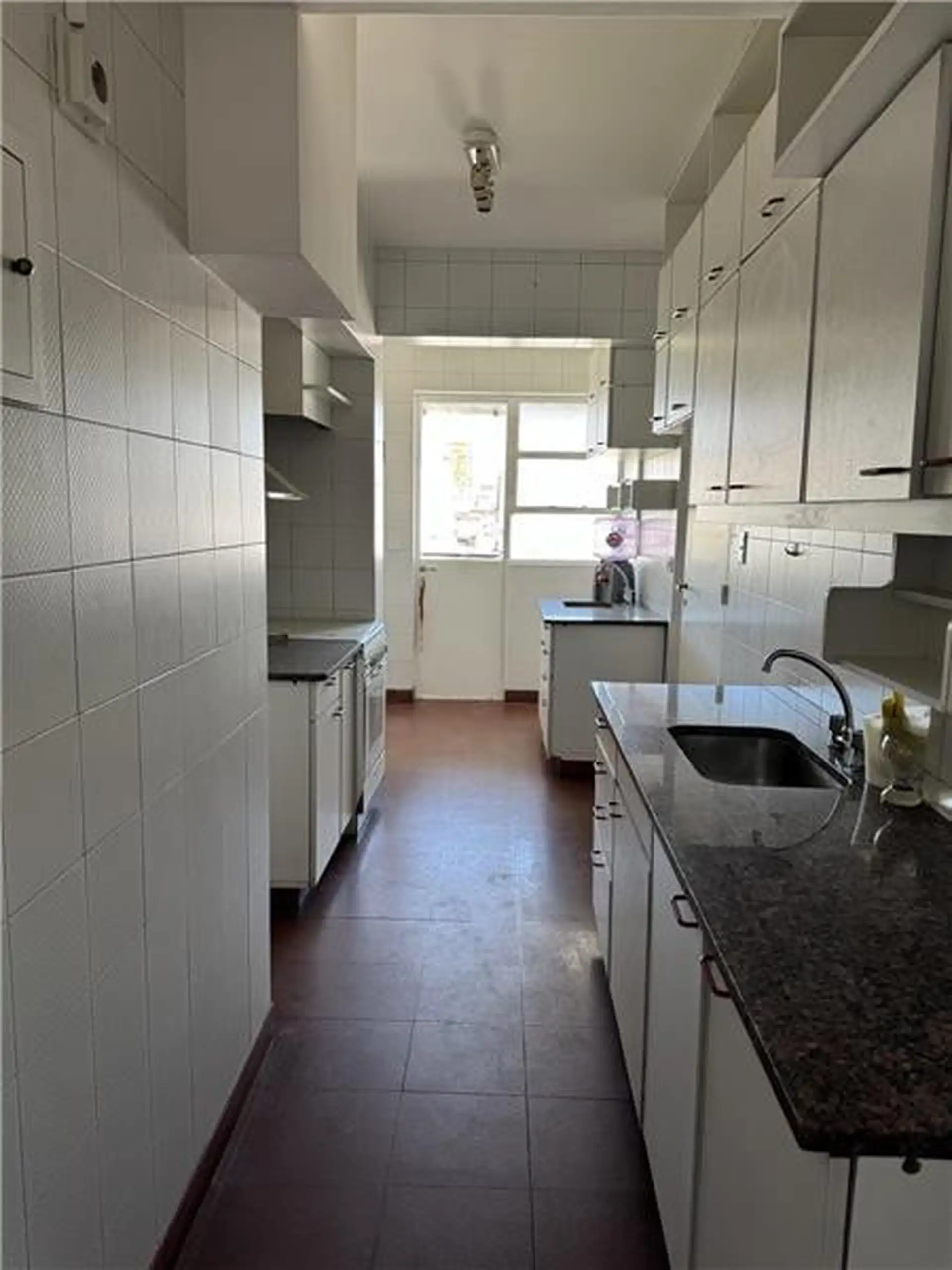 Duplex apartment with a 98 m² total area for exclusive use. On the 12th floor it has a living-dining room with a balcony, two bedrooms and a bathroom, plus a separate service kitchen and quarters. The balcony has a spiral staircase leading to two additional bedrooms and a bathroom on an upper terrace. The building offers 24-hour security.