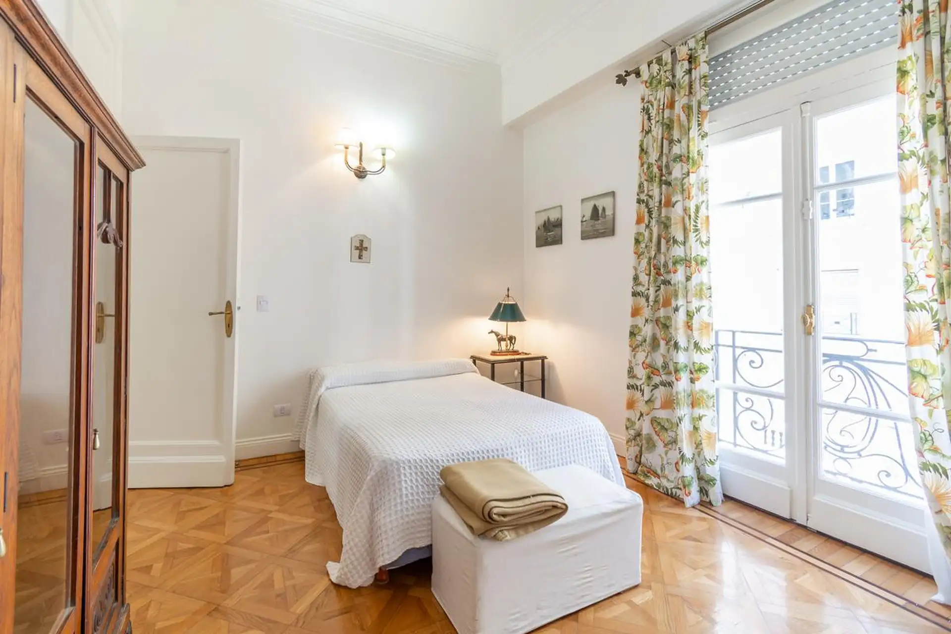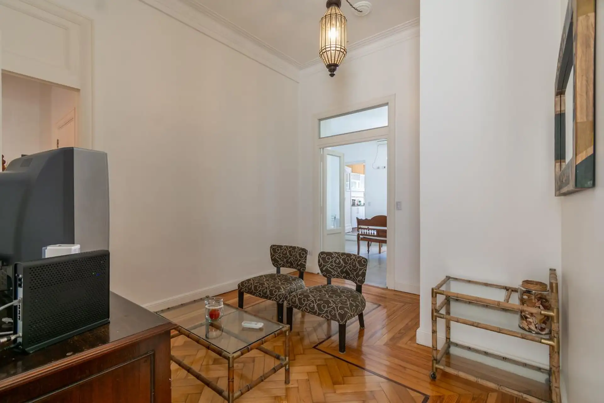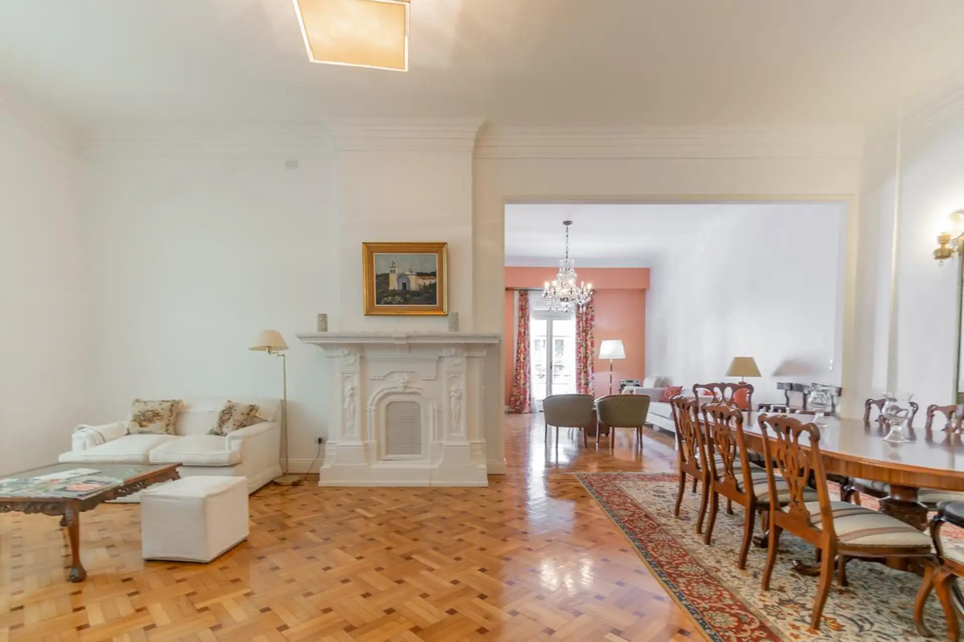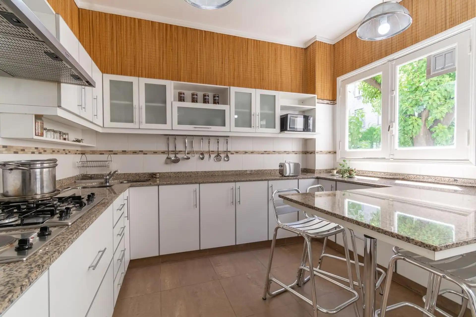 Four-bedroom apartment in Recoleta (Arenales y Libertad), 250 m² (RAM). Available from 1 May 2026. Large front reception with period-style windows and double-height ceilings, plus two additional living areas. Primary suite with double bed and en-suite bathroom, with courtyard-facing views; other bedrooms include an additional bathroom in two of them. Rebuilt modern kitchen with fridge, washer and dishwasher, plus dining area with garden views and a rear terrace on the top floor with a grill. Uti