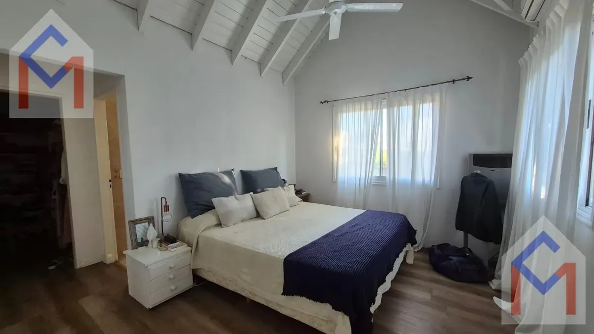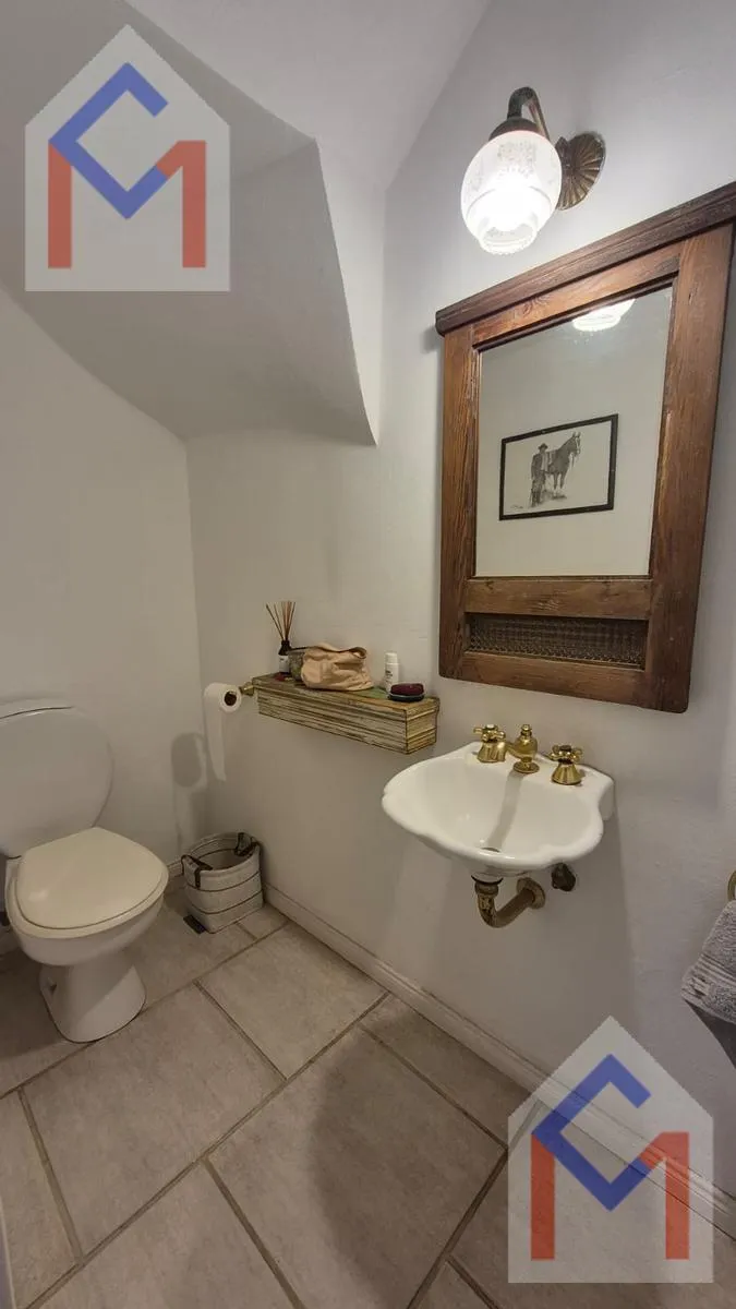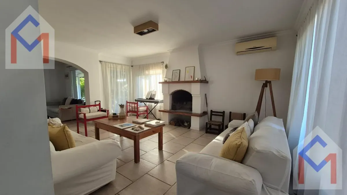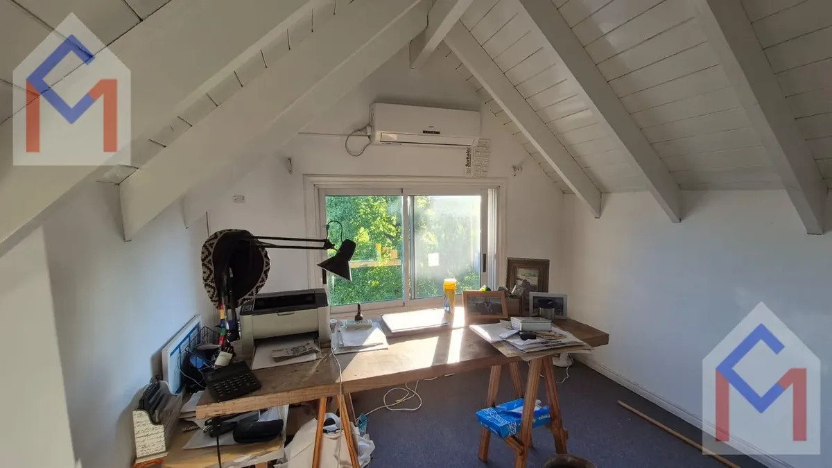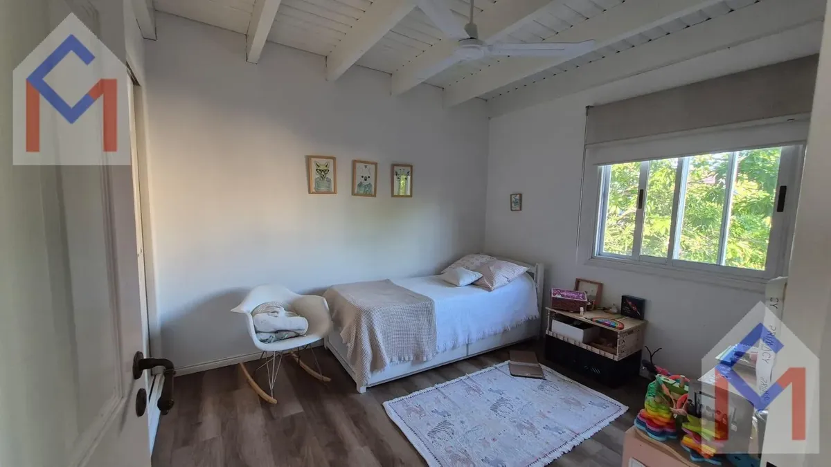 House in the closed neighbourhood Tres Horquetas. 550 m² plot with west-facing orientation and access by the main route. Three levels: ground floor with entry hall, living room with fireplace, dining room, guest toilet, large kitchen with family and breakfast areas, separate laundry, and service quarters with bathroom. Upstairs has three bedrooms, including a master suite with dressing room and two bedrooms sharing a full bathroom. Third level features a playroom and an additional bedroom with b