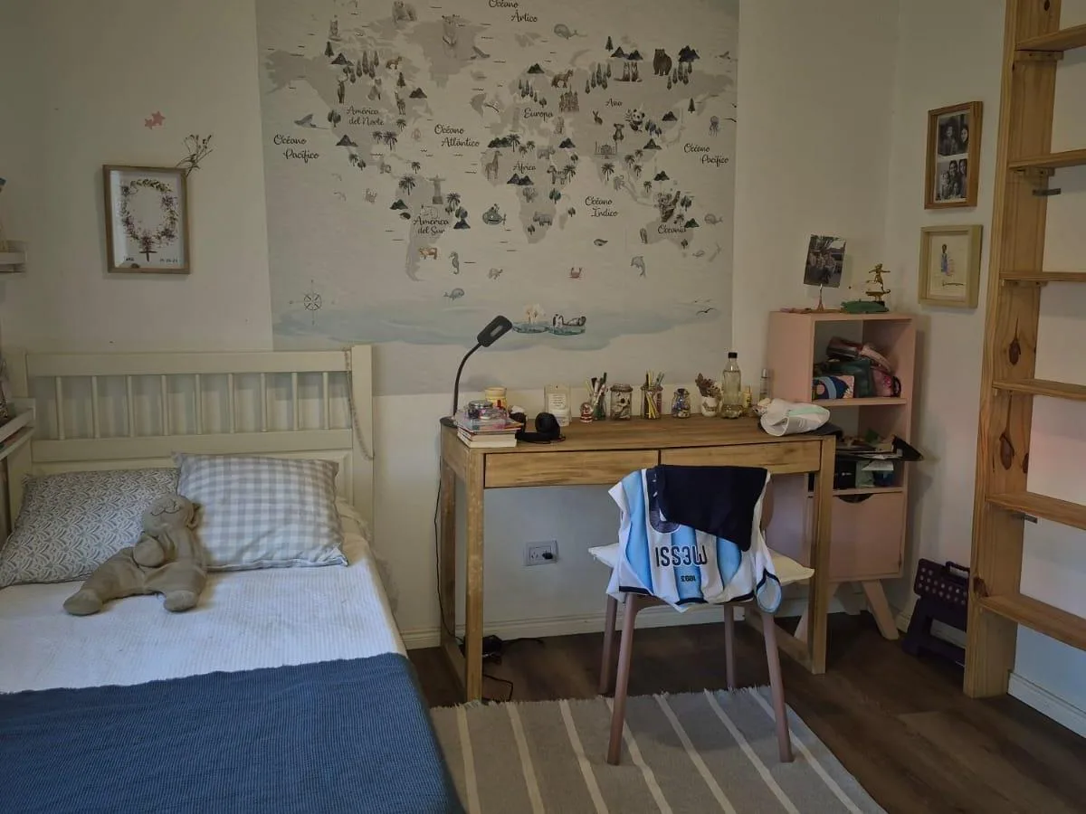 House in the Tres Horquetas gated community in San Fernando, on a 550 m² lot with west-facing orientation. The property is spread over three levels. Ground floor: entrance hall, living room with fireplace, dining room, guest toilet, a large kitchen with family area and breakfast nook, separate laundry room and staff quarters with a bathroom. Upper floor: three bedrooms, including a master suite with walk-in closet; the other two bedrooms share a full bathroom. Third floor: playroom and an additi