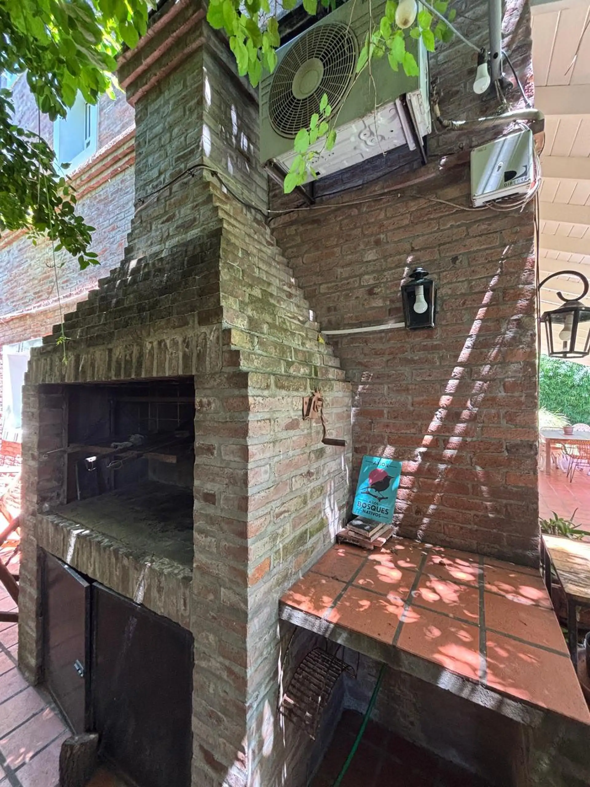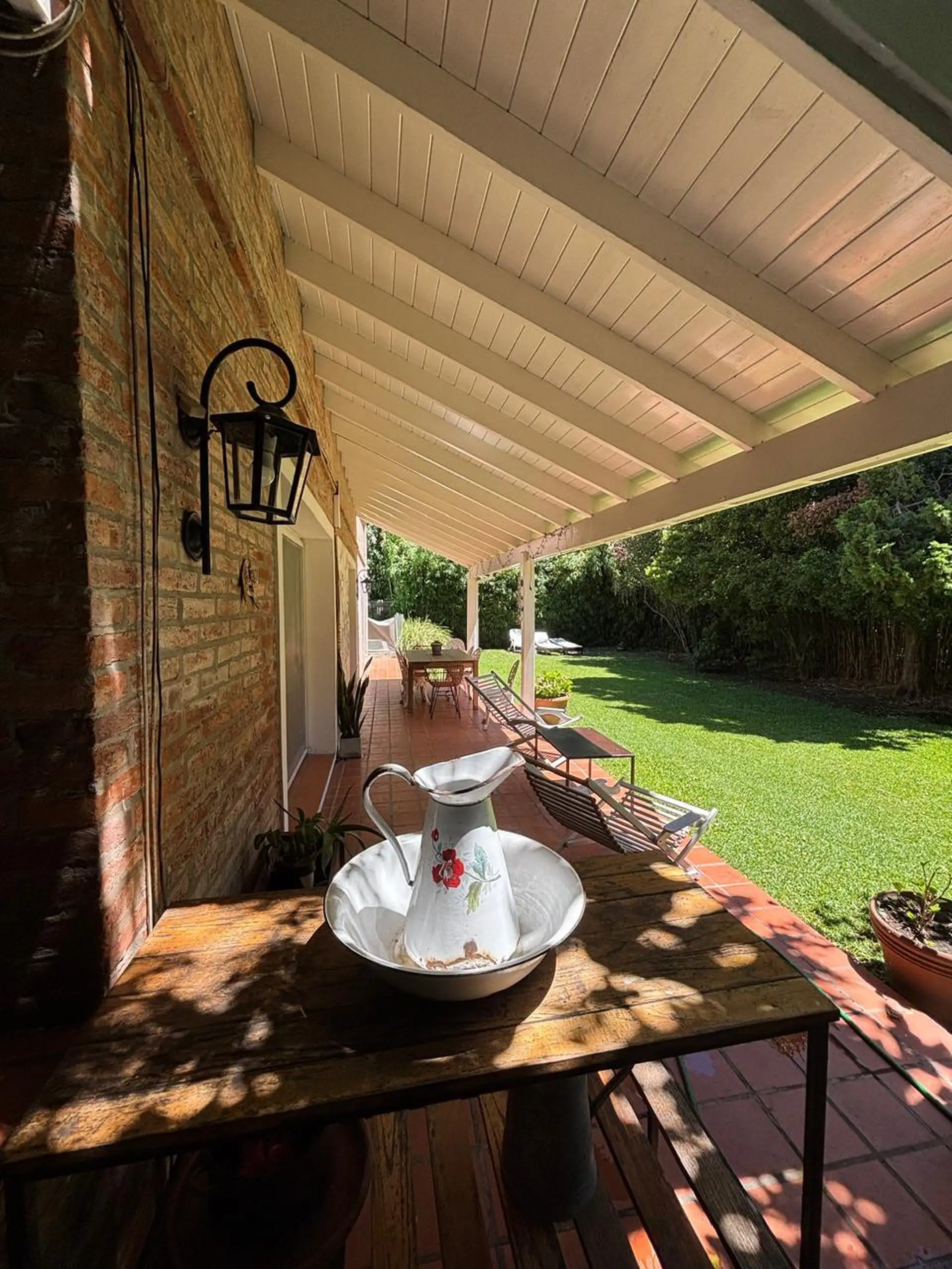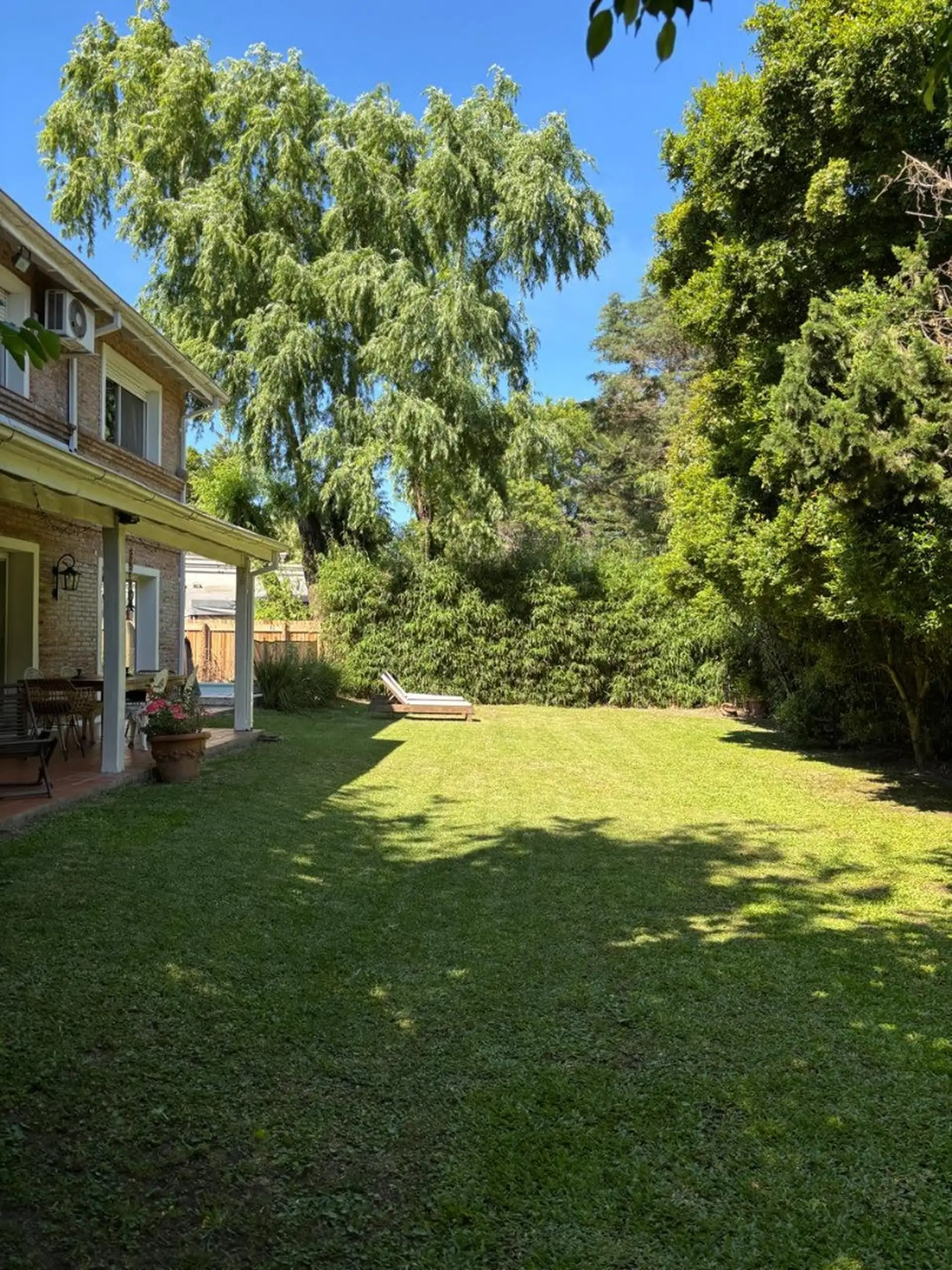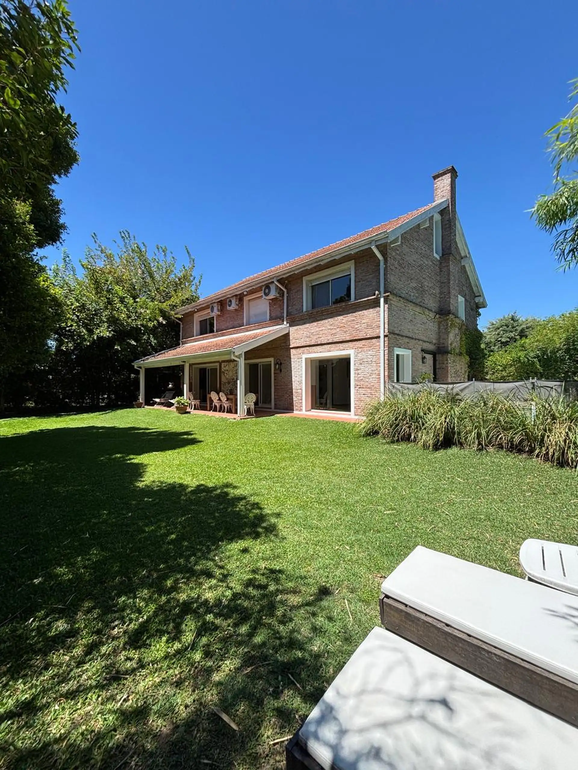 Chalet-style house in the gated community Rincon del Arca, set over 3 storeys. Ground floor has a lapacho floor, fireplace, a reception toilet, an L-shaped living-dining room with air conditioning, a modern kitchen with a daily dining area, access to a gallery and large windows to the garden, plus a full laundry and a service bedroom with a shower bathroom. The first floor includes a distribution hall with a desk and air conditioning, 4 bedrooms (2 en suite) with a main suite featuring a jacuzzi