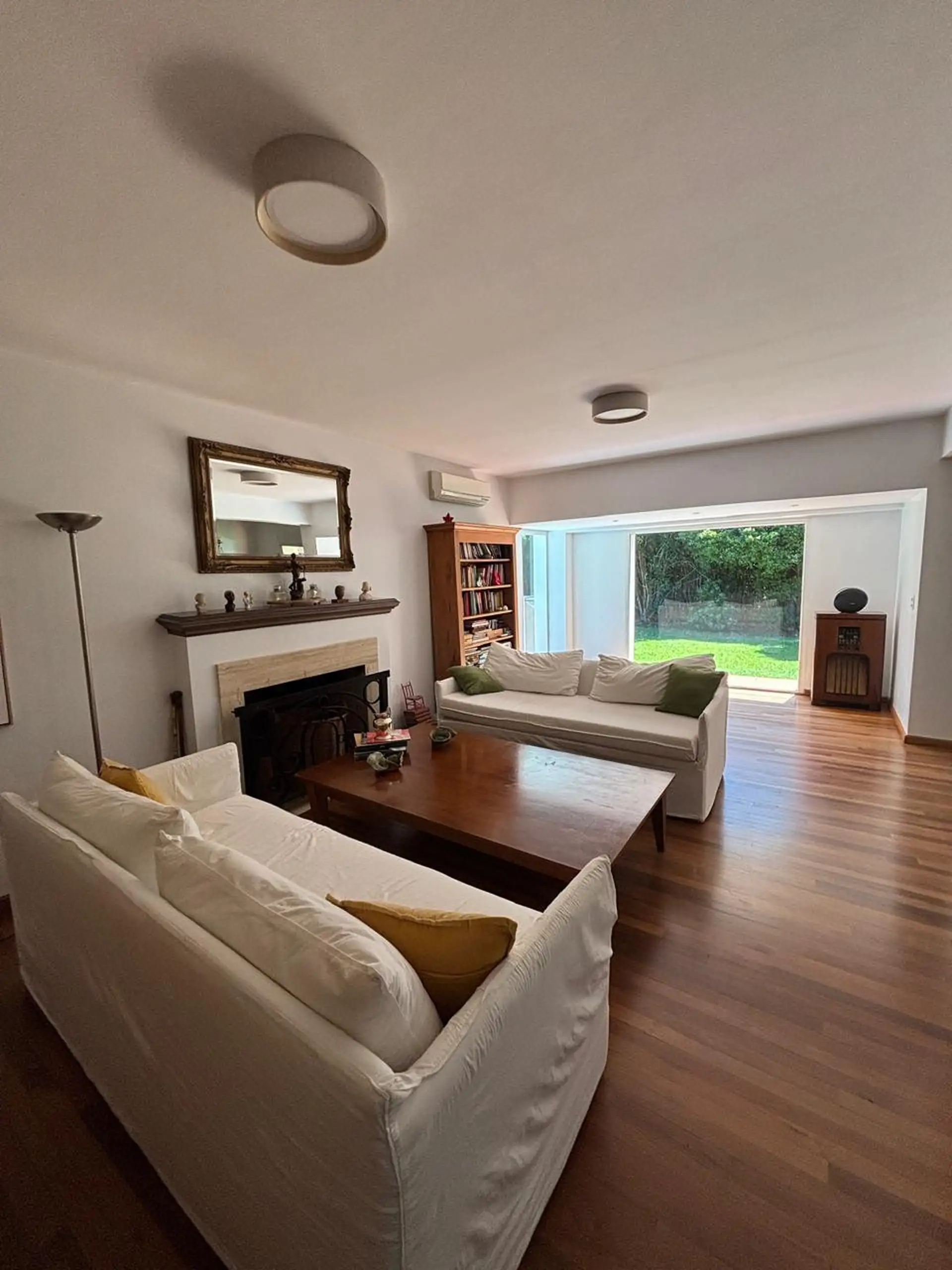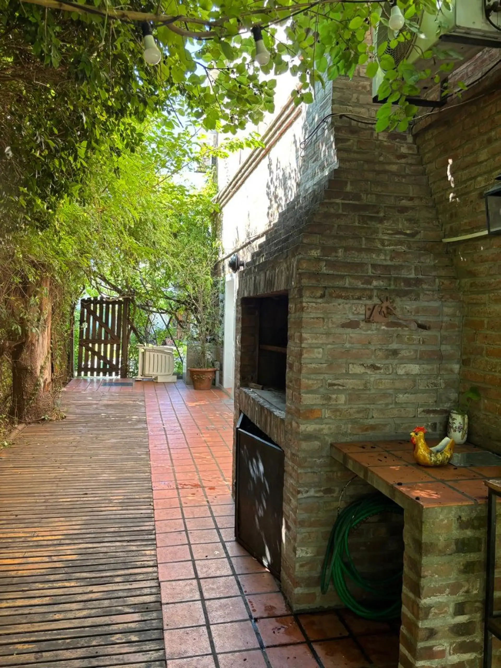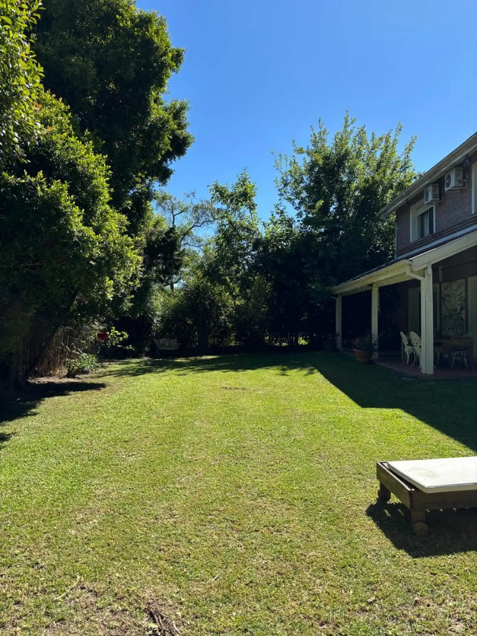 Chalet-style house in the gated community Rincon del Arca, set over 3 storeys. Ground floor has a lapacho floor, fireplace, a reception toilet, an L-shaped living-dining room with air conditioning, a modern kitchen with a daily dining area, access to a gallery and large windows to the garden, plus a full laundry and a service bedroom with a shower bathroom. The first floor includes a distribution hall with a desk and air conditioning, 4 bedrooms (2 en suite) with a main suite featuring a jacuzzi