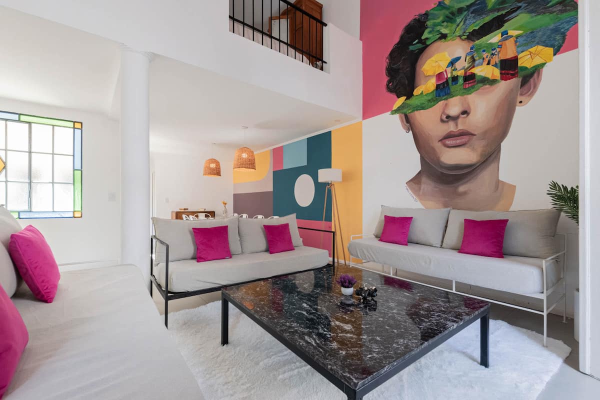 Apartment spread over 3 levels with a living area featuring double-height ceilings. It has 4 bedrooms across the second level and an additional open space that can serve as a playroom, workspace or 4th bedroom, plus 2 full bathrooms and a guest toilet. The third level includes a large terrace with seating and dining space, a minipool and a BBQ.