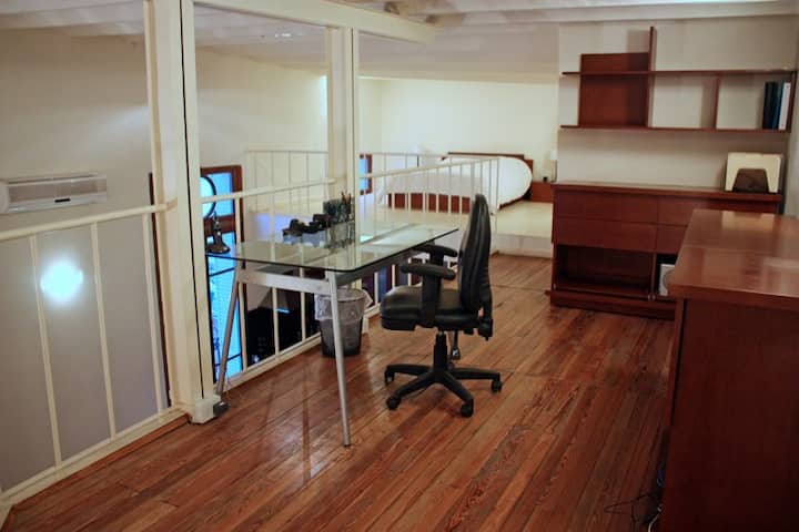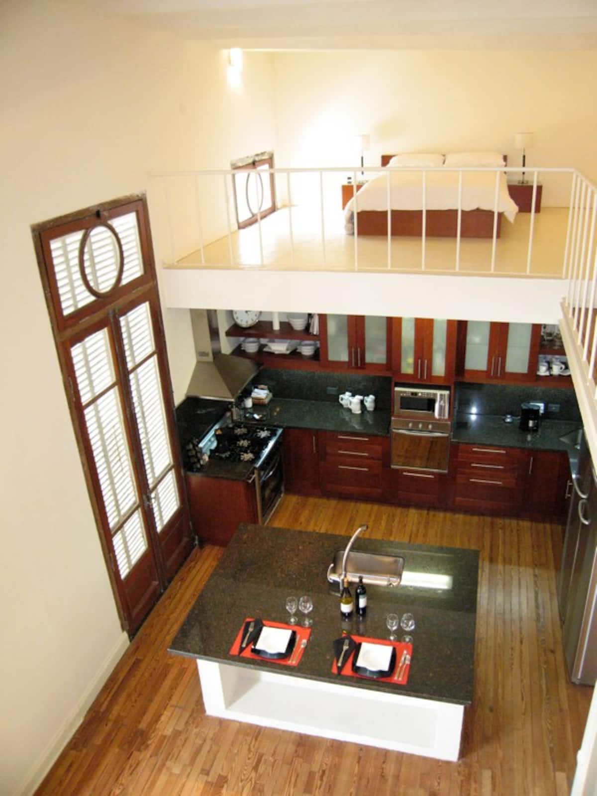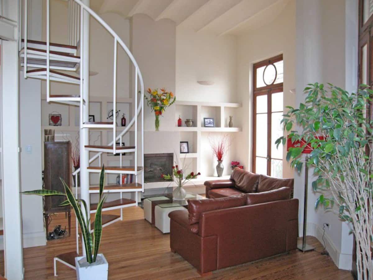 Four-bedroom apartment in San Telmo, reached via stairs only. The unit is on the second floor in a historic building with no lift. Bedroom layout includes two double bedrooms and one queen-size bedroom, each with an en-suite bathroom, plus a loft with two single beds without a bathroom. Guests access the full apartment; access requires two sets of keys, and there is no option to leave a key outside.