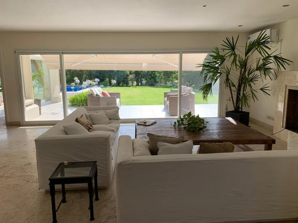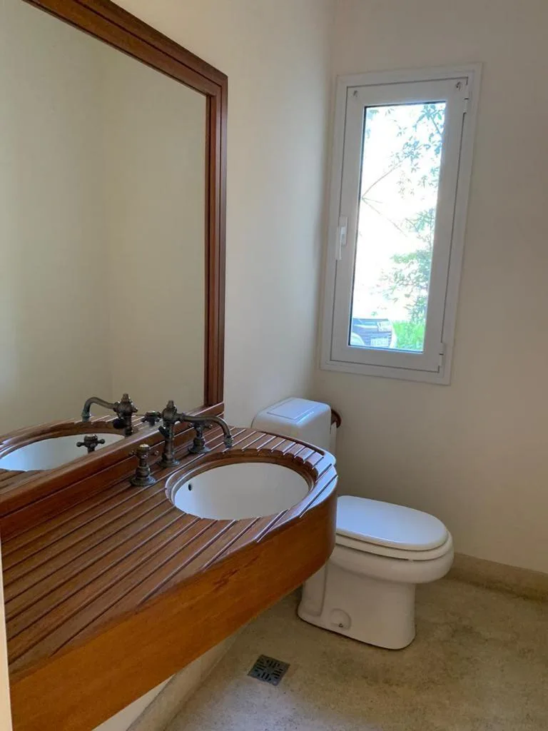 Temporary rental house in La Isla, Nordelta, Tigre. Built on an internal corner lot of 1,180 m², the property is arranged over two floors. On the ground floor there is an entrance hall, living and dining room with fireplace, a guest toilet, entry closet and travertine floors; the primary suite includes a full bathroom with shower and jacuzzi, plus a dressing room. There is a second en-suite bedroom with built-in closets. Features include a large integrated enclosed grill area (quincho), gallery,