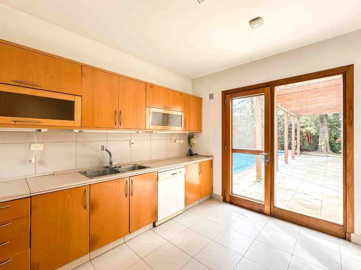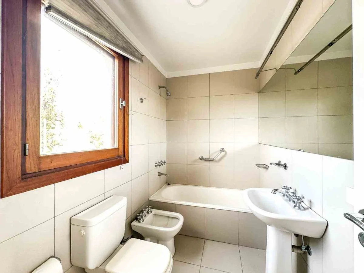House in a gated community within La Colina, Don Torcuato (Tigre, Zona Norte), unfurnished. The ground floor has a large living-dining room with wide windows and access to a deck, a kitchen with storage plus an additional area for a pantry or storage room, a laundry area with independent access, and a service room with a full bathroom. The upper floor includes a main suite with double walk-in closet, full bathroom and sauna (steam/dry), plus a secondary bedroom with full bathroom and air conditi