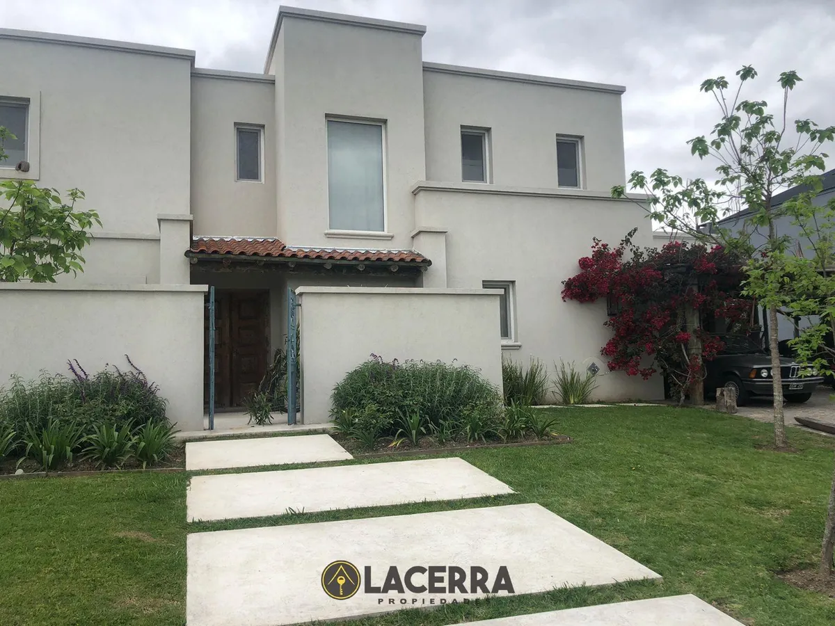 Two-storey house in Barrio Lagos del Norte, Don Torcuato, on a perimeter lot with south orientation. The ground floor has a living room, dining room, playroom with dining area (air conditioning), a guest toilet, kitchen, laundry area and service room. The upper floor has three bedrooms and three bathrooms, with two en suite and air conditioning; the third bedroom has a separate bathroom and a ceiling fan, and the main bedroom includes a dressing room. Outdoor areas include a covered gallery with