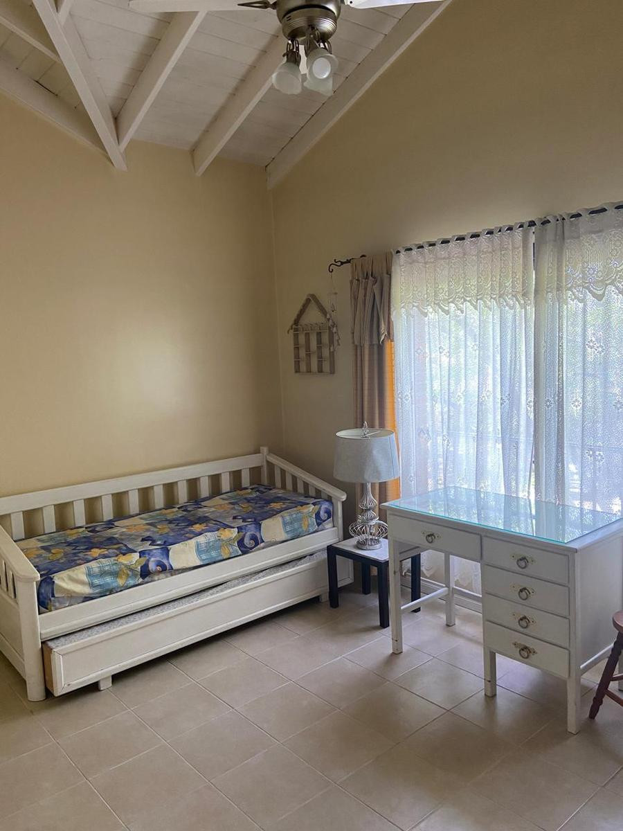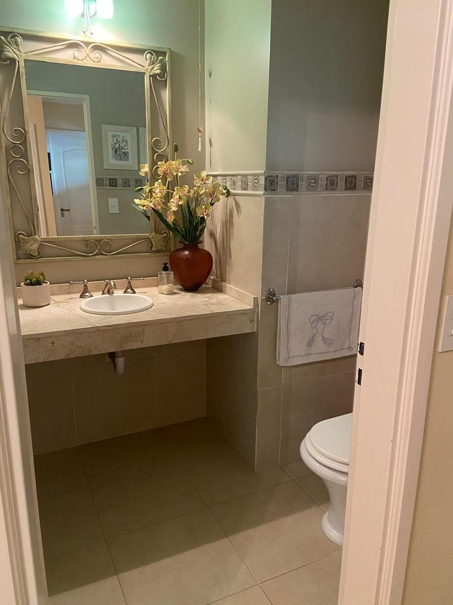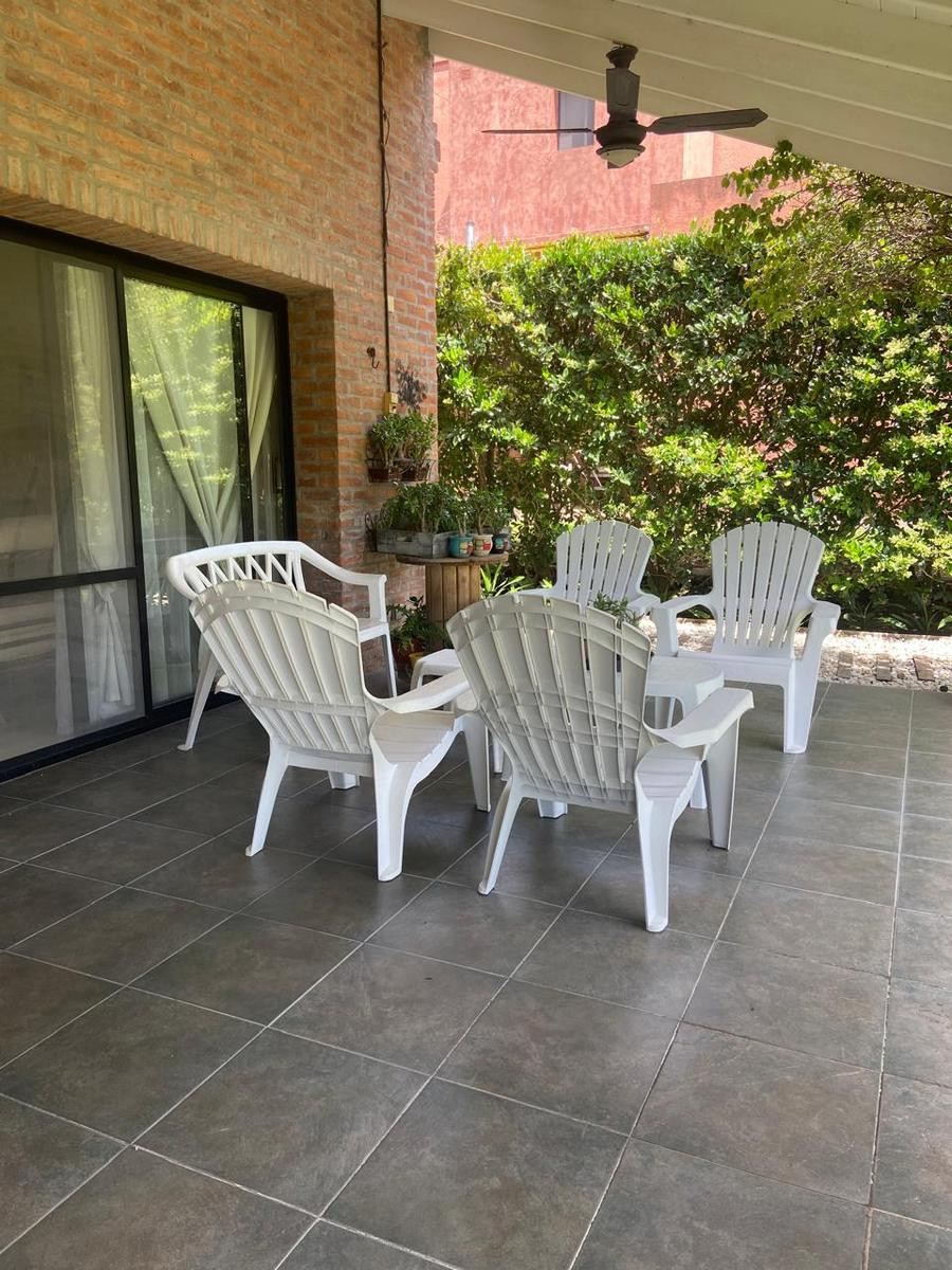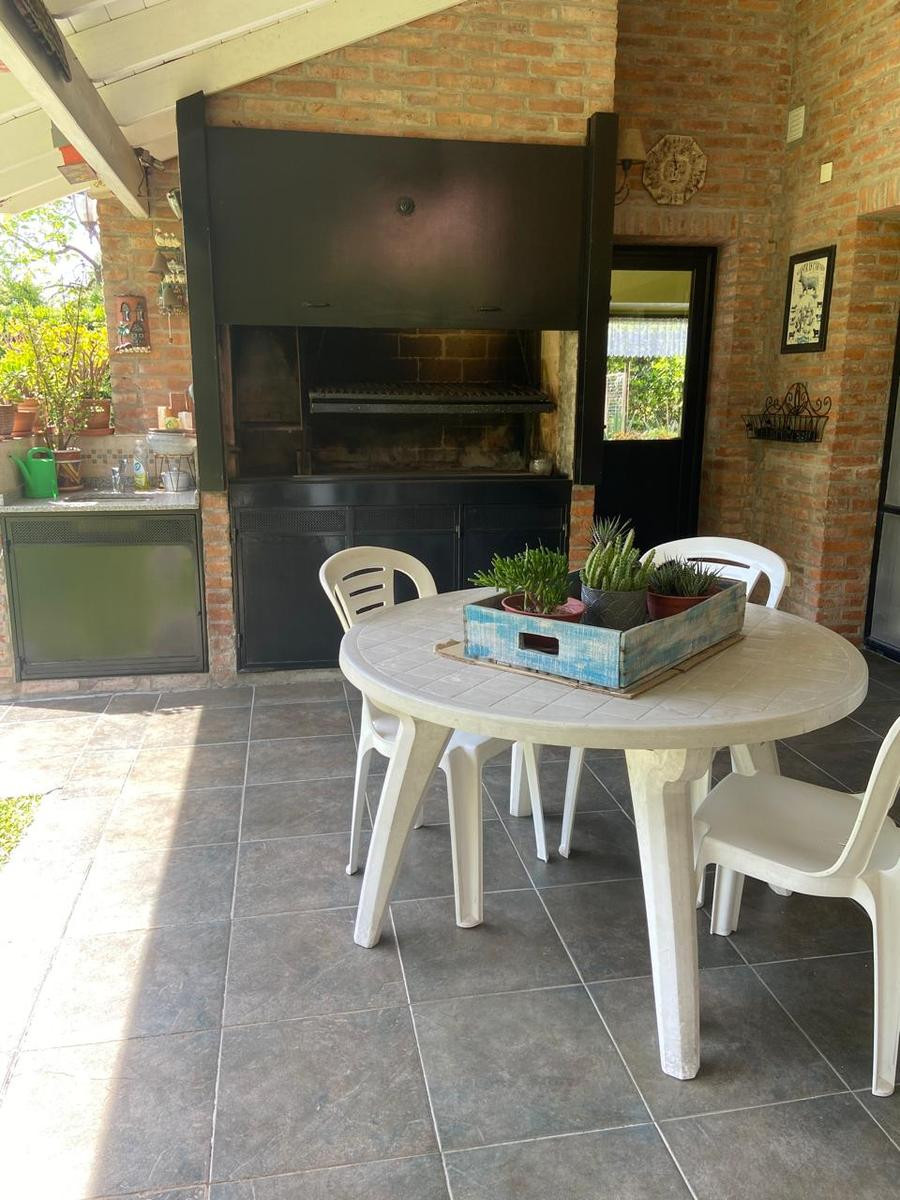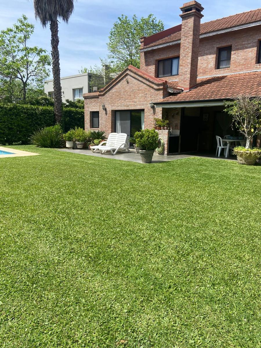 Four-bedroom rental house in Talar del Lago, Tigre, with an outdoor pool, covered grill area and automatic irrigation, plus a large garden with mature trees. The ground floor has a reception hall, a guest toilet, a living room with air conditioning and dining area, a kitchen with a daily dining area and a TV family room, both with air conditioning, and a laundry area with a full bathroom. It also includes two separate fridges and an additional freezer. The upper floor has a suite with air condit