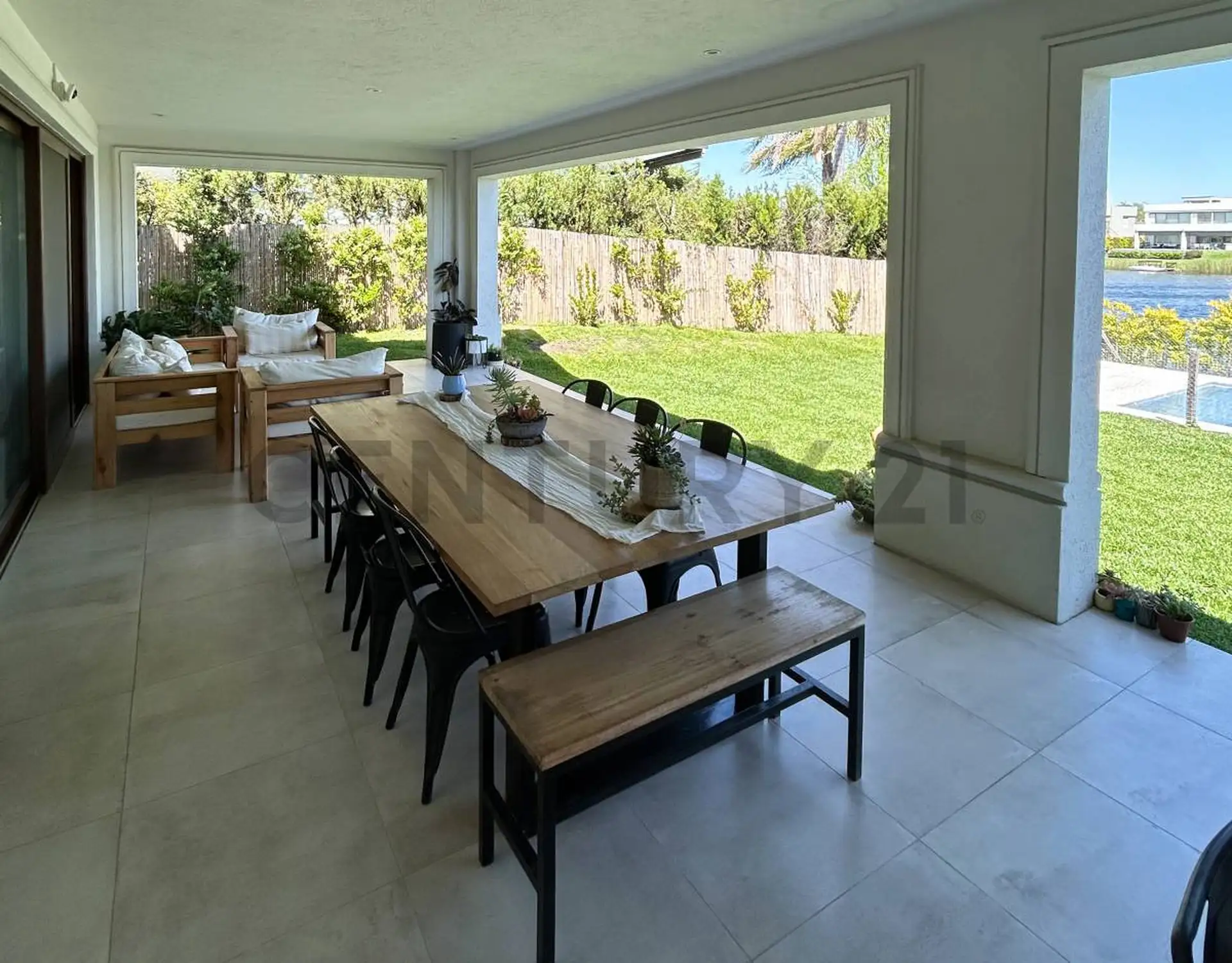 Four-bedroom house for rent in Nordelta Los Lagos, Tigre, set on an 832 m² plot with more than 330 m² covered across three floors. Ground floor comprises a living and dining area with direct access to the gallery, a kitchen with an island and family area, an office or additional bedroom, full service staff quarters, and a gallery with a grill. Upstairs includes a master suite with dressing room and a terrace facing the lagoon, a junior suite, and two semi-suite bedrooms; the third level has a la
