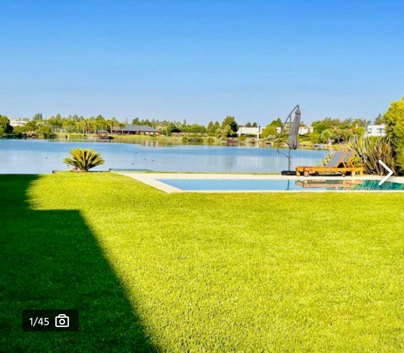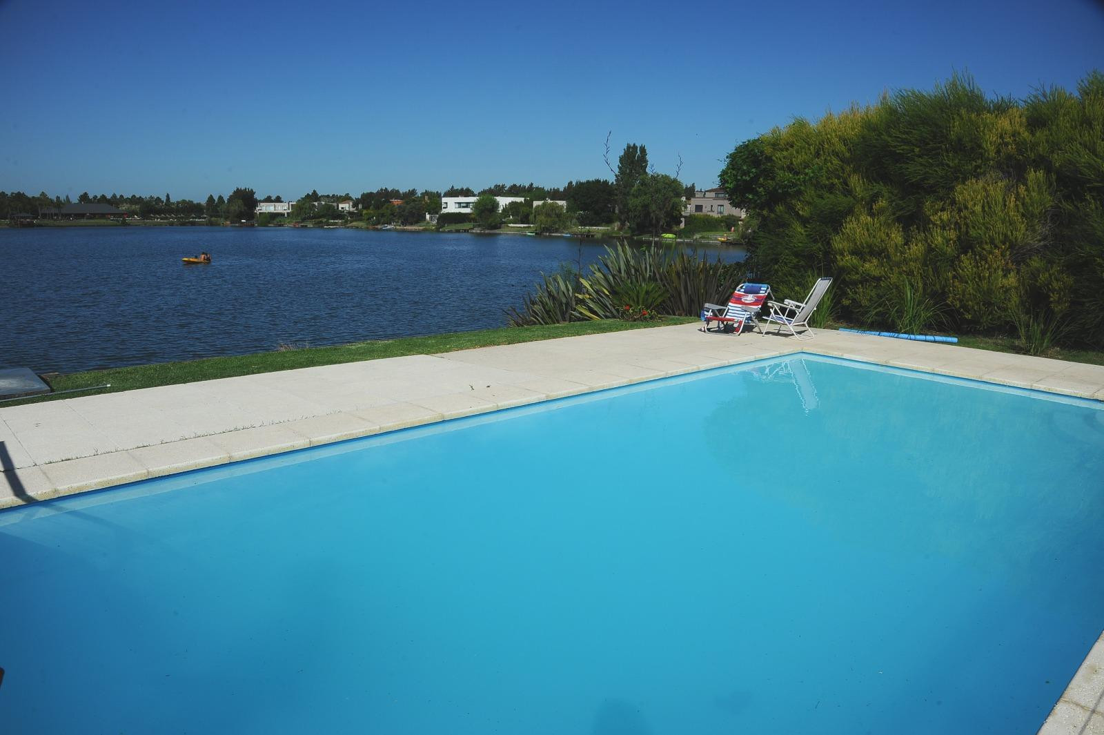 House on the lagoon in Talar del Lago 2, Tigre. It has 4 bedrooms, 2 of them en suite, and 3 full bathrooms plus a guest toilet. There is also a service unit. The garden includes a pool and open views of the lagoon, and the home can be rented unfurnished or semi-furnished.