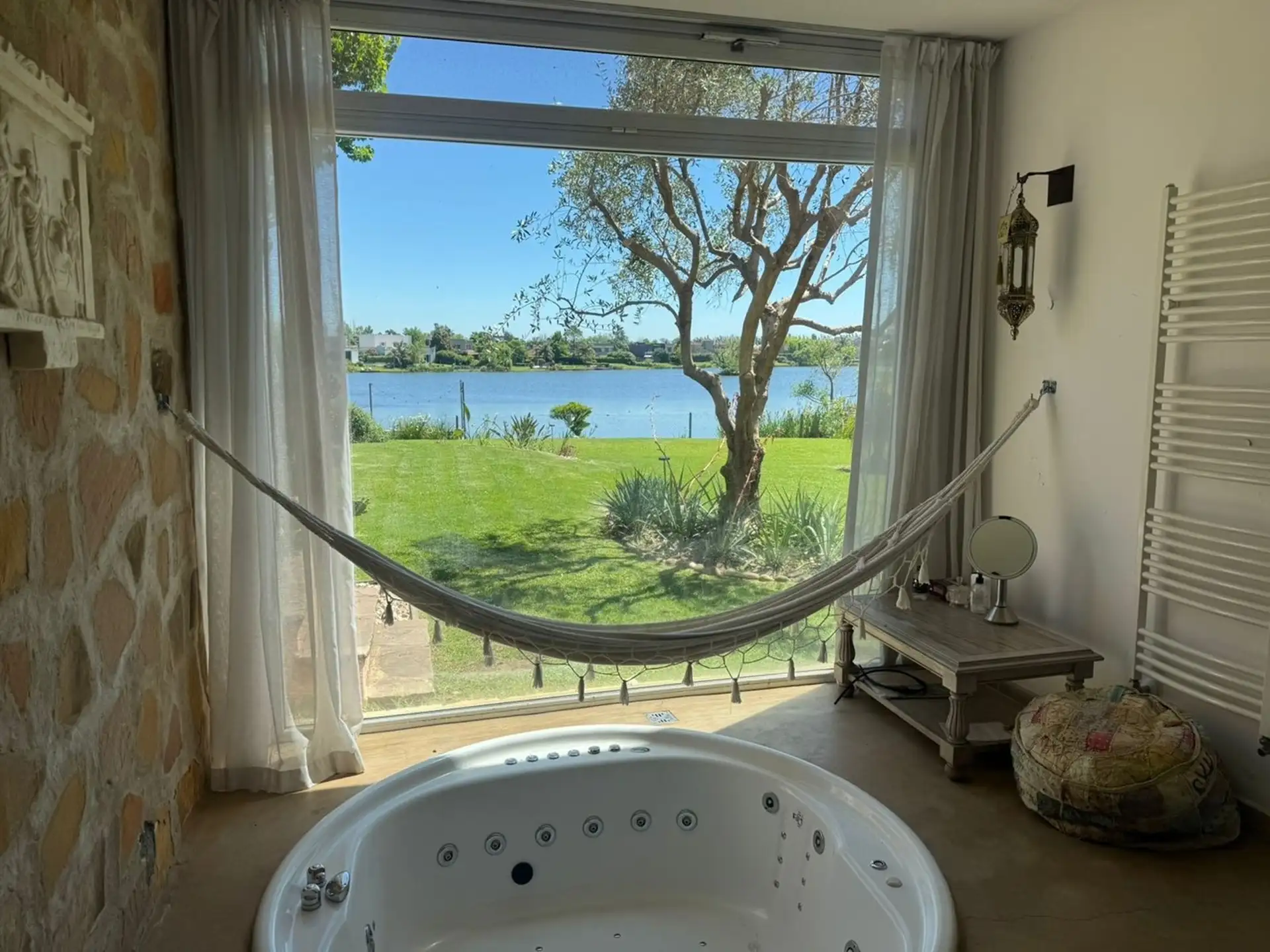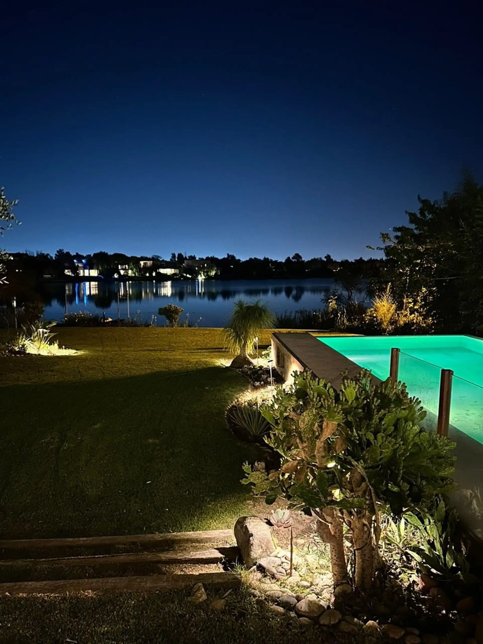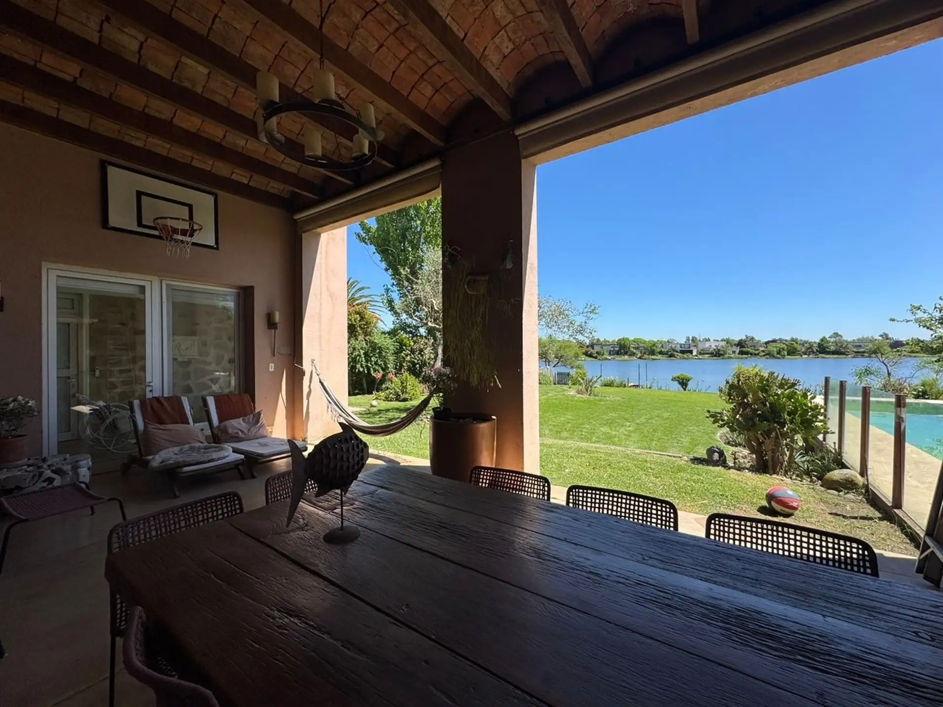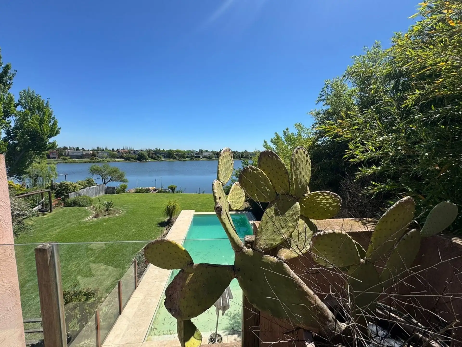 Short-term rental house in Talar del Lago 1, Tigre, 481 m² covered on a 1,000 m² lot. West-facing with direct lake views. The ground floor has a living-dining room with a fireplace and floor-to-ceiling windows opening to the garden and lake, a separate equipped kitchen with a breakfast area, a main bedroom en suite with a jacuzzi facing the lagoon, an exterior bathroom for the pool, and a service staff room with a bathroom. The upper floor includes 2 bedrooms sharing a full bathroom and a playro