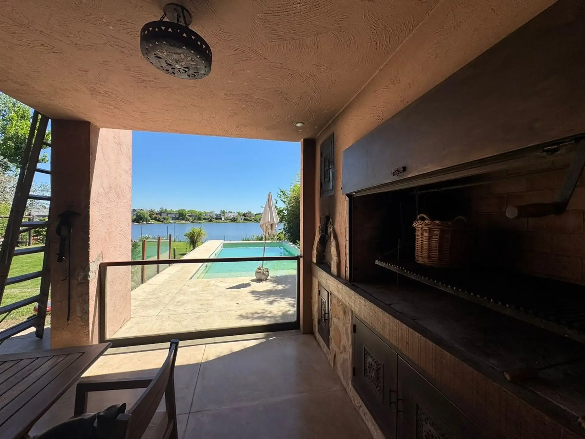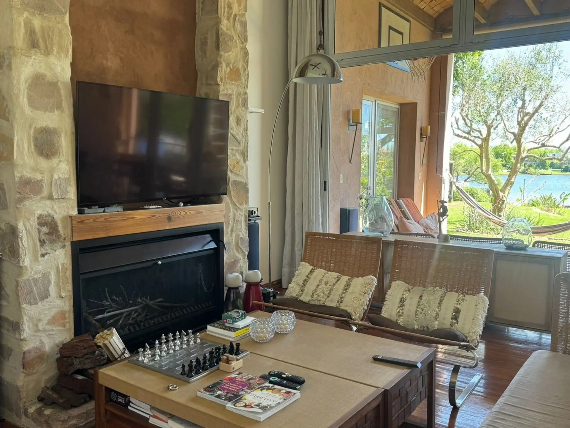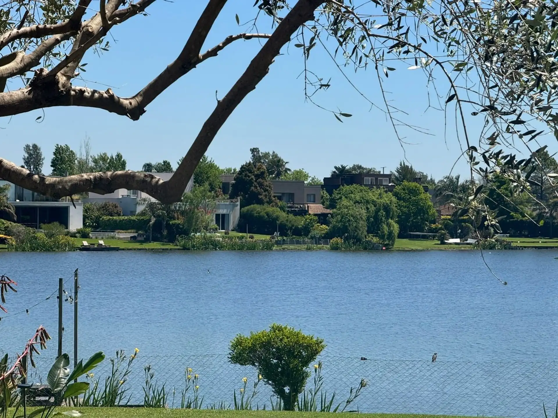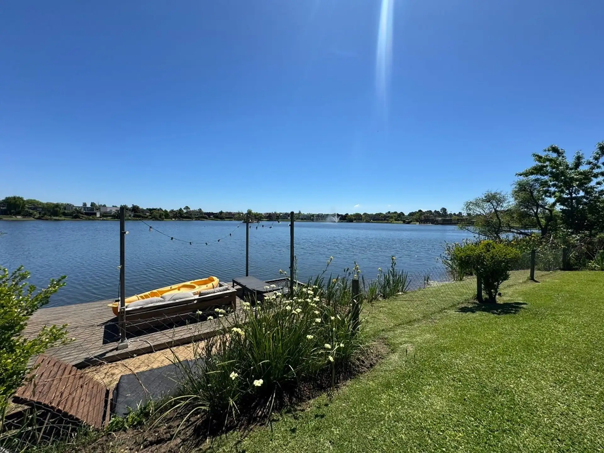Short-term rental house in Talar del Lago 1, Tigre, 481 m² covered on a 1,000 m² lot. West-facing with direct lake views. The ground floor has a living-dining room with a fireplace and floor-to-ceiling windows opening to the garden and lake, a separate equipped kitchen with a breakfast area, a main bedroom en suite with a jacuzzi facing the lagoon, an exterior bathroom for the pool, and a service staff room with a bathroom. The upper floor includes 2 bedrooms sharing a full bathroom and a playro