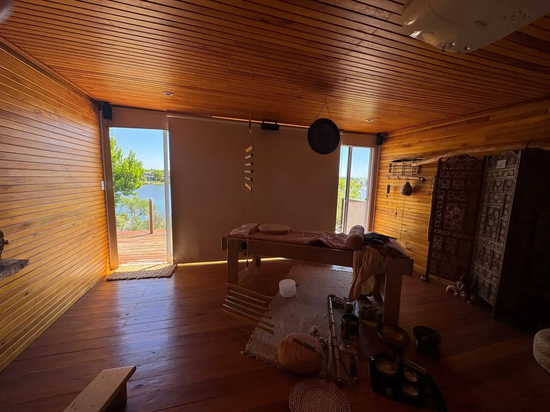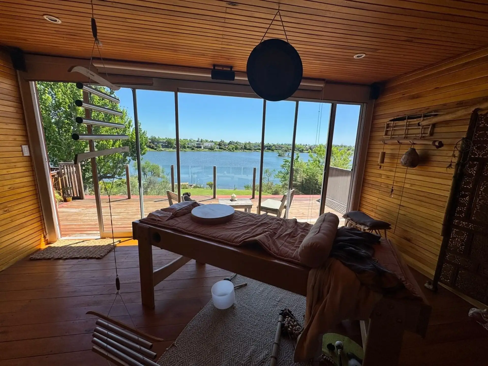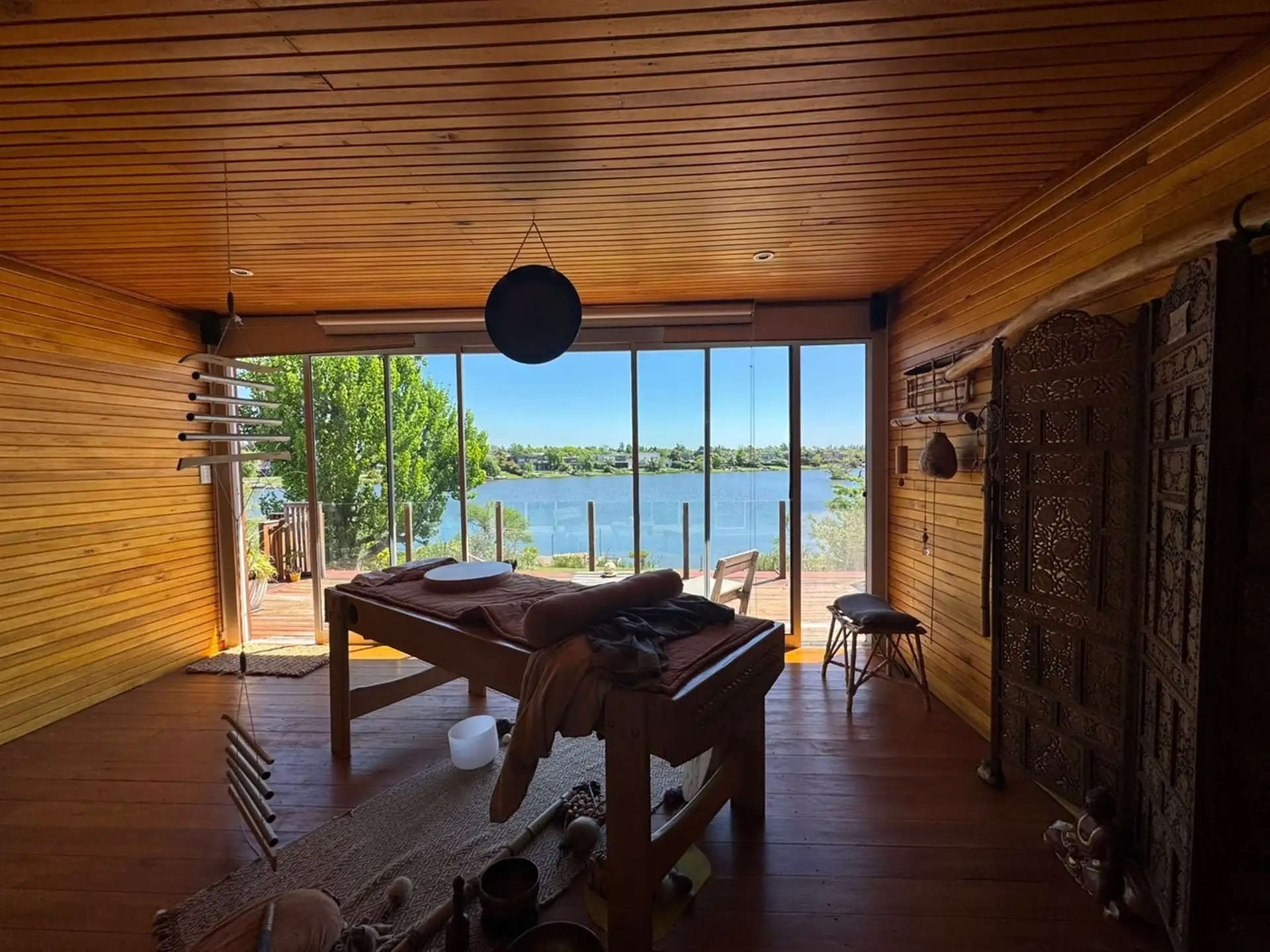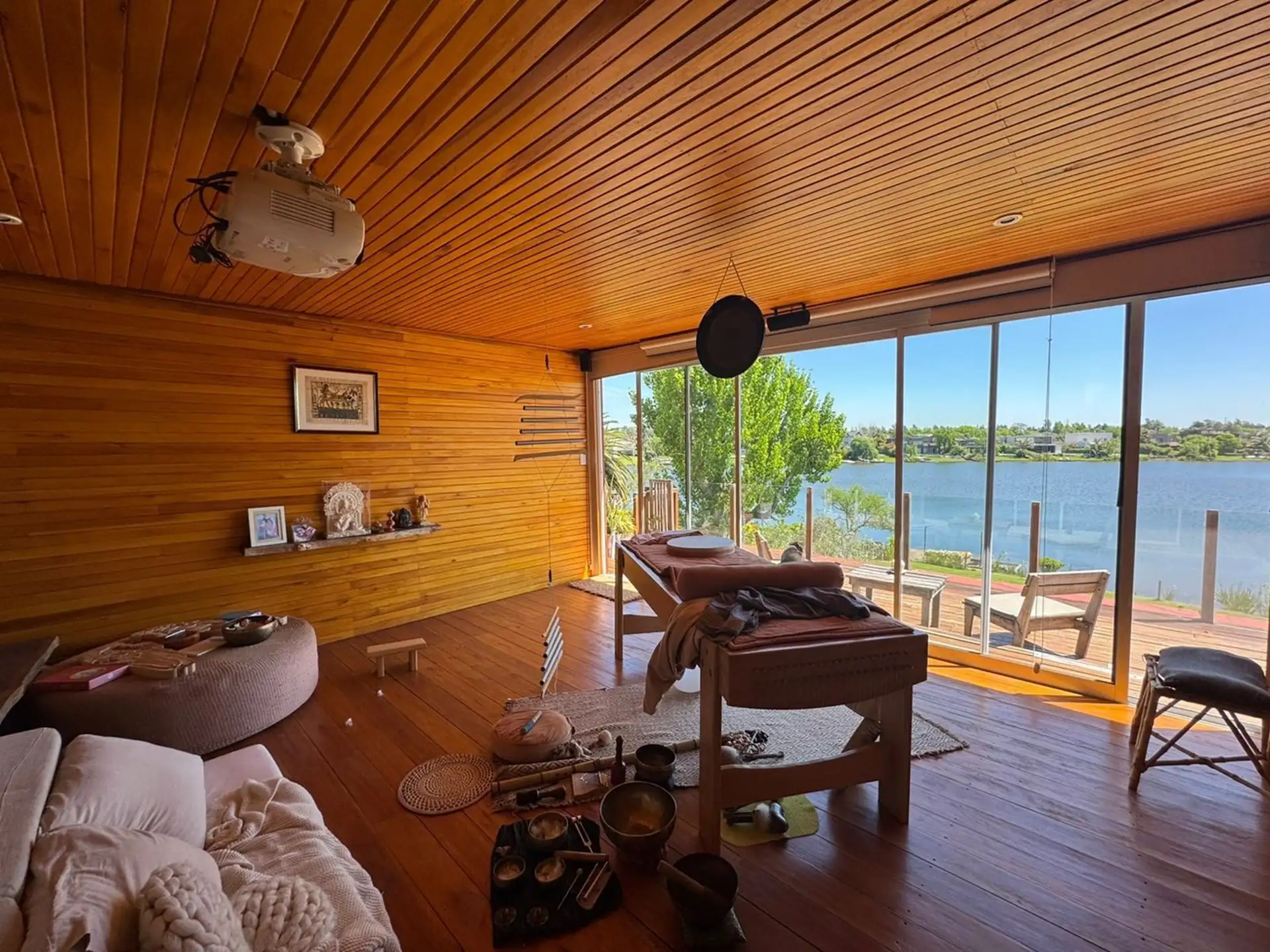 Short-term rental house in Talar del Lago 1, Tigre, 481 m² covered on a 1,000 m² lot. West-facing with direct lake views. The ground floor has a living-dining room with a fireplace and floor-to-ceiling windows opening to the garden and lake, a separate equipped kitchen with a breakfast area, a main bedroom en suite with a jacuzzi facing the lagoon, an exterior bathroom for the pool, and a service staff room with a bathroom. The upper floor includes 2 bedrooms sharing a full bathroom and a playro